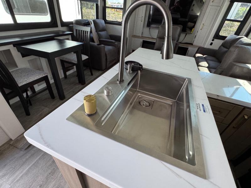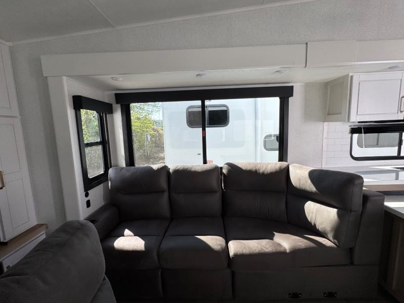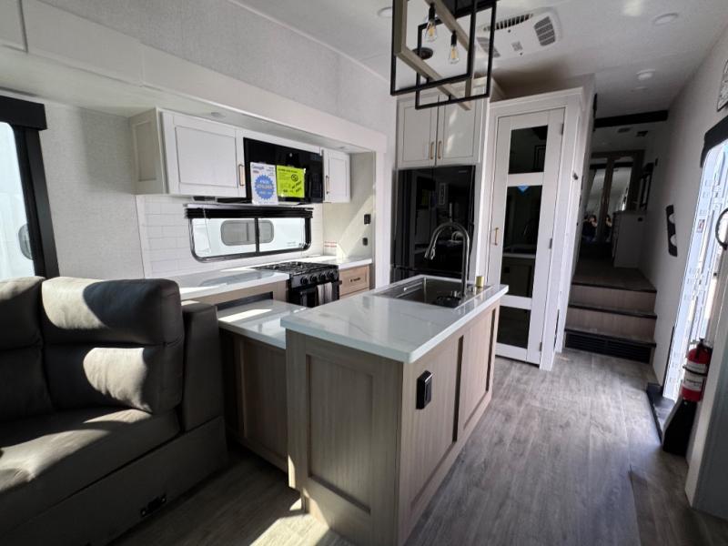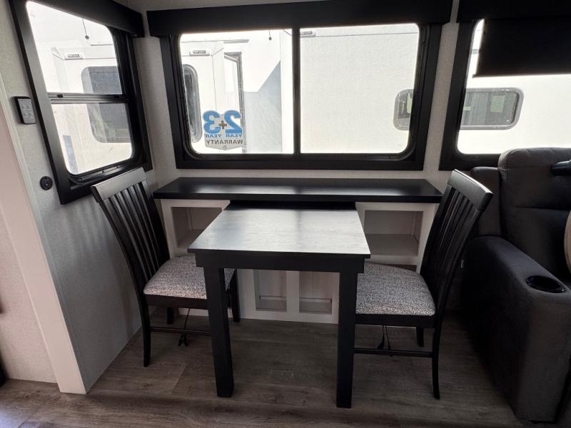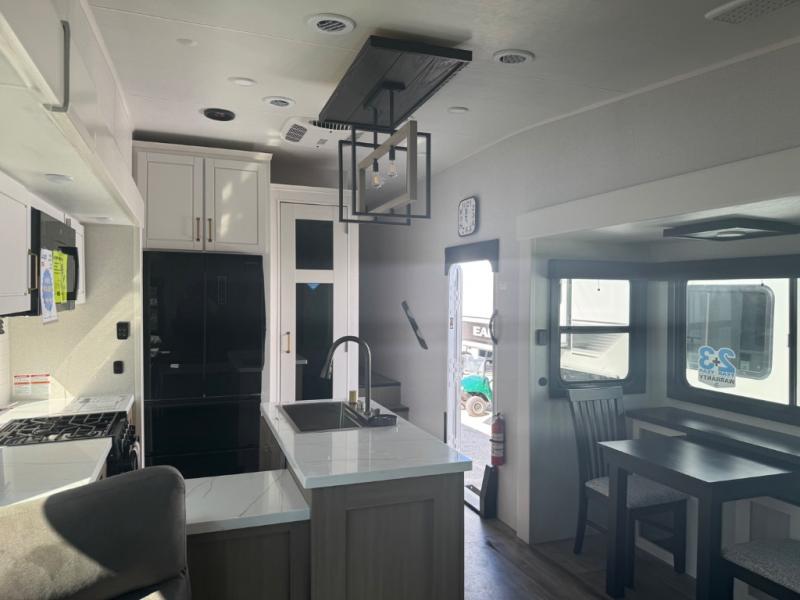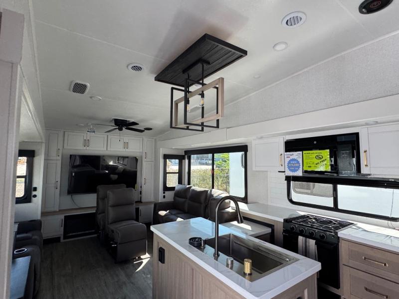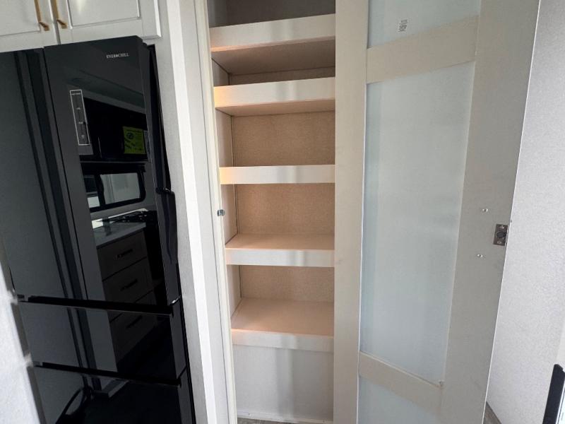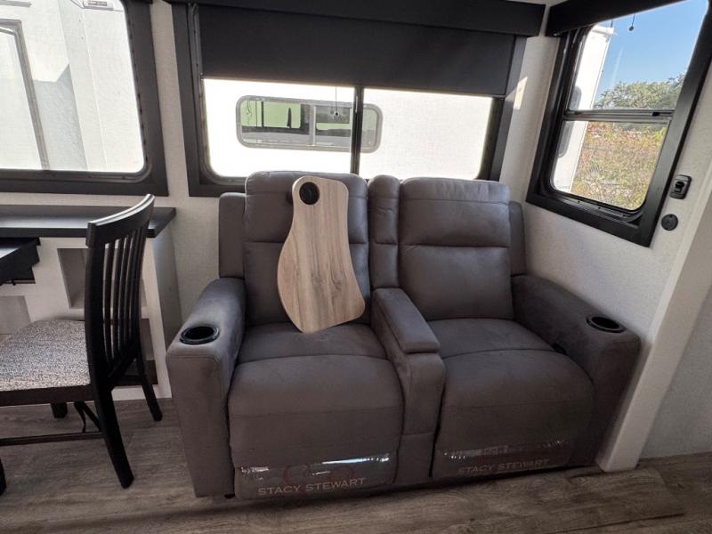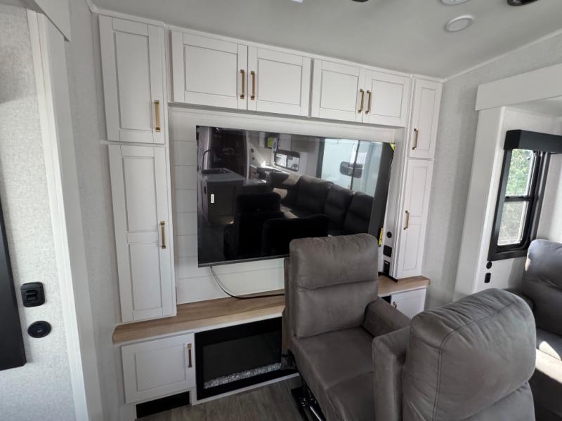 It will be so easy to enjoy time in this spacious fifth wheel! The rear living area includes an entertainment center with a fireplace across from the L-shaped sofa for movie nights. There is also a theater sofa with cup holders plus a roll-top dinette with two chairs to dine at. The chef of your group will love the generous counter space in the middle kitchen, and there is a large pantry to keep food stocked. Heading up front, you'll find the spacious bathroom that includes a shower with a seat, and the front private bedroom with a king bed slide out. There is also a chest with a TV, front shelves with drawers, plus washer and dryer prep!