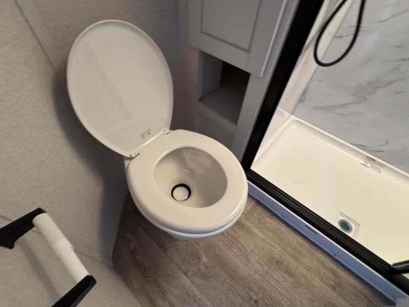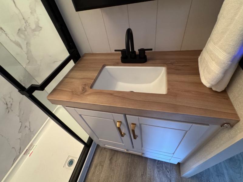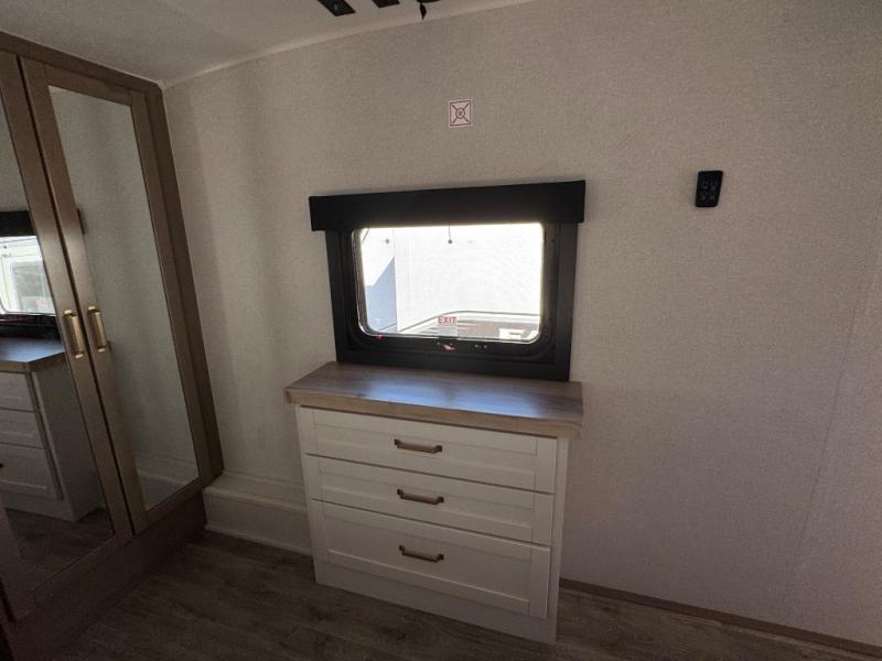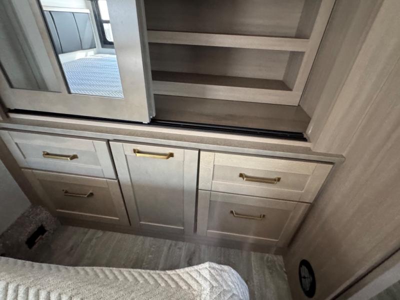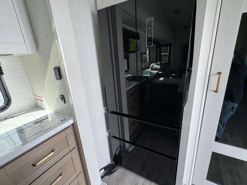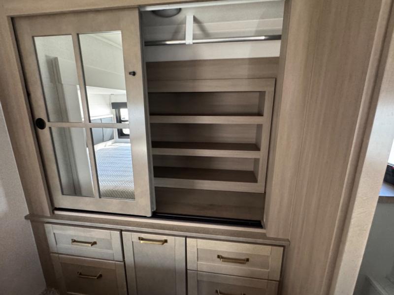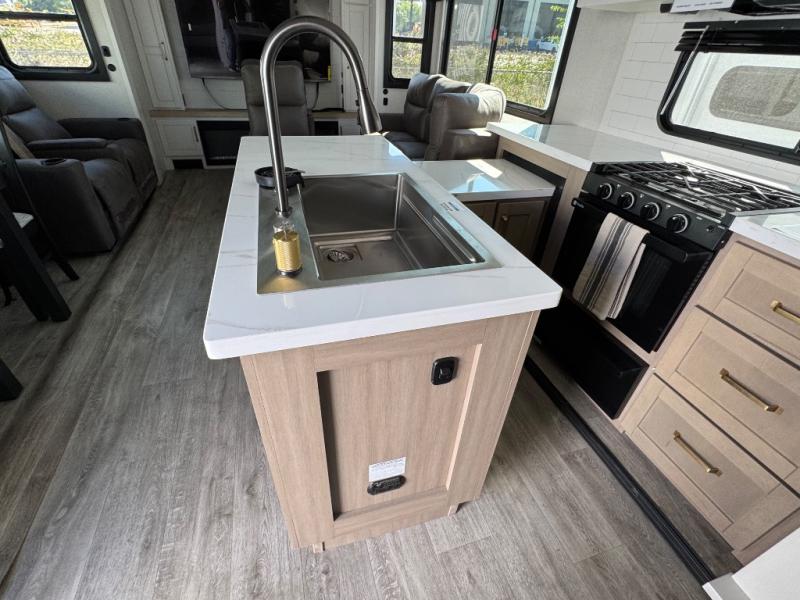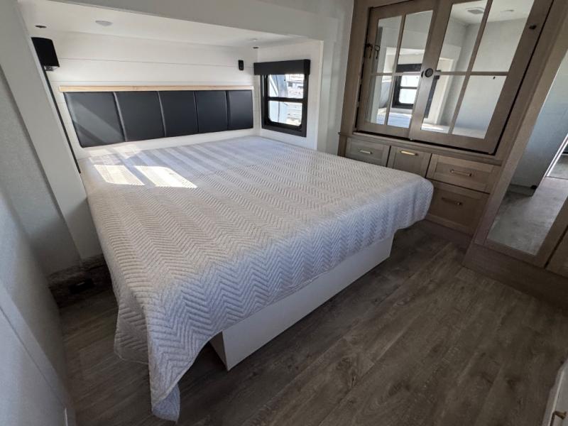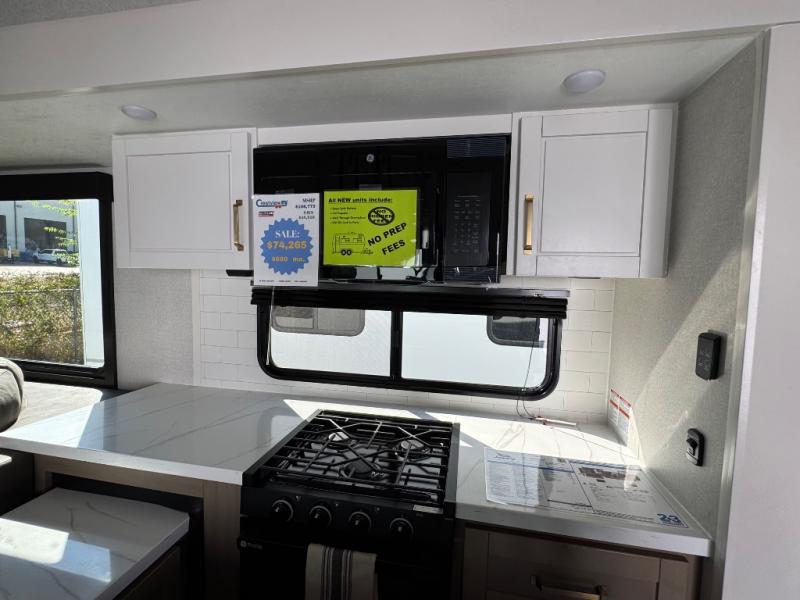 It will be so easy to enjoy time in this spacious fifth wheel! The rear living area includes an entertainment center with a fireplace across from the L-shaped sofa for movie nights. There is also a theater sofa with cup holders plus a roll-top dinette with two chairs to dine at. The chef of your group will love the generous counter space in the middle kitchen, and there is a large pantry to keep food stocked. Heading up front, you'll find the spacious bathroom that includes a shower with a seat, and the front private bedroom with a king bed slide out. There is also a chest with a TV, front shelves with drawers, plus washer and dryer prep!