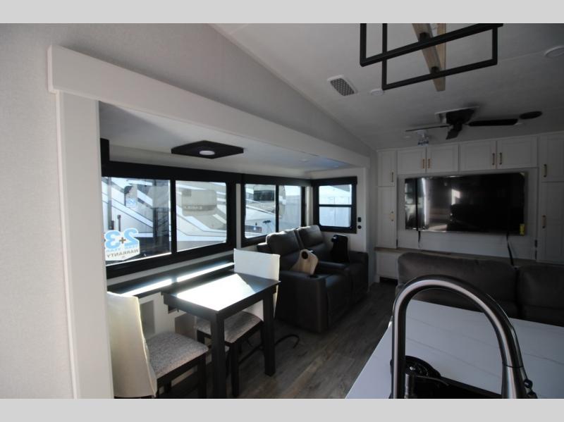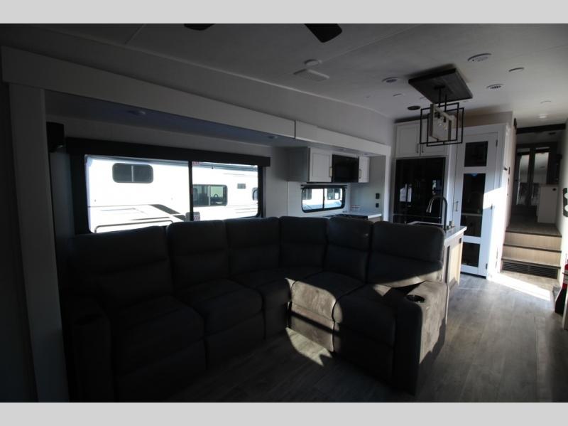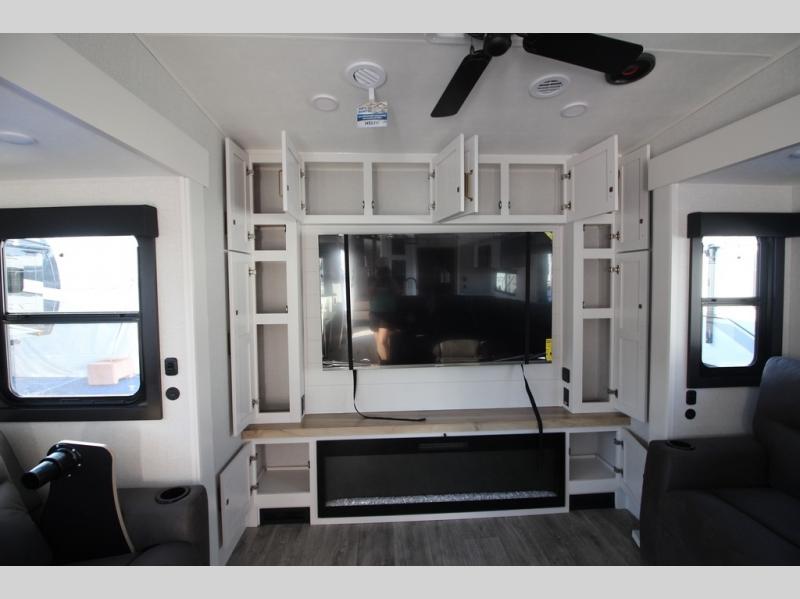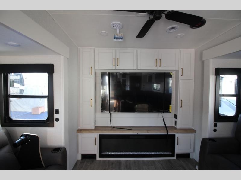 It will be so easy to enjoy time in this spacious fifth wheel! The rear living area includes an entertainment center with a fireplace across from the L-shaped sofa for movie nights. There is also a theater sofa with cup holders plus a roll-top dinette with two chairs to dine at. The chef of your group will love the generous counter space in the middle kitchen, and there is a large pantry to keep food stocked. Heading up front, you'll find the spacious bathroom that includes a shower with a seat, and the front private bedroom with a king bed slide out. There is also a chest with a TV, front shelves with drawers, plus washer and dryer prep!