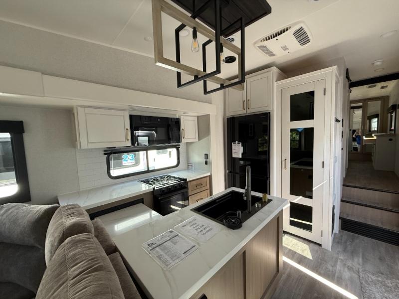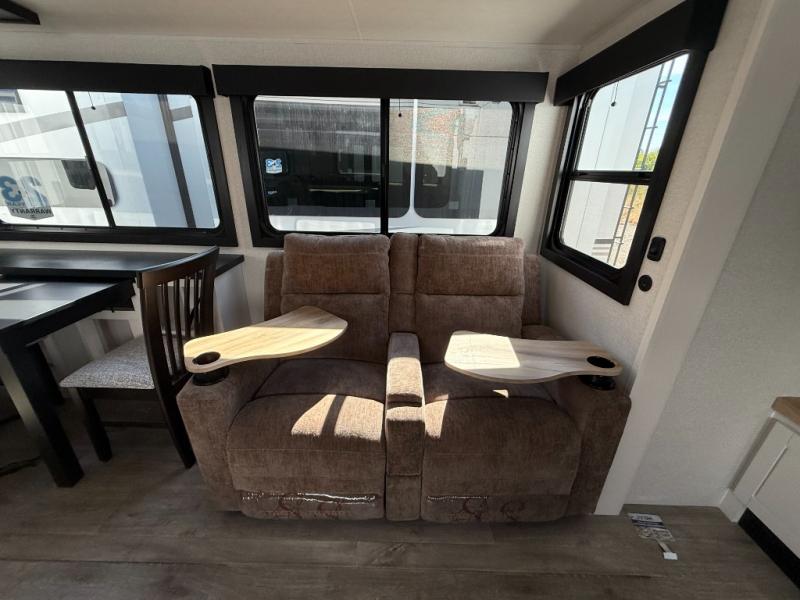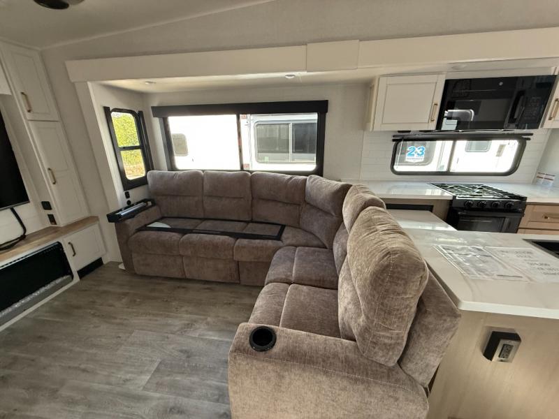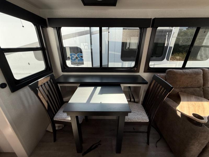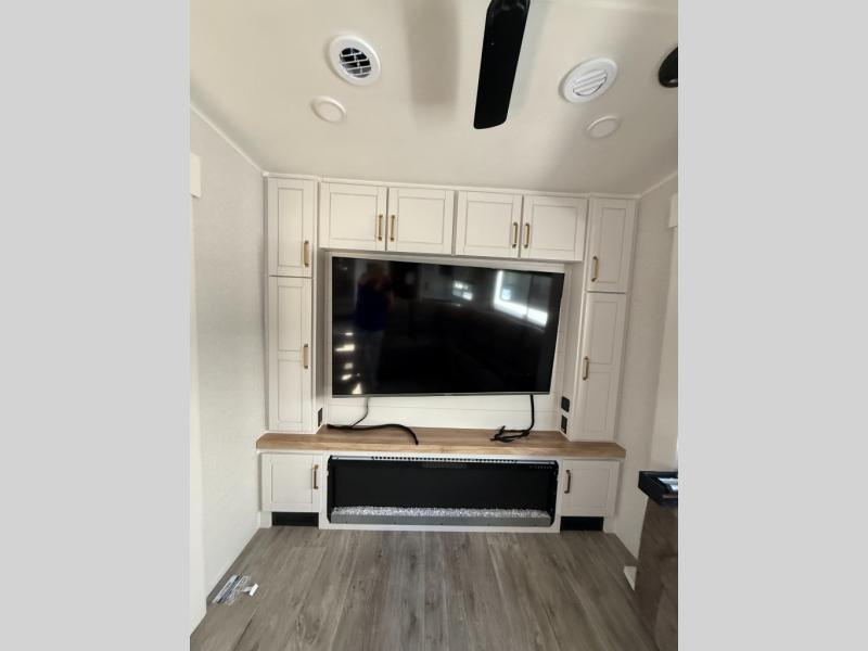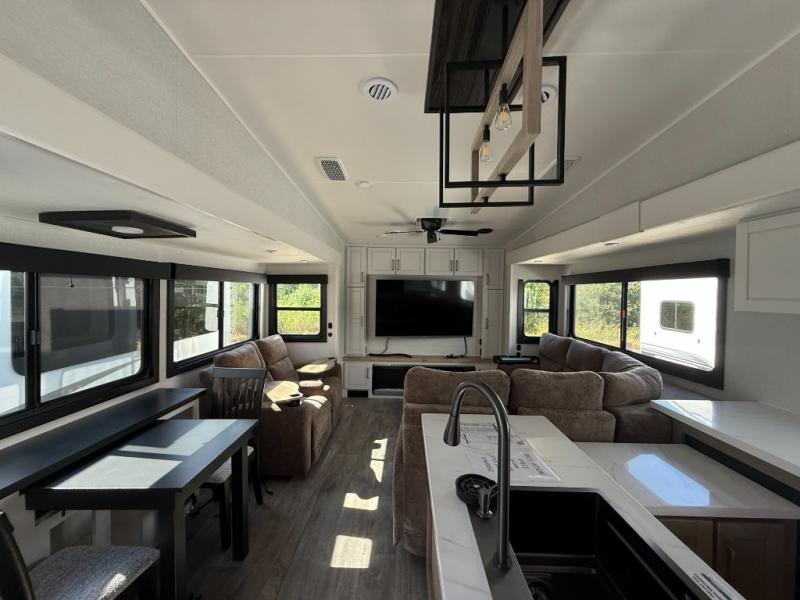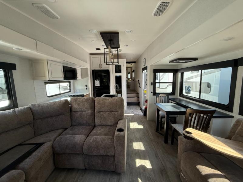 It will be so easy to enjoy time in this spacious fifth wheel! The rear living area includes an entertainment center with a fireplace across from the L-shaped sofa for movie nights. There is also a theater sofa with cup holders plus a roll-top dinette with two chairs to dine at. The chef of your group will love the generous counter space in the middle kitchen, and there is a large pantry to keep food stocked. Heading up front, you'll find the spacious bathroom that includes a shower with a seat, and the front private bedroom with a king bed slide out. There is also a chest with a TV, front shelves with drawers, plus washer and dryer prep!