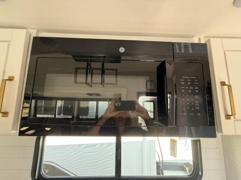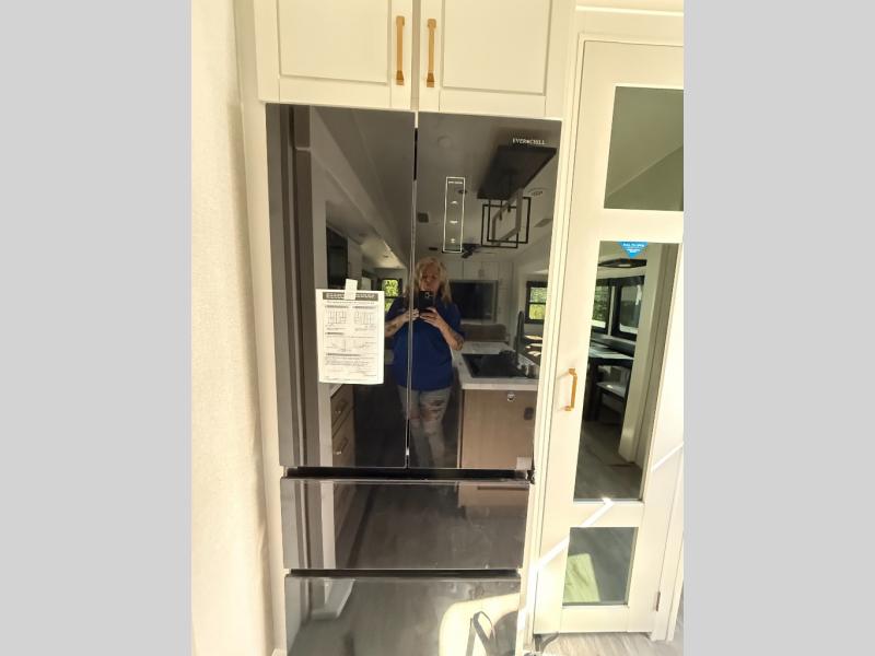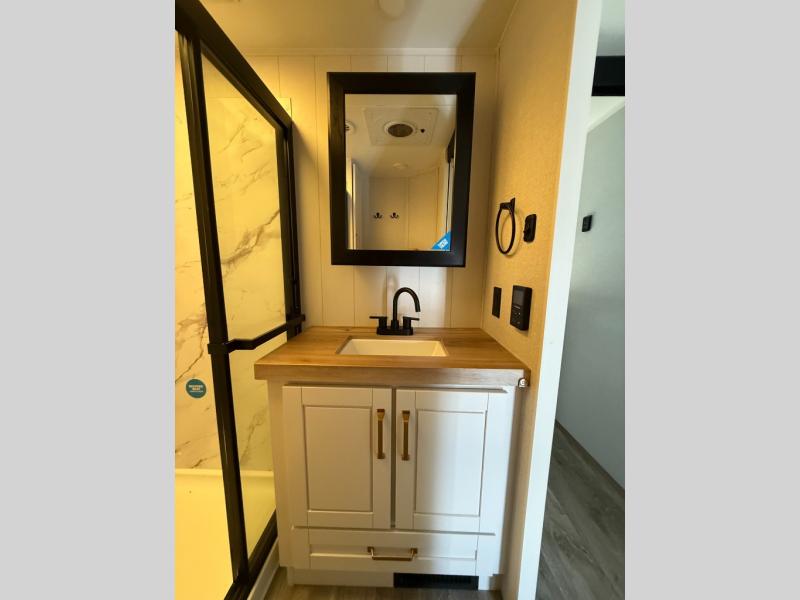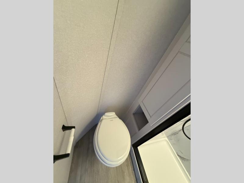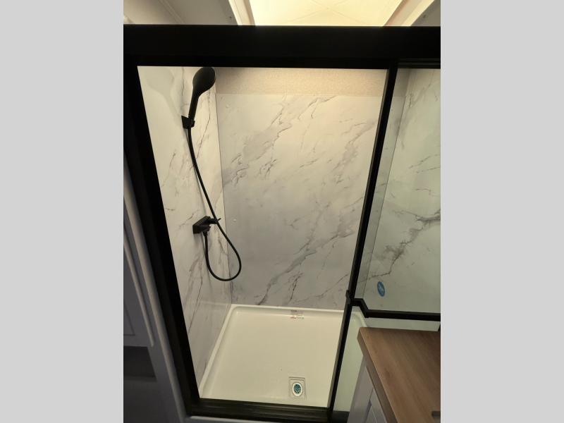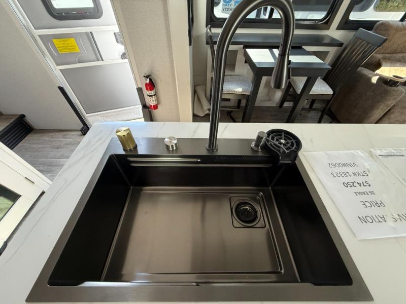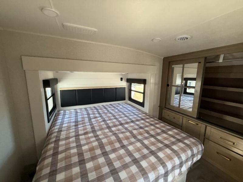 It will be so easy to enjoy time in this spacious fifth wheel! The rear living area includes an entertainment center with a fireplace across from the L-shaped sofa for movie nights. There is also a theater sofa with cup holders plus a roll-top dinette with two chairs to dine at. The chef of your group will love the generous counter space in the middle kitchen, and there is a large pantry to keep food stocked. Heading up front, you'll find the spacious bathroom that includes a shower with a seat, and the front private bedroom with a king bed slide out. There is also a chest with a TV, front shelves with drawers, plus washer and dryer prep!