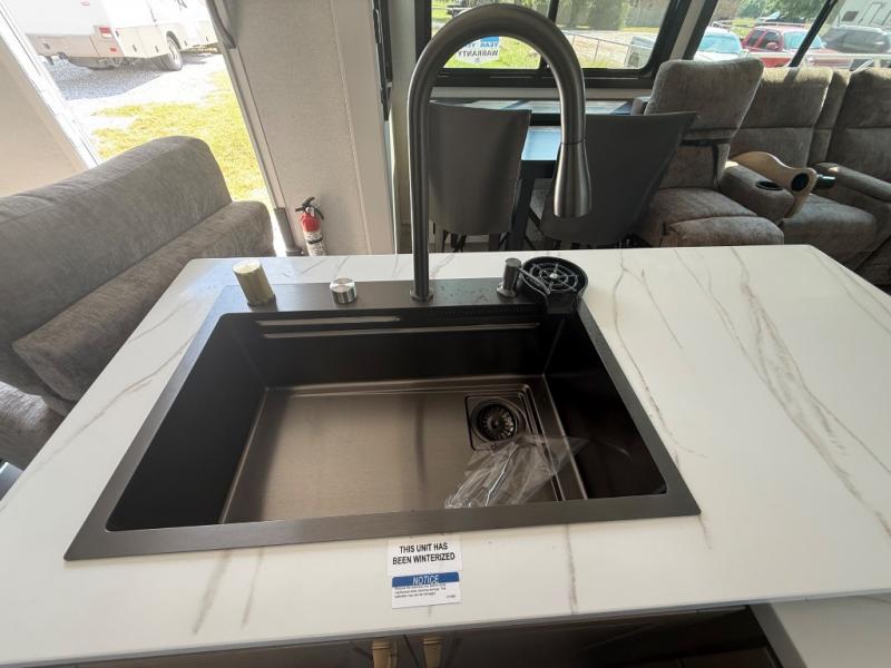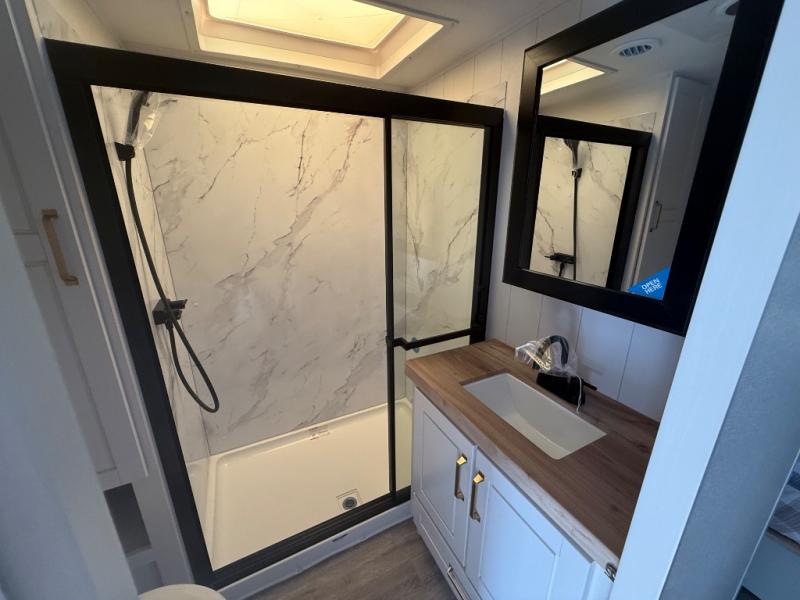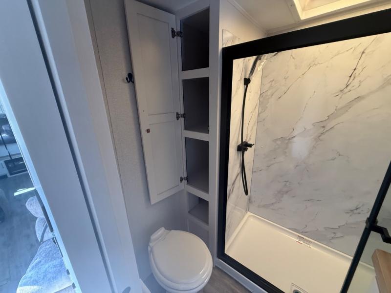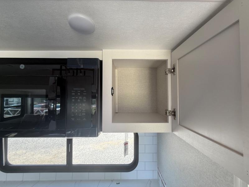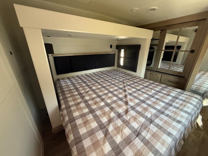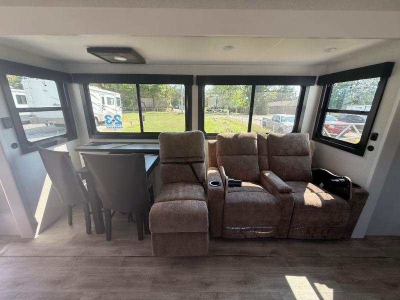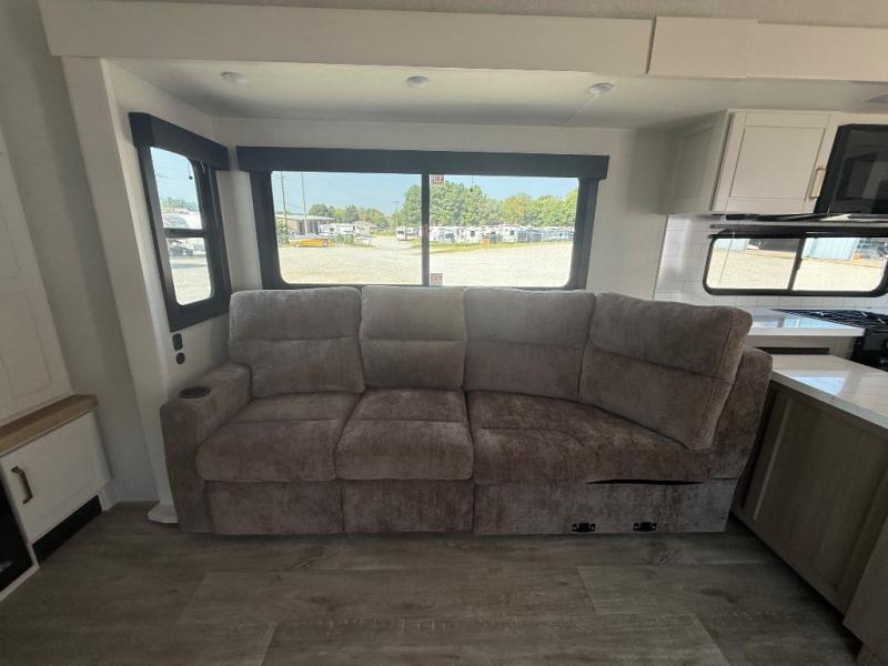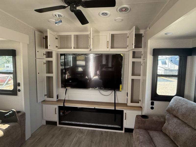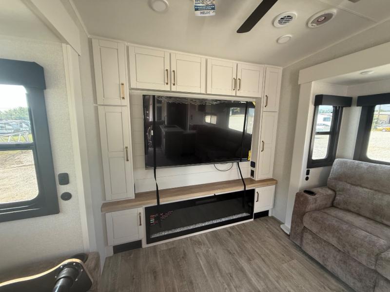It will be so easy to enjoy time in this spacious fifth wheel! The rear living area includes an entertainment center with a fireplace across from the L-shaped sofa for movie nights. There is also a theater sofa with cup holders plus a roll-top dinette with two chairs to dine at. The chef of your group will love the generous counter space in the middle kitchen, and there is a large pantry to keep food stocked. Heading up front, you'll find the spacious bathroom that includes a shower with a seat, and the front private bedroom with a king bed slide out. There is also a chest with a TV, front shelves with drawers, plus washer and dryer prep!