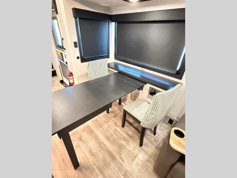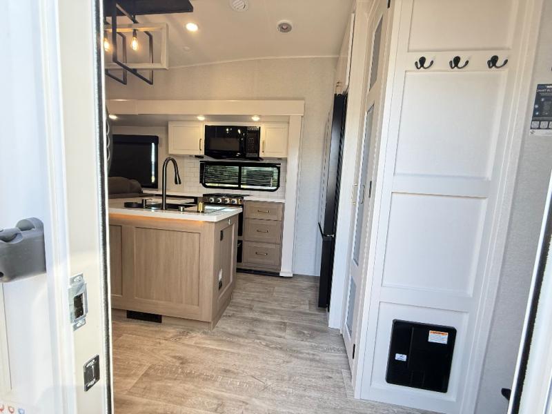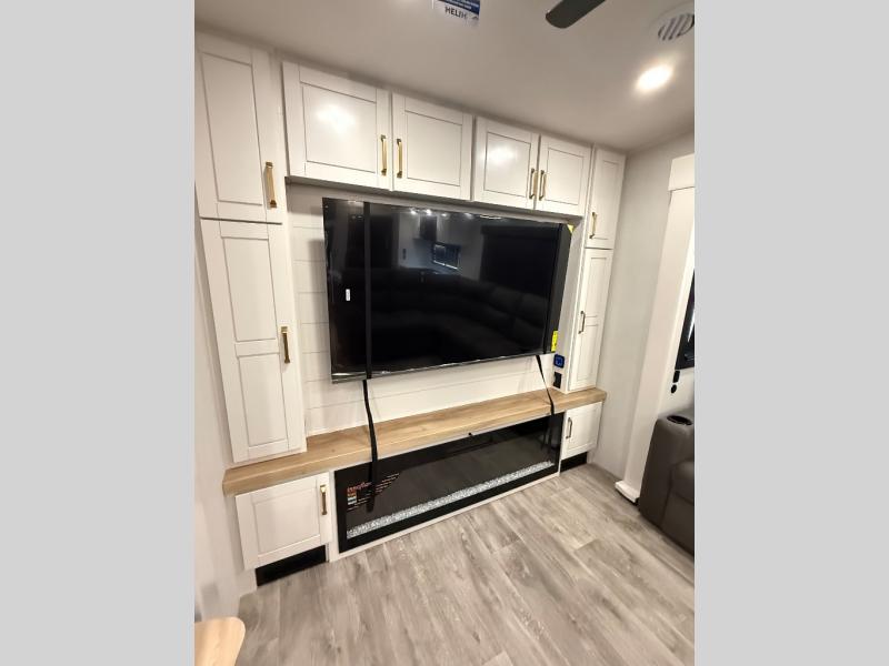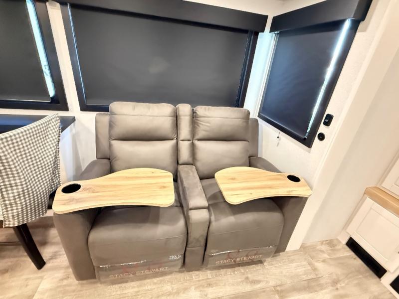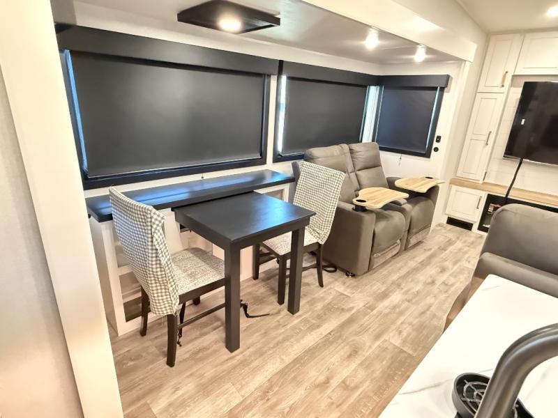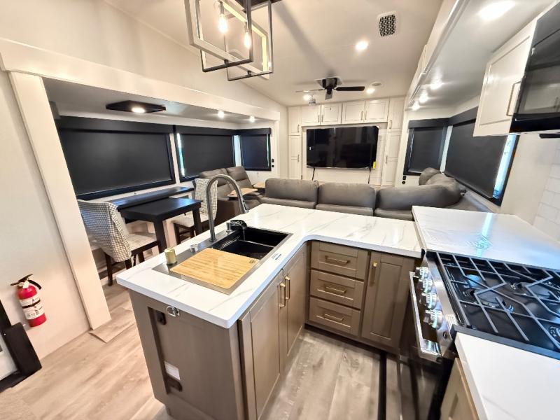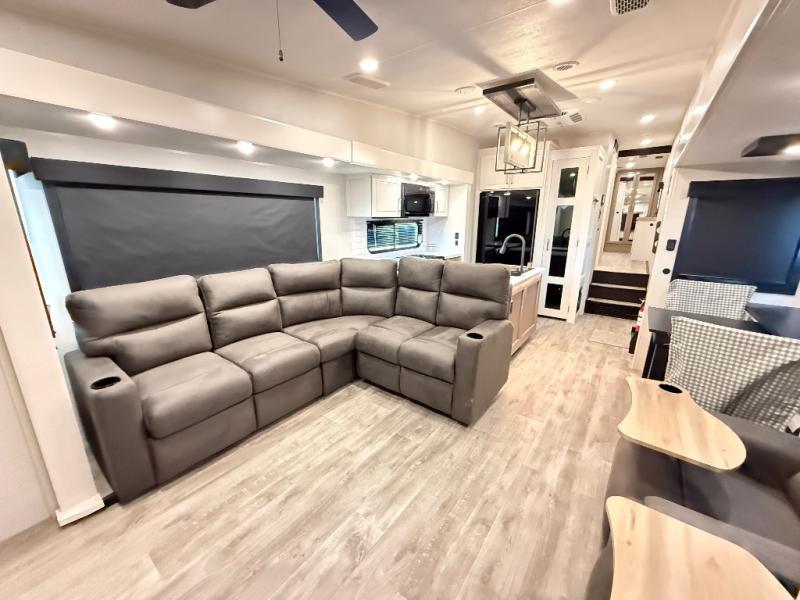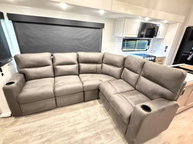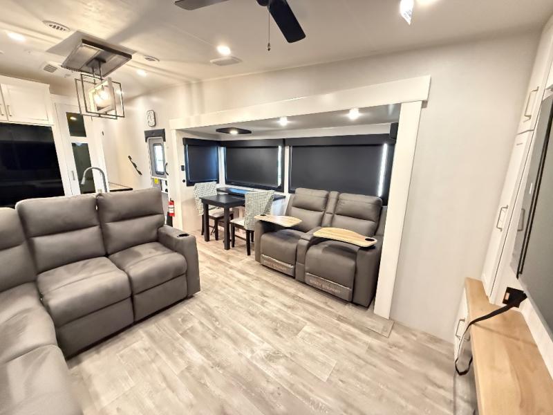 It will be so easy to enjoy time in this spacious fifth wheel! The rear living area includes an entertainment center with a fireplace across from the L-shaped sofa for movie nights. There is also a theater sofa with cup holders plus a roll-top dinette with two chairs to dine at. The chef of your group will love the generous counter space in the middle kitchen, and there is a large pantry to keep food stocked. Heading up front, you'll find the spacious bathroom that includes a shower with a seat, and the front private bedroom with a king bed slide out. There is also a chest with a TV, front shelves with drawers, plus washer and dryer prep!