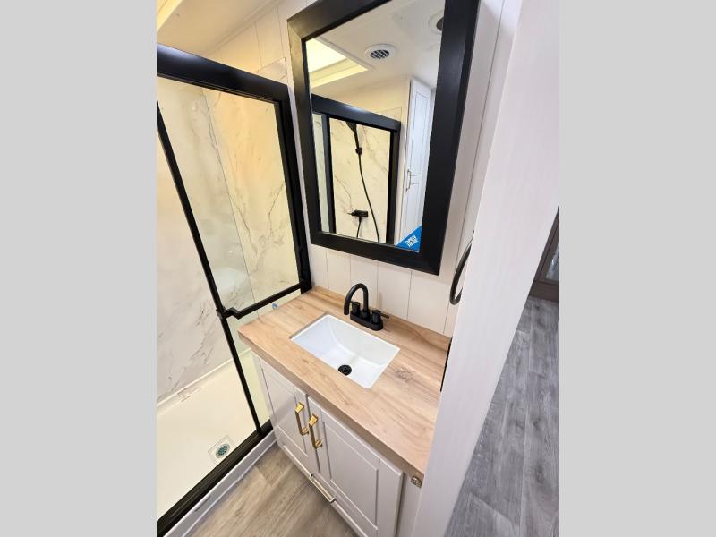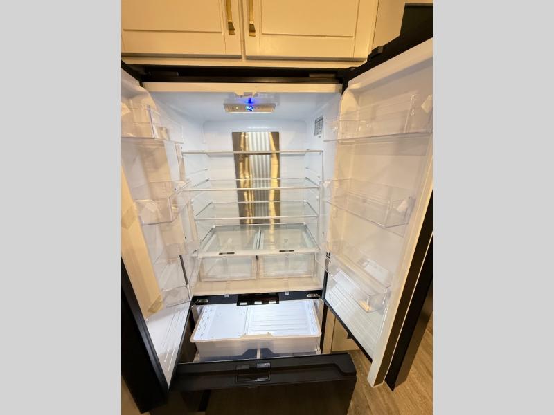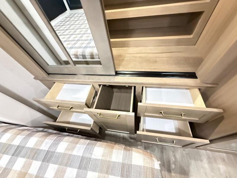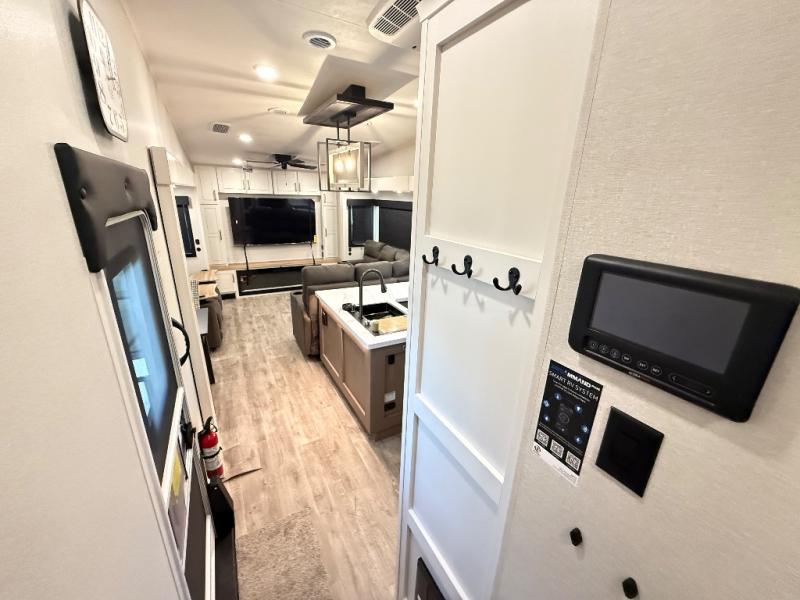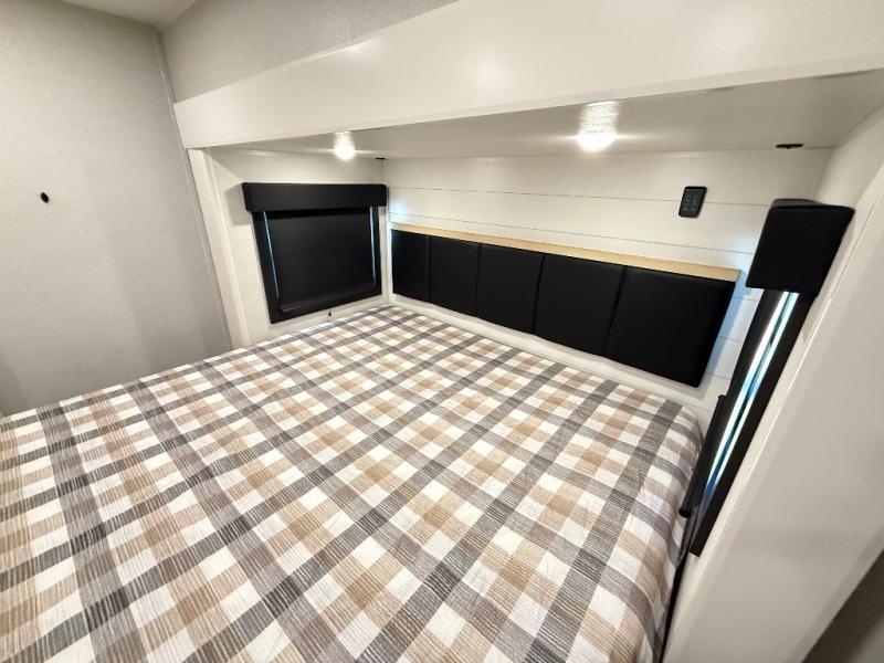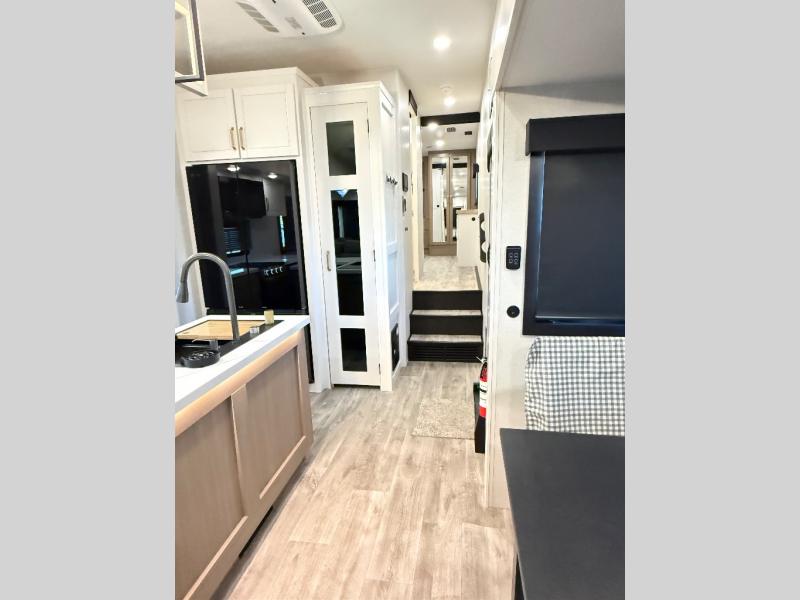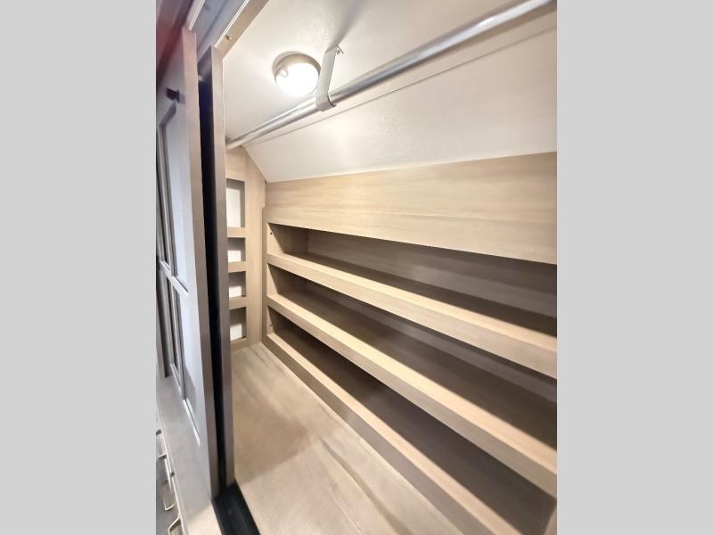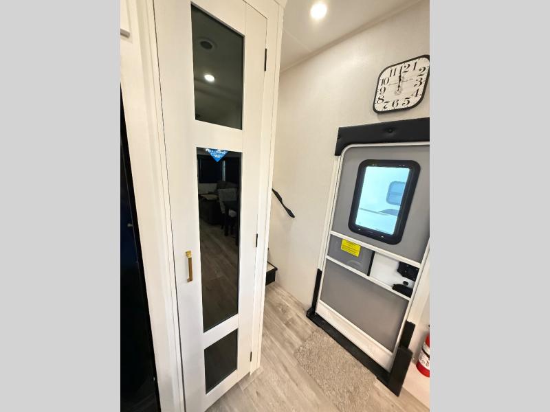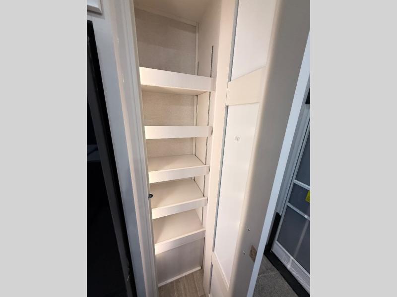 It will be so easy to enjoy time in this spacious fifth wheel! The rear living area includes an entertainment center with a fireplace across from the L-shaped sofa for movie nights. There is also a theater sofa with cup holders plus a roll-top dinette with two chairs to dine at. The chef of your group will love the generous counter space in the middle kitchen, and there is a large pantry to keep food stocked. Heading up front, you'll find the spacious bathroom that includes a shower with a seat, and the front private bedroom with a king bed slide out. There is also a chest with a TV, front shelves with drawers, plus washer and dryer prep!