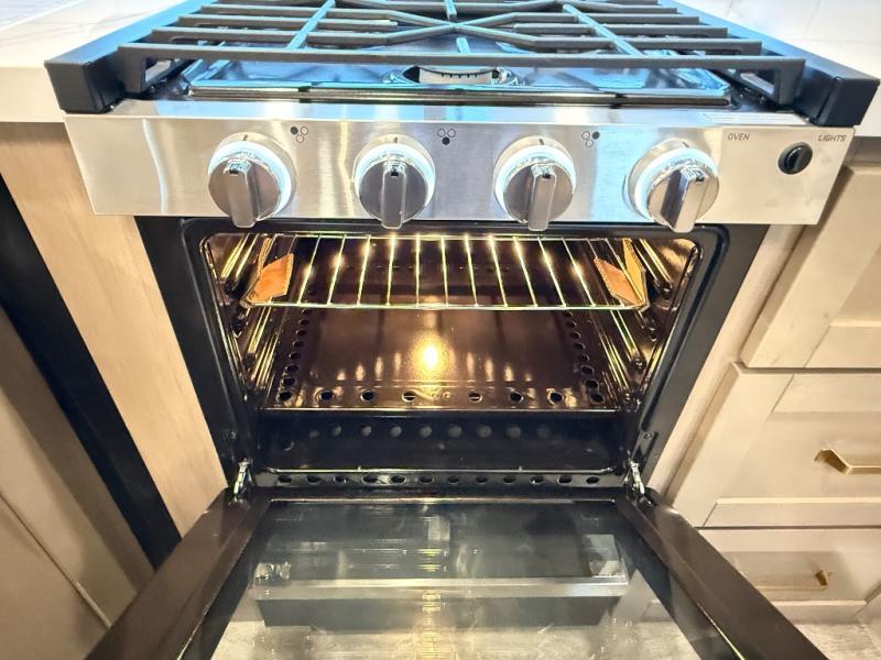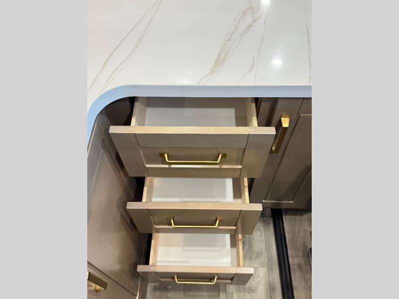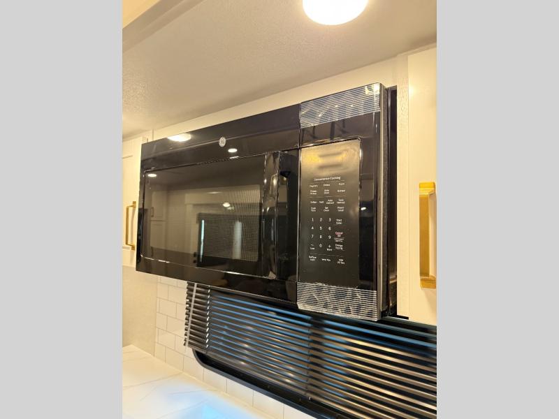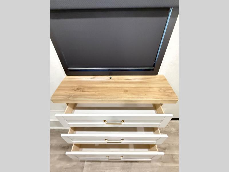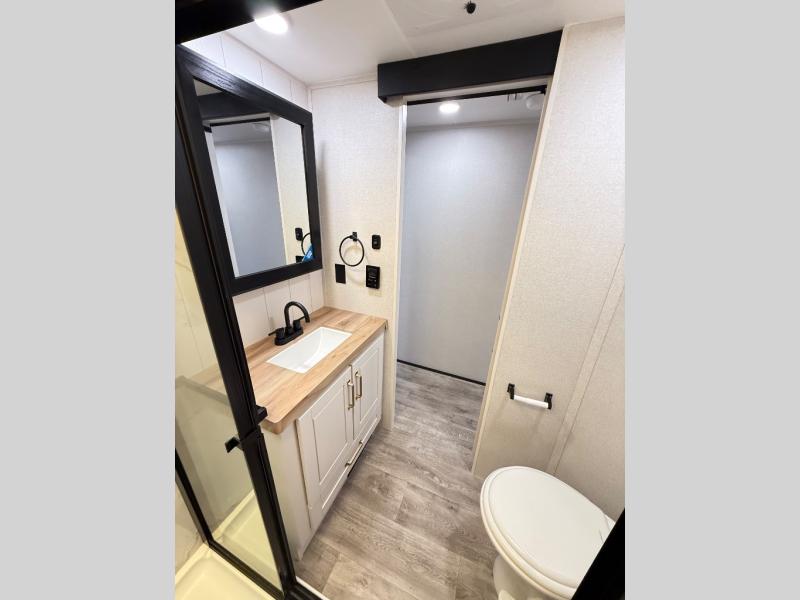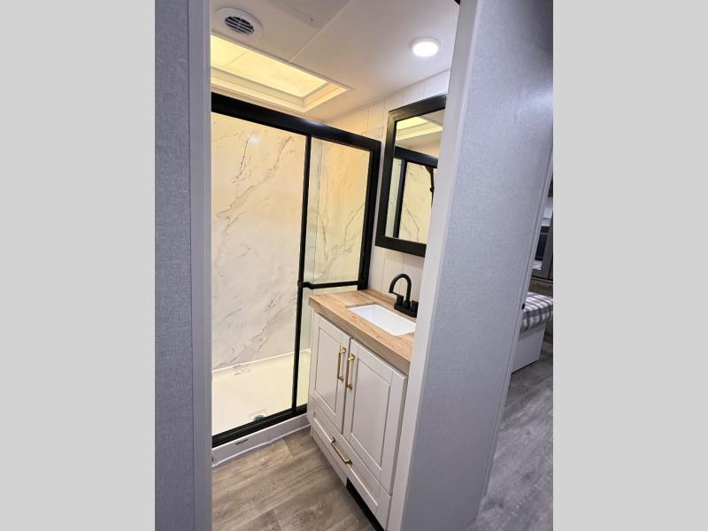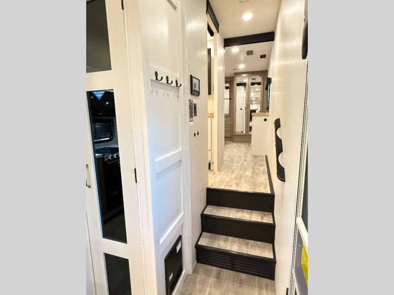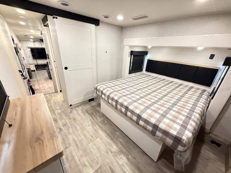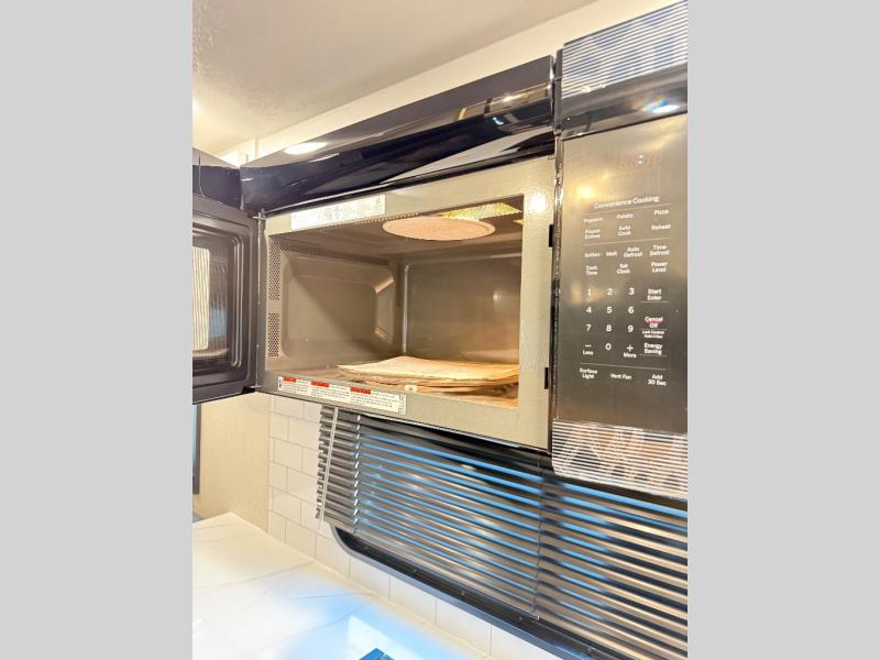 It will be so easy to enjoy time in this spacious fifth wheel! The rear living area includes an entertainment center with a fireplace across from the L-shaped sofa for movie nights. There is also a theater sofa with cup holders plus a roll-top dinette with two chairs to dine at. The chef of your group will love the generous counter space in the middle kitchen, and there is a large pantry to keep food stocked. Heading up front, you'll find the spacious bathroom that includes a shower with a seat, and the front private bedroom with a king bed slide out. There is also a chest with a TV, front shelves with drawers, plus washer and dryer prep!