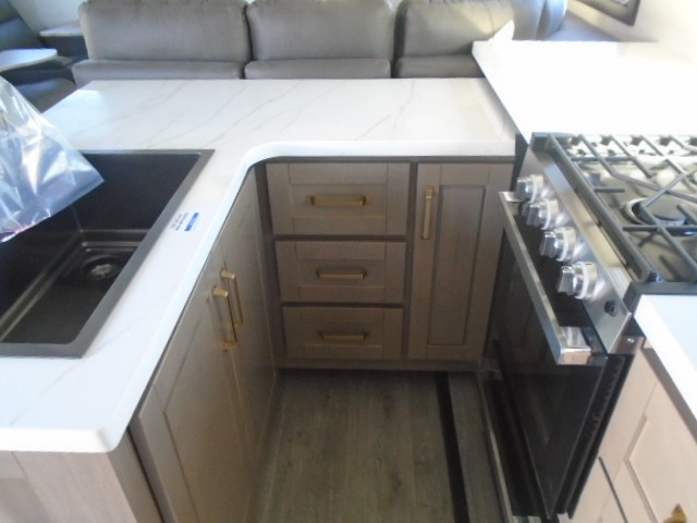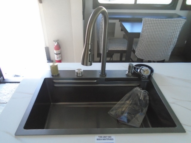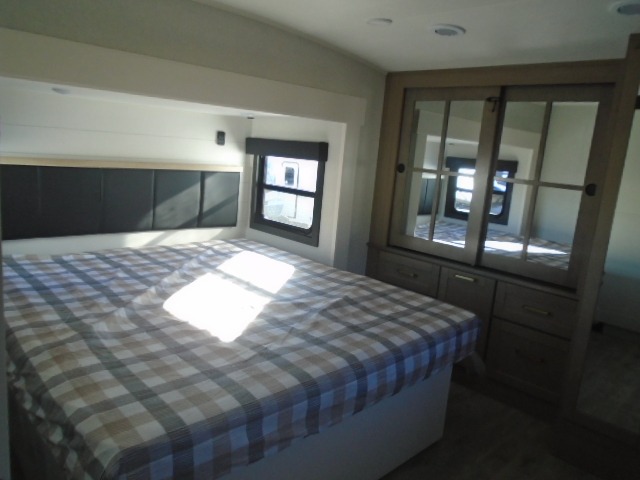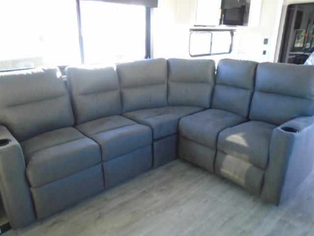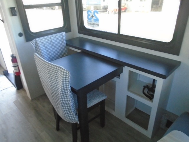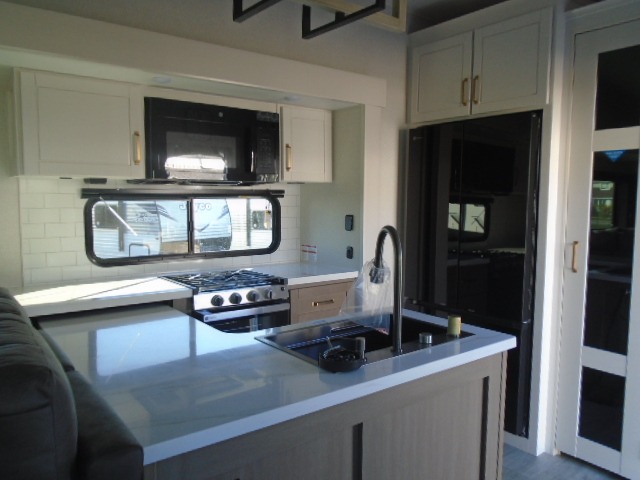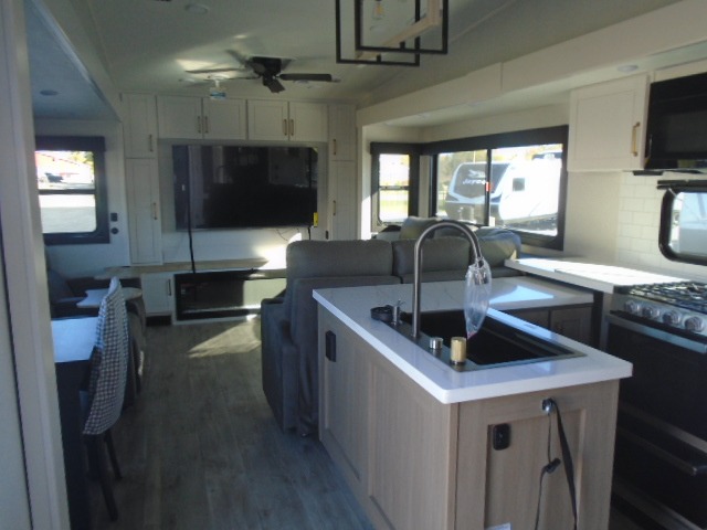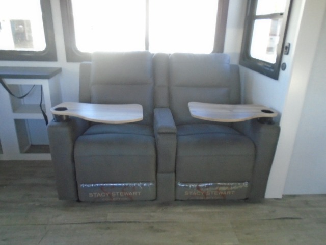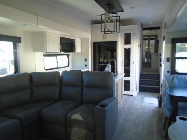 It will be so easy to enjoy time in this spacious fifth wheel! The rear living area includes an entertainment center with a fireplace across from the L-shaped sofa for movie nights. There is also a theater sofa with cup holders plus a roll-top dinette with two chairs to dine at. The chef of your group will love the generous counter space in the middle kitchen, and there is a large pantry to keep food stocked. Heading up front, you'll find the spacious bathroom that includes a shower with a seat, and the front private bedroom with a king bed slide out. There is also a chest with a TV, front shelves with drawers, plus washer and dryer prep!