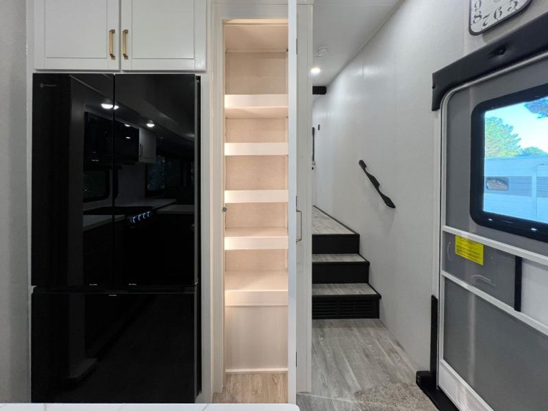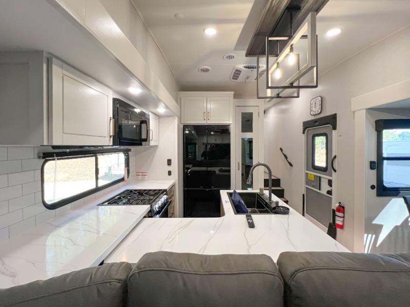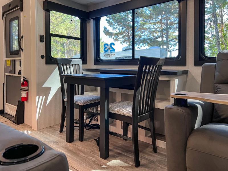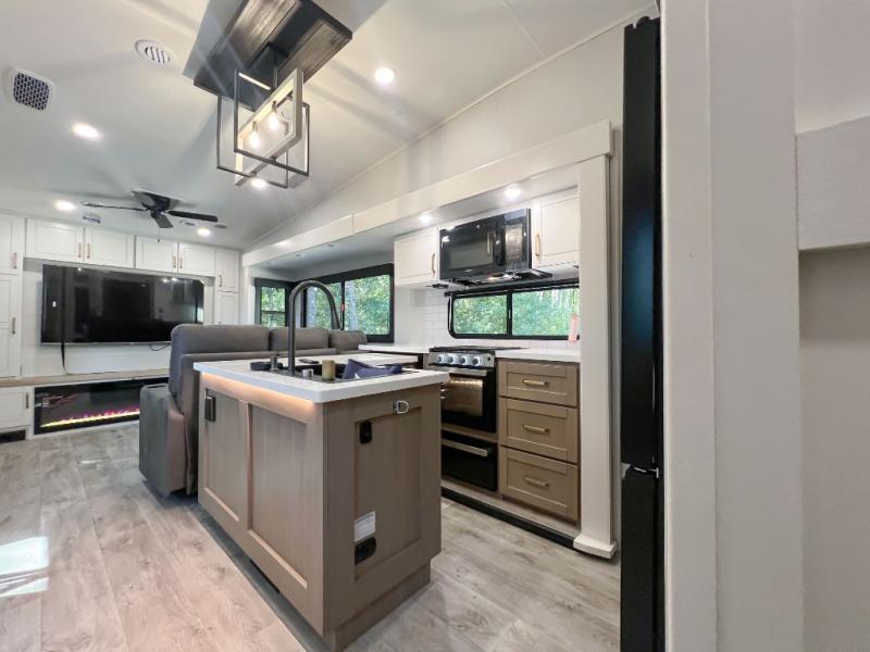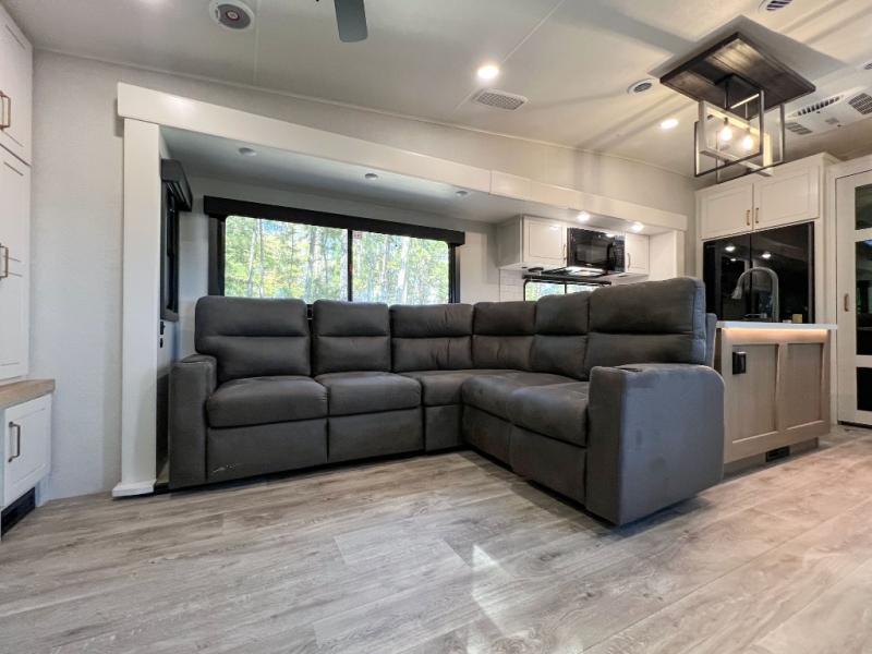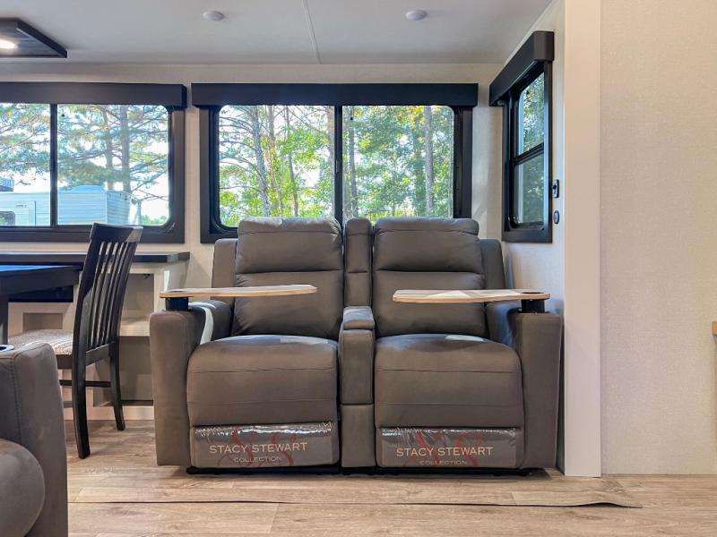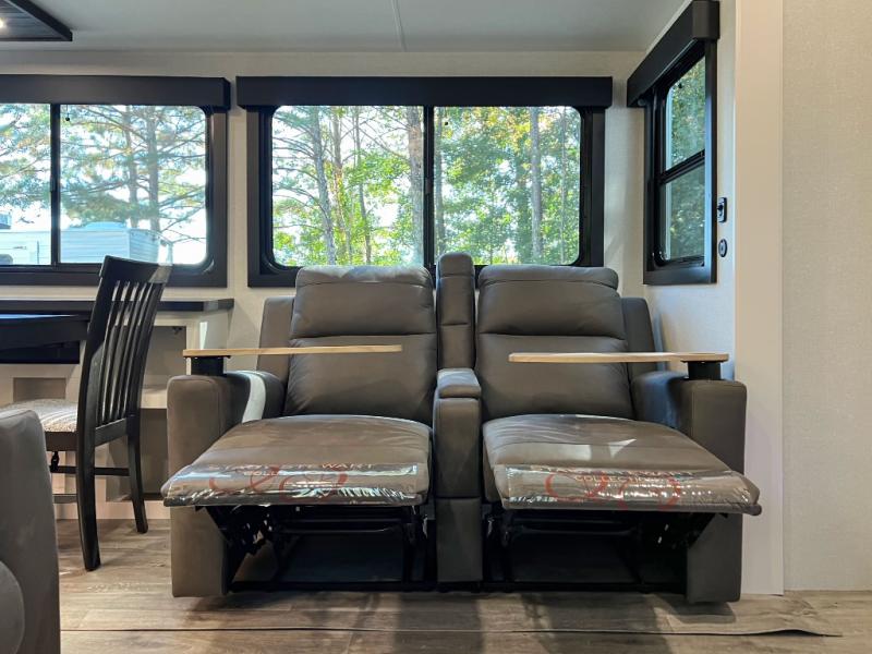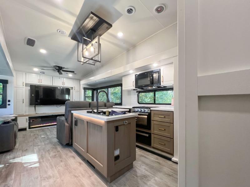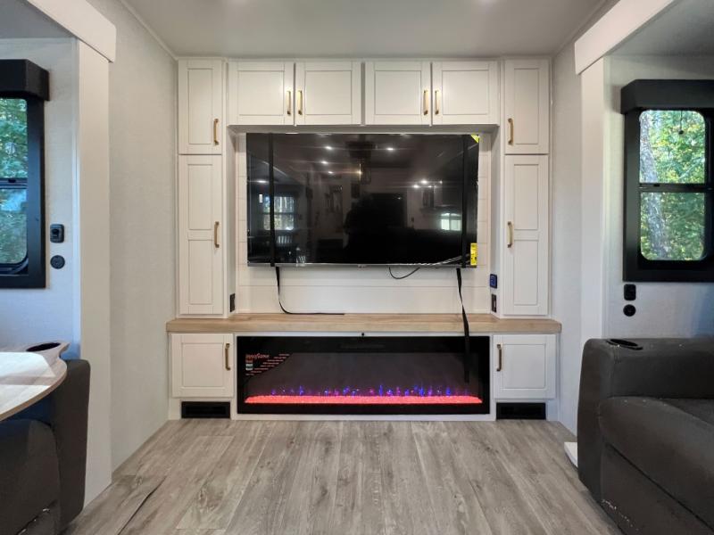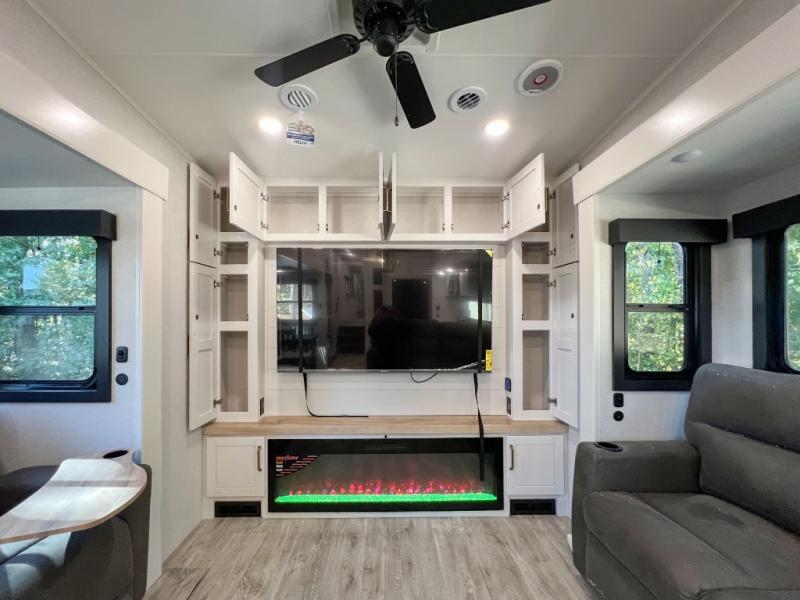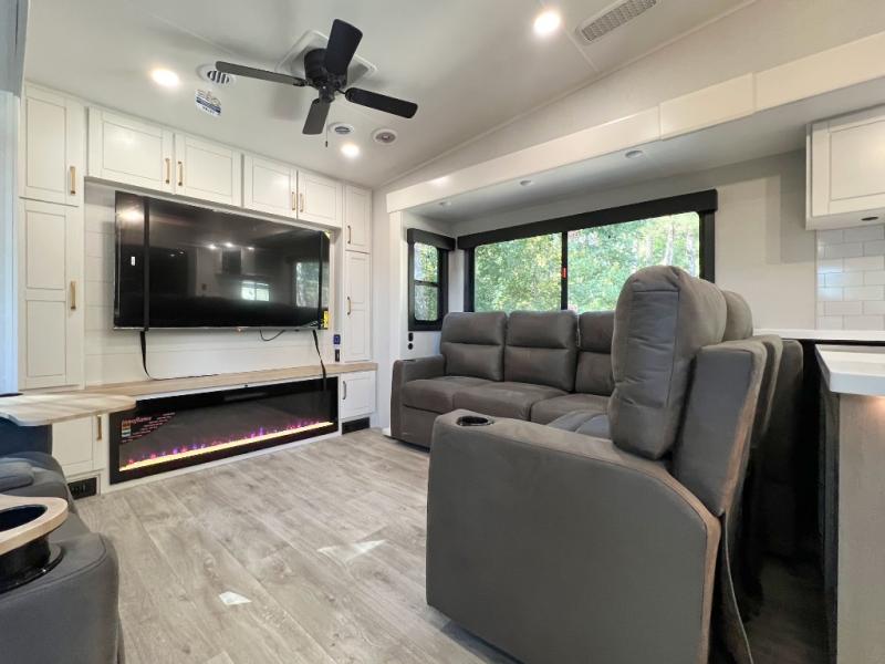 It will be so easy to enjoy time in this spacious fifth wheel! The rear living area includes an entertainment center with a fireplace across from the L-shaped sofa for movie nights. There is also a theater sofa with cup holders plus a roll-top dinette with two chairs to dine at. The chef of your group will love the generous counter space in the middle kitchen, and there is a large pantry to keep food stocked. Heading up front, you'll find the spacious bathroom that includes a shower with a seat, and the front private bedroom with a king bed slide out. There is also a chest with a TV, front shelves with drawers, plus washer and dryer prep!