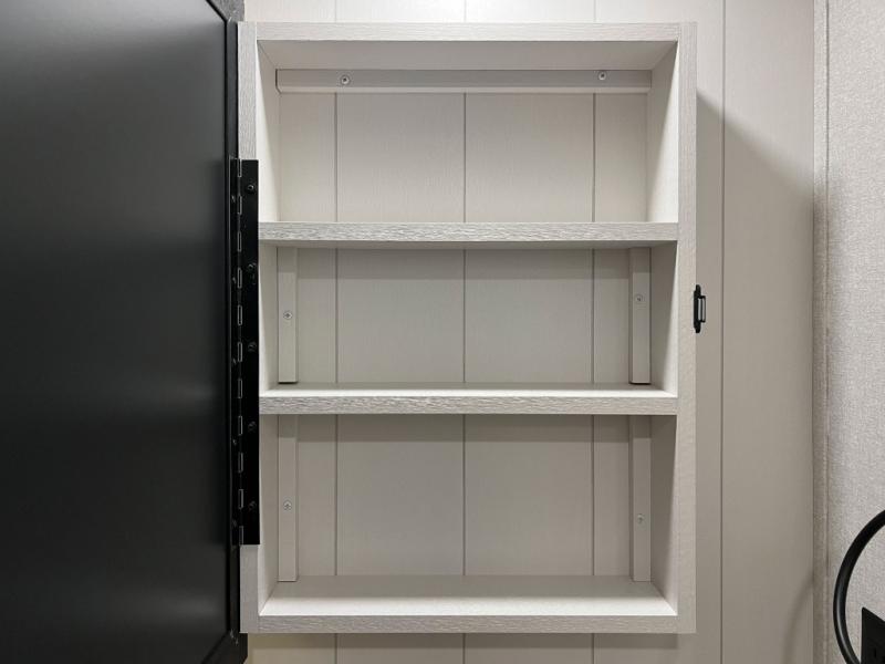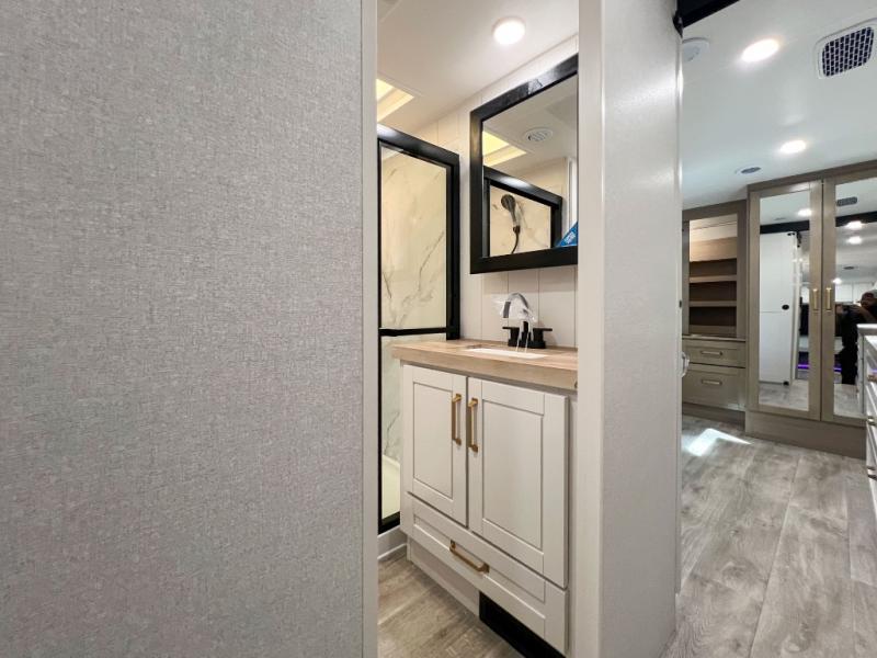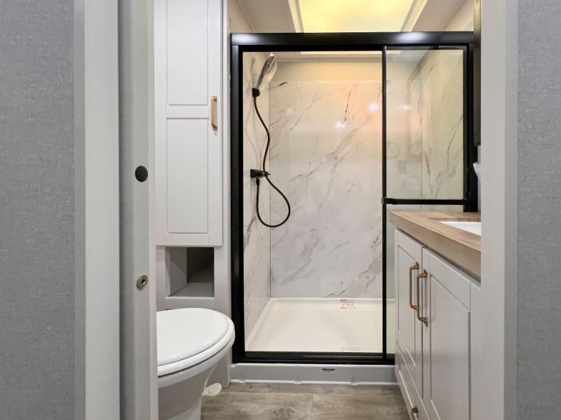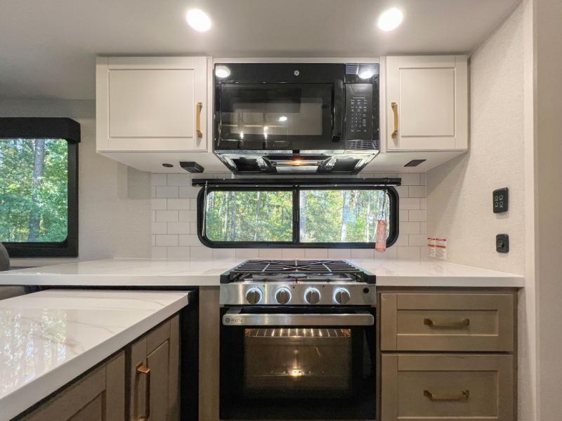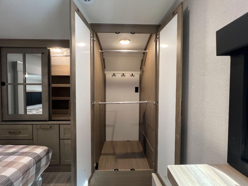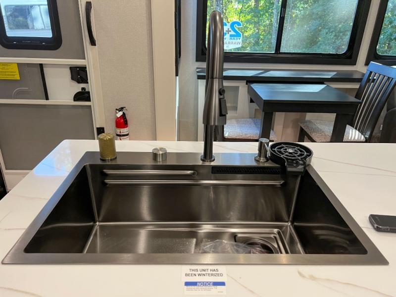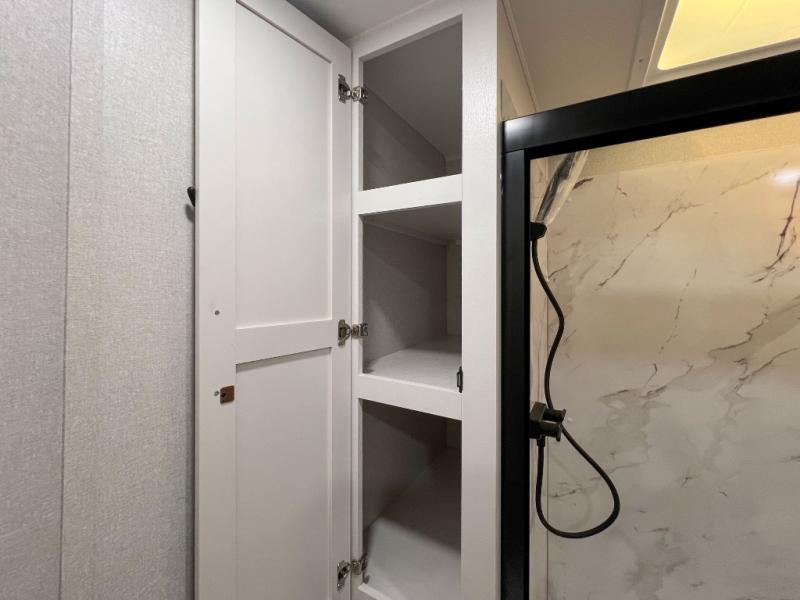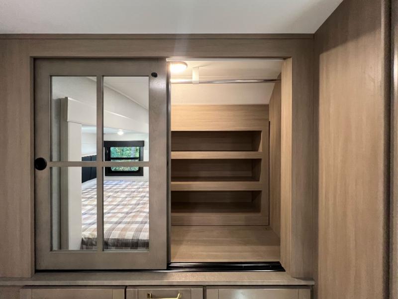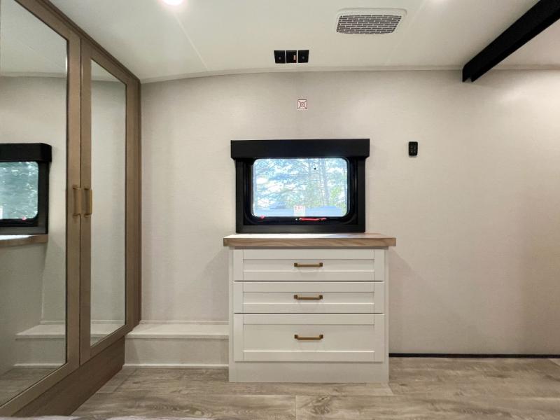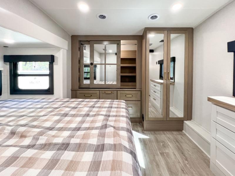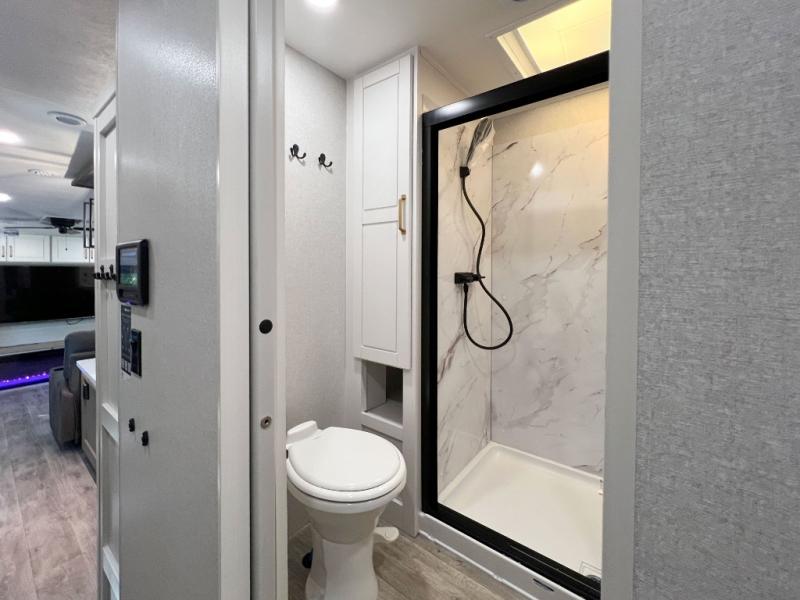 It will be so easy to enjoy time in this spacious fifth wheel! The rear living area includes an entertainment center with a fireplace across from the L-shaped sofa for movie nights. There is also a theater sofa with cup holders plus a roll-top dinette with two chairs to dine at. The chef of your group will love the generous counter space in the middle kitchen, and there is a large pantry to keep food stocked. Heading up front, you'll find the spacious bathroom that includes a shower with a seat, and the front private bedroom with a king bed slide out. There is also a chest with a TV, front shelves with drawers, plus washer and dryer prep!