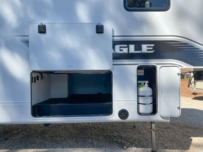With any Eagle fifth wheel by Jayco you will appreciate durable construction materials, like the Magnum Truss Roof and the Stronghold VBL laminated walls. The JAYCOMMAND Smart RV system puts you in control of your RV's functions, and the 5 Star Handling Package will provide smooth towing from home to camp. Each model features Climate Shield zero-degree tested weather protection and the industry-exclusive HELIX cooling system that features two 15,000 BTU Whisper Quiet A/C's to keep you comfortable year around. Some of the exterior conveniences you are sure to love are the pass-through storage with Slam-Latch baggage doors and an automotive style front cap with max turn radius. The Eagle fifth wheels are designed to make you feel at home with solid hardwood slide fascia, residential vinyl flooring throughout, 100% no floor vents, and blackout roller shades with reflective side throughout for added privacy and insulation.