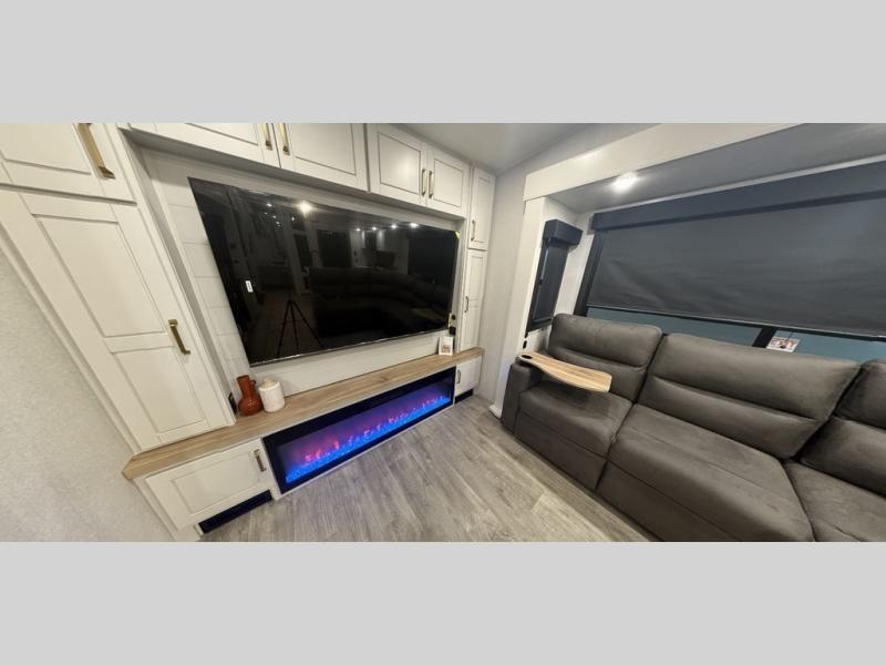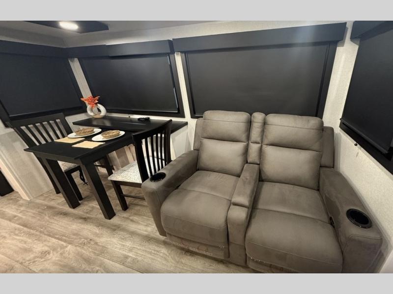 It will be so easy to enjoy time in this spacious fifth wheel! The rear living area includes an entertainment center with a fireplace across from the L-shaped sofa for movie nights. There is also a theater sofa with cup holders plus a roll-top dinette with two chairs to dine at. The chef of your group will love the generous counter space in the middle kitchen, and there is a large pantry to keep food stocked. Heading up front, you'll find the spacious bathroom that includes a shower with a seat, and the front private bedroom with a king bed slide out. There is also a chest with a TV, front shelves with drawers, plus washer and dryer prep!