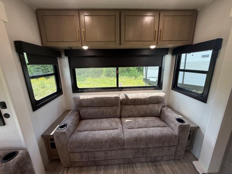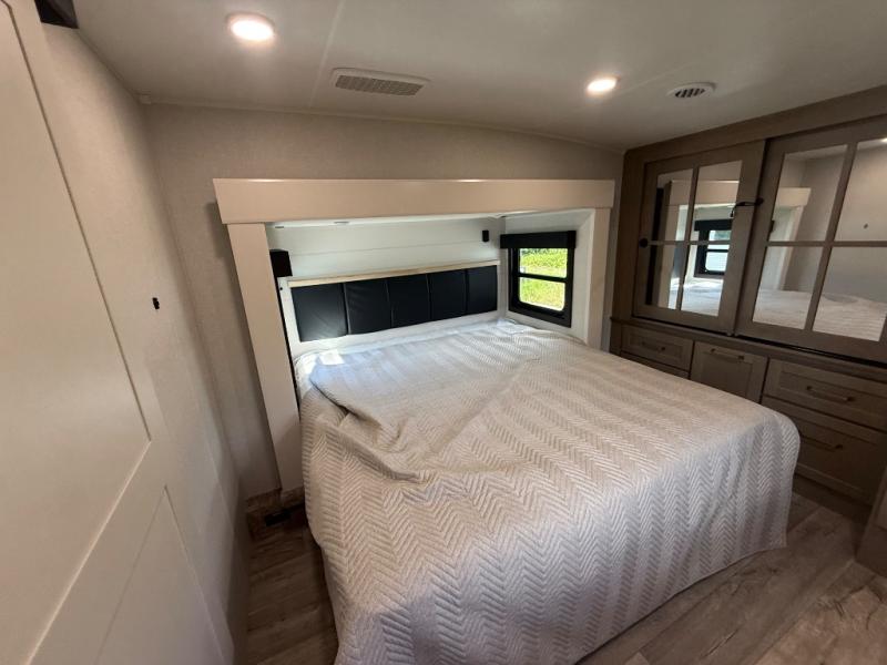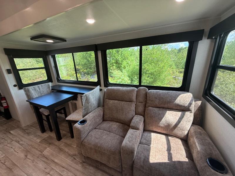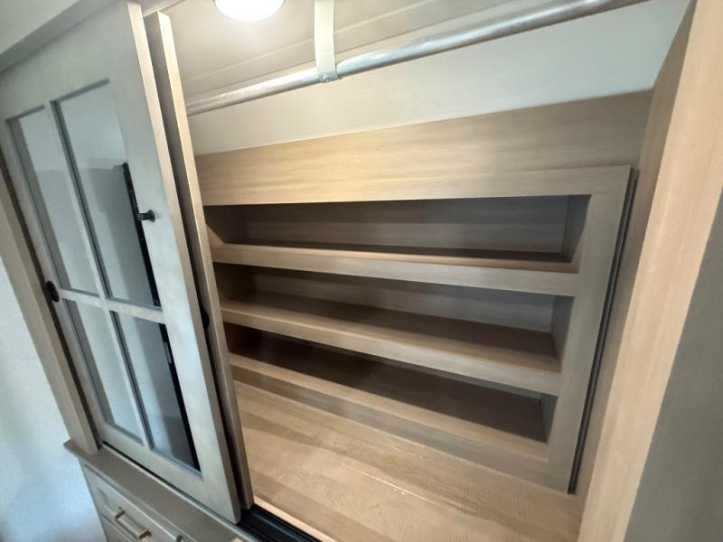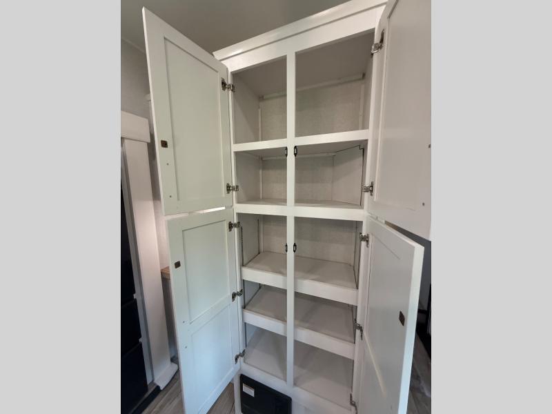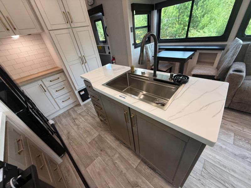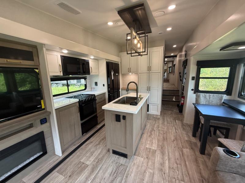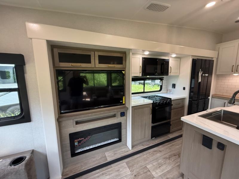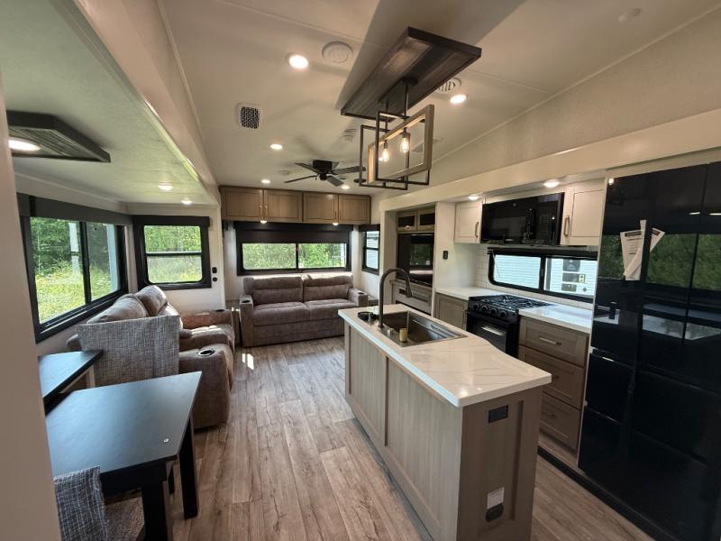 Step inside and you’ll immediately notice the open concept design that feels like home. The mid-bunk room offers a flexible space for kids, guests, or even a mobile office, while the loft above adds extra sleeping or storage space. The living area features plush theater seating, a cozy entertainment center with fireplace, and a gourmet kitchen complete with solid surface countertops, premium appliances, and a large pantry. The master suite delivers a private retreat with a king-size bed option, spacious wardrobe, and spa-like bathroom with a residential shower.