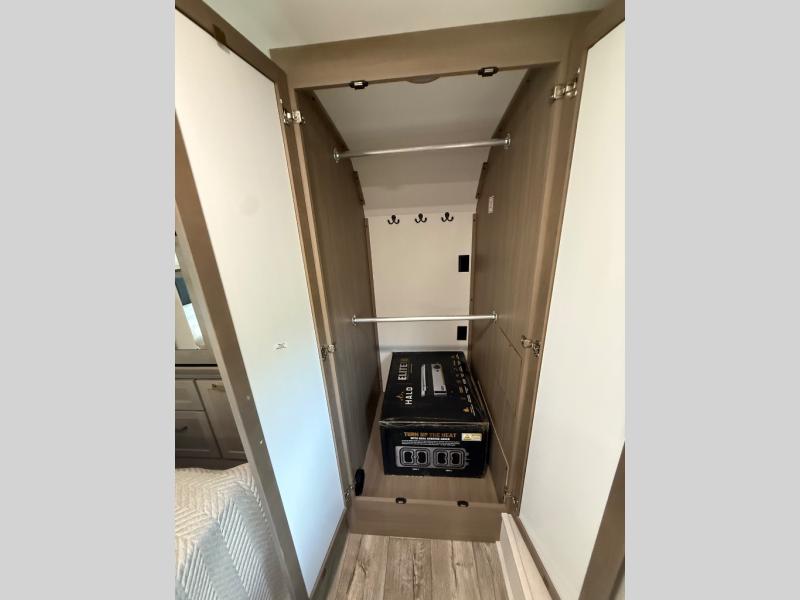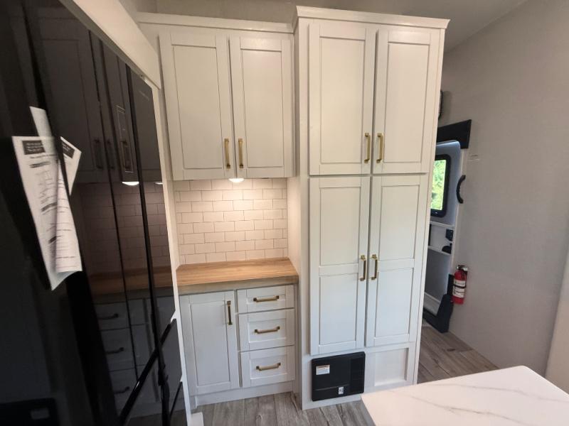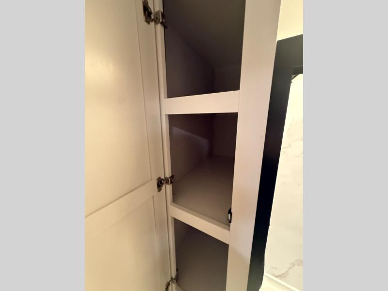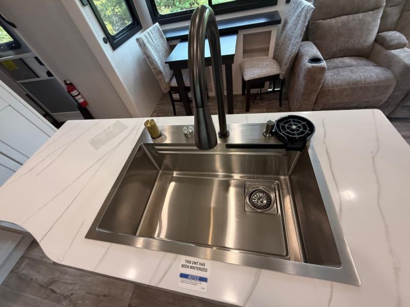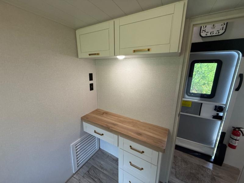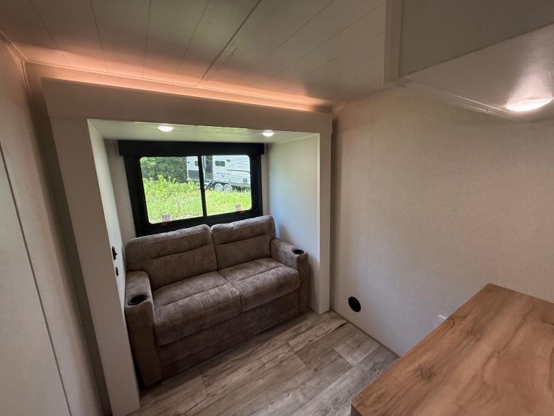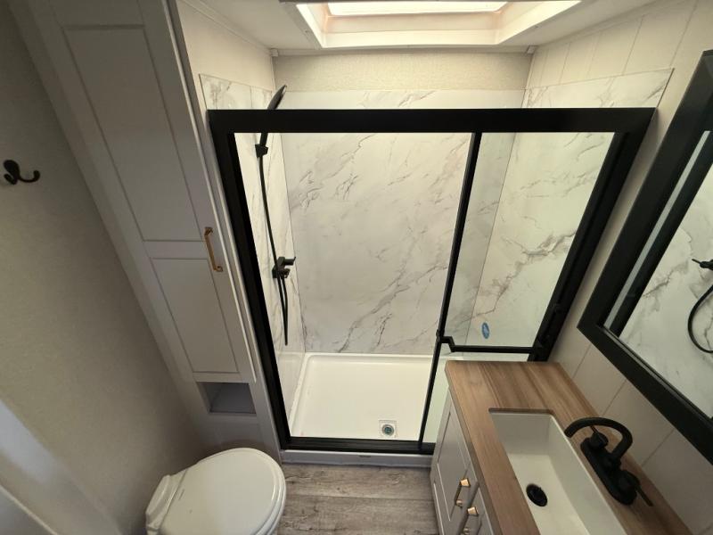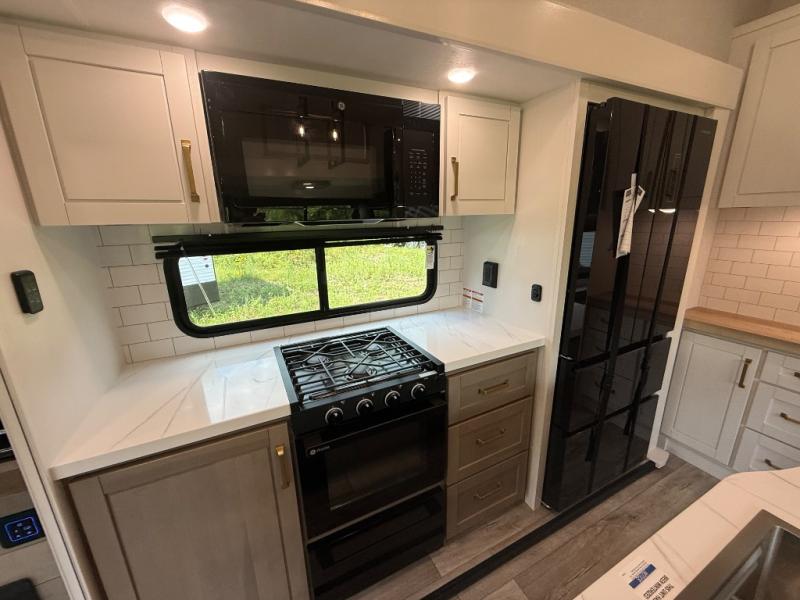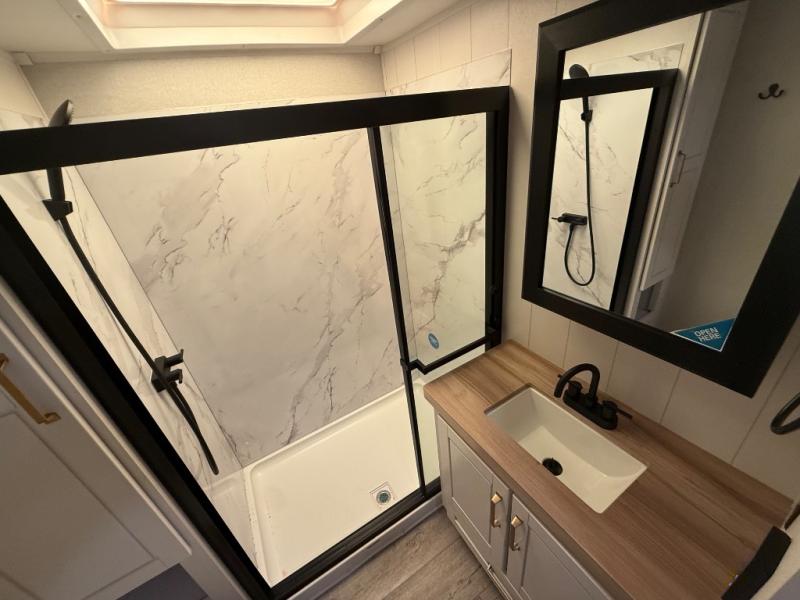 Step inside and you’ll immediately notice the open concept design that feels like home. The mid-bunk room offers a flexible space for kids, guests, or even a mobile office, while the loft above adds extra sleeping or storage space. The living area features plush theater seating, a cozy entertainment center with fireplace, and a gourmet kitchen complete with solid surface countertops, premium appliances, and a large pantry. The master suite delivers a private retreat with a king-size bed option, spacious wardrobe, and spa-like bathroom with a residential shower.