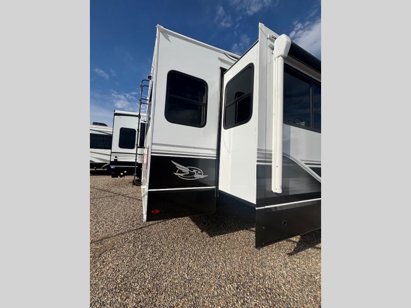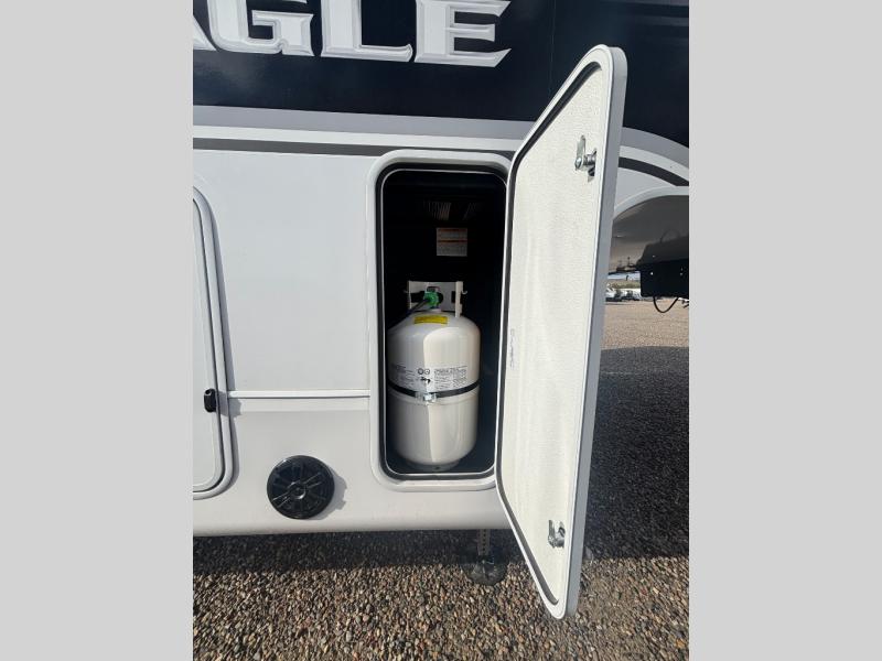 With any Eagle fifth wheel by Jayco you will appreciate durable construction materials, like the Magnum Truss Roof and the Stronghold VBL laminated walls. The JAYCOMMAND Smart RV system puts you in control of your RV's functions, and the 5 Star Handling Package will provide smooth towing from home to camp. Each model features Climate Shield zero-degree tested weather protection and the industry-exclusive HELIX cooling system that features two 15,000 BTU Whisper Quiet A/C's to keep you comfortable year around. Some of the exterior conveniences you are sure to love are the pass-through storage with Slam-Latch baggage doors and an automotive style front cap with max turn radius. The Eagle fifth wheels are designed to make you feel at home with solid hardwood slide fascia, residential vinyl flooring throughout, 100% no floor vents, and blackout roller shades with reflective side throughout for added privacy and insulation.