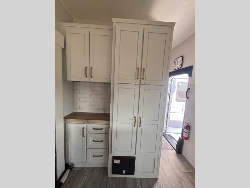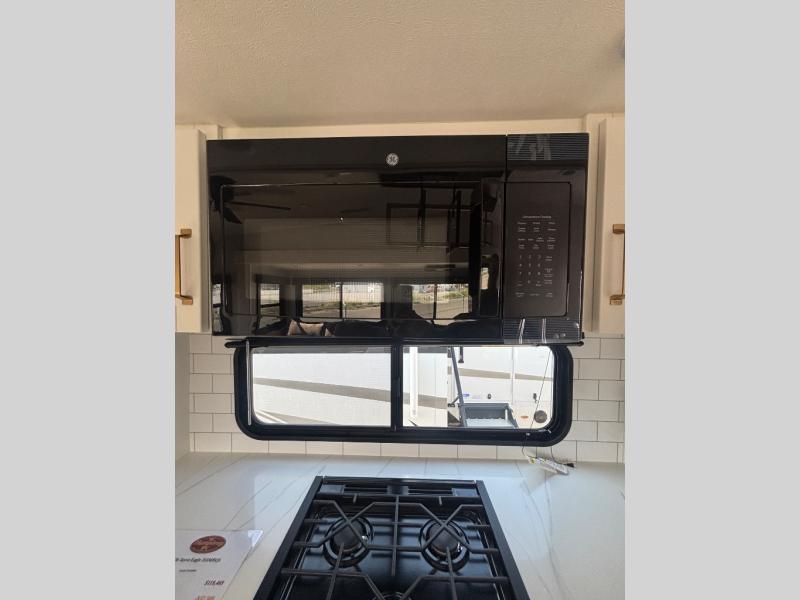 This fifth wheel with four slides is one your whole crew will love! There is a middle bedroom/den with a tri-fold sofa and a desk, allowing this room to become an office if you need it. The loft above this room will be a big hit with the little ones, and the full bath is centrally located so everyone can use it easily. You will have the front private bedroom all to yourselves with a king bed slide out, a chest with TV prep, plus washer and dryer prep in the walk-in closet. The main living area includes everything you need to relax in comfort, like the theater seats, tri-fold sofa, and entertainment center with a fireplace. The chef will enjoy the extra counter space provided by the kitchen island, and there is plenty of storage with the pantry, hutch, and 16 cu. ft. 12V refrigerator. This model even has an outside kitchen, two power awnings, and outside storage for all your gear!