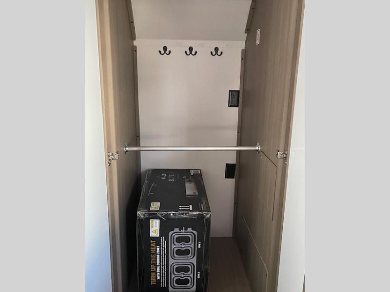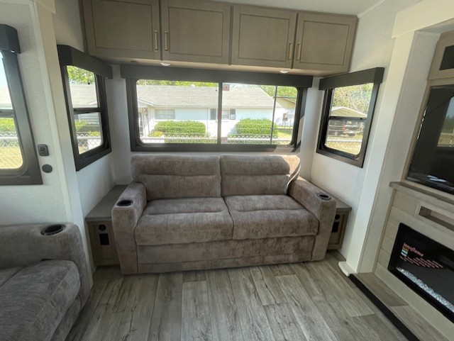 This fifth wheel with four slides is one your whole crew will love! There is a middle bedroom/den with a tri-fold sofa and a desk, allowing this room to become an office if you need it. The loft above this room will be a big hit with the little ones, and the full bath is centrally located so everyone can use it easily. You will have the front private bedroom all to yourselves with a king bed slide out, a chest with TV prep, plus washer and dryer prep in the walk-in closet. The main living area includes everything you need to relax in comfort, like the theater seats, tri-fold sofa, and entertainment center with a fireplace. The chef will enjoy the extra counter space provided by the kitchen island, and there is plenty of storage with the pantry, hutch, and 16 cu. ft. 12V refrigerator. This model even has an outside kitchen, two power awnings, and outside storage for all your gear!