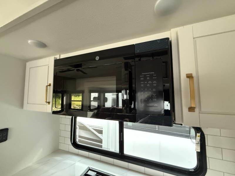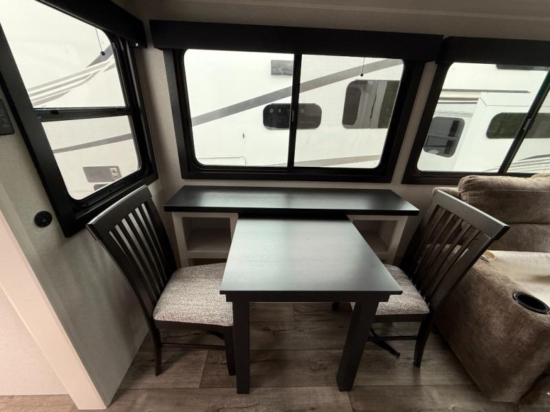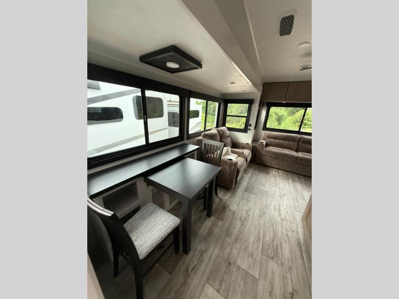 This fifth wheel with four slides is one your whole crew will love! There is a middle bedroom/den with a tri-fold sofa and a desk, allowing this room to become an office if you need it. The loft above this room will be a big hit with the little ones, and the full bath is centrally located so everyone can use it easily. You will have the front private bedroom all to yourselves with a king bed slide out, a chest with TV prep, plus washer and dryer prep in the walk-in closet. The main living area includes everything you need to relax in comfort, like the theater seats, tri-fold sofa, and entertainment center with a fireplace. The chef will enjoy the extra counter space provided by the kitchen island, and there is plenty of storage with the pantry, hutch, and 16 cu. ft. 12V refrigerator. This model even has an outside kitchen, two power awnings, and outside storage for all your gear!