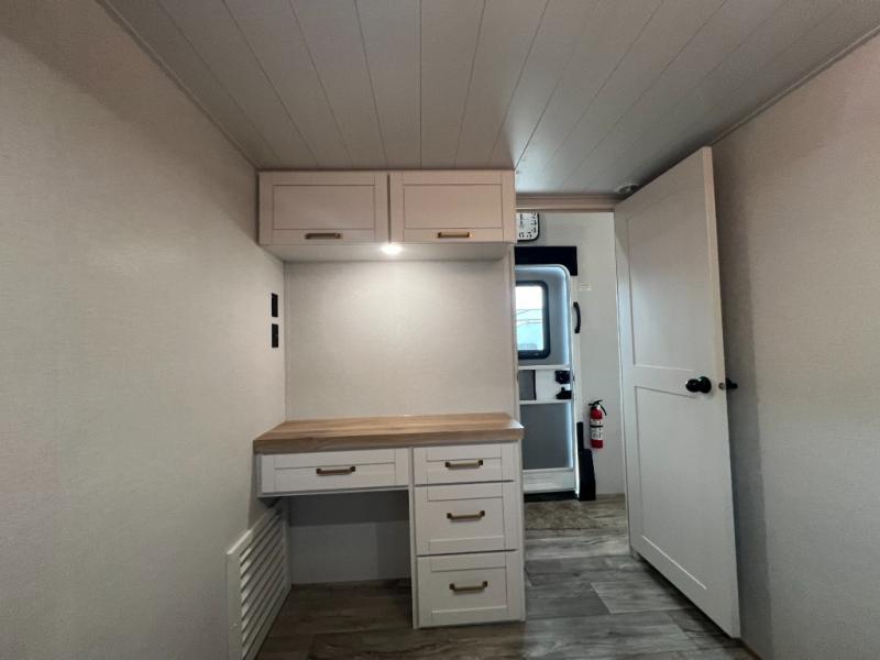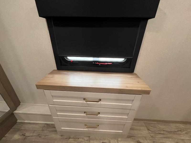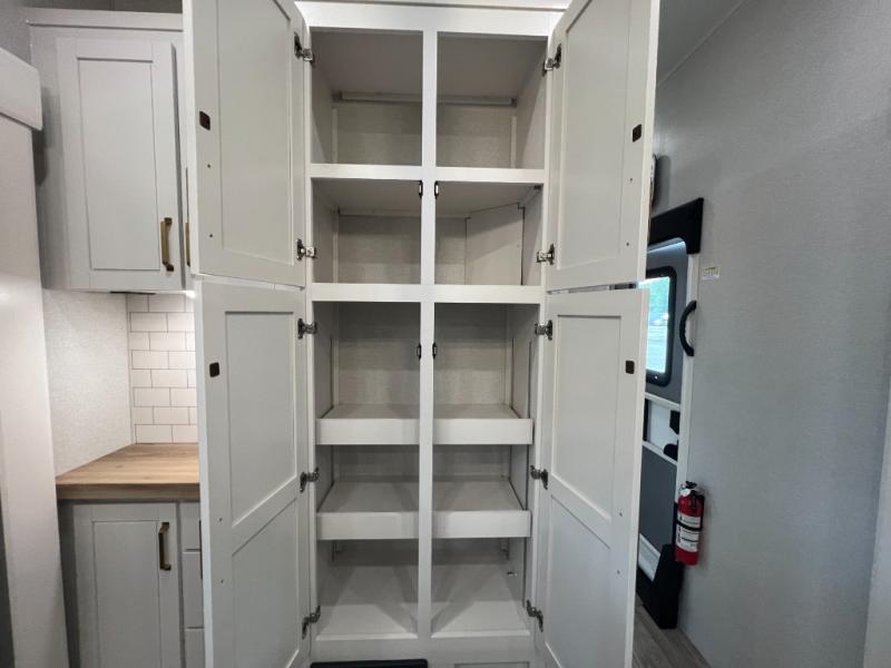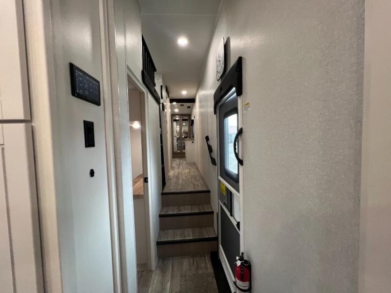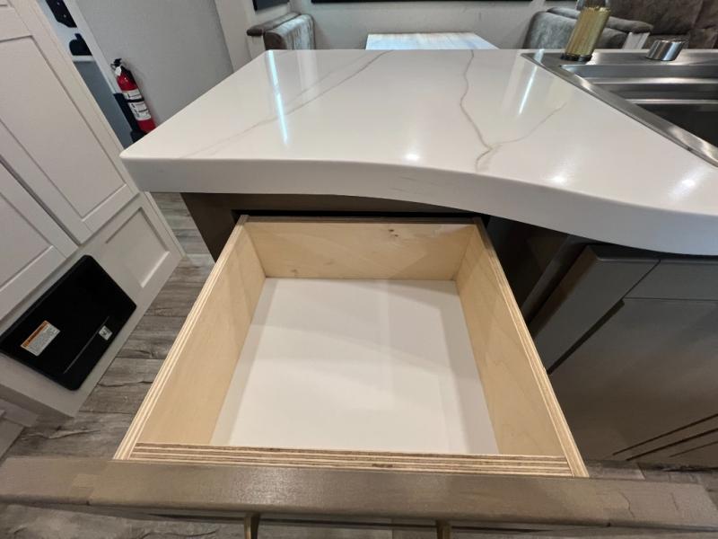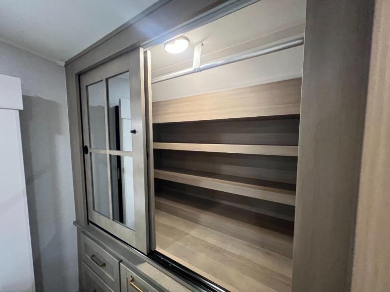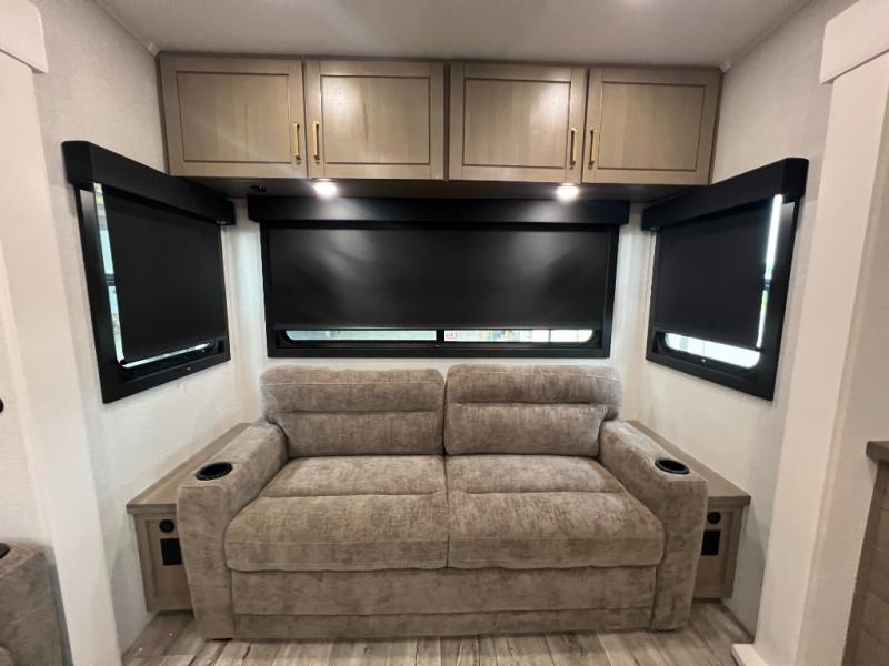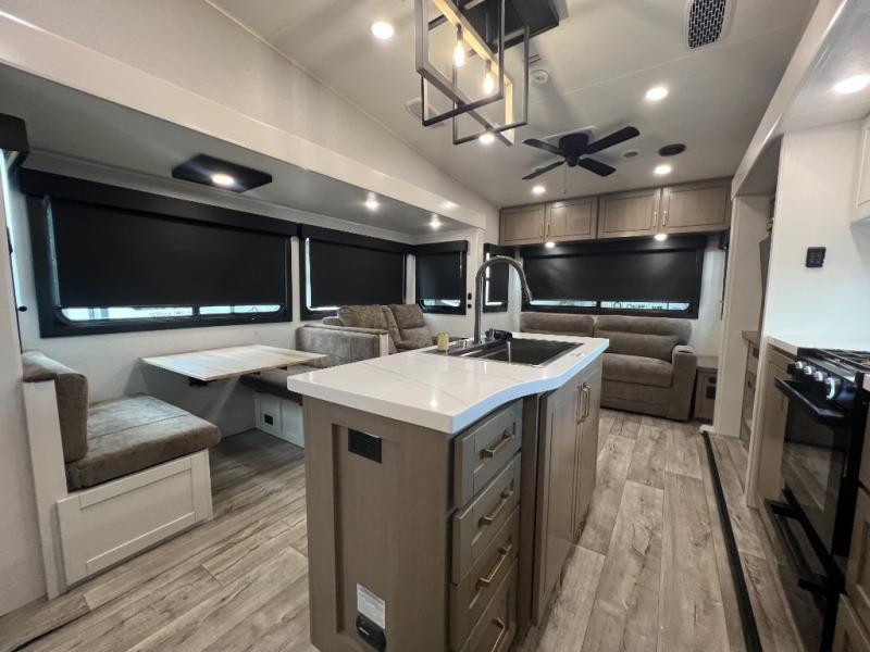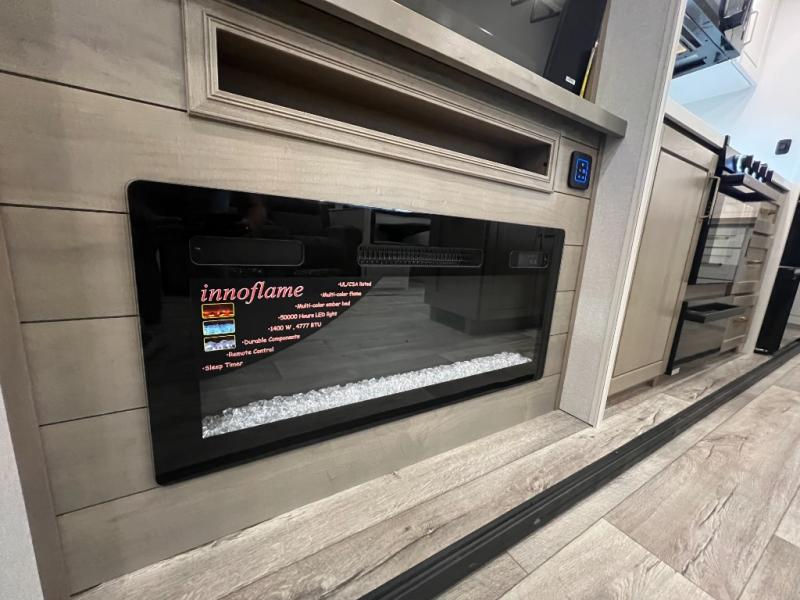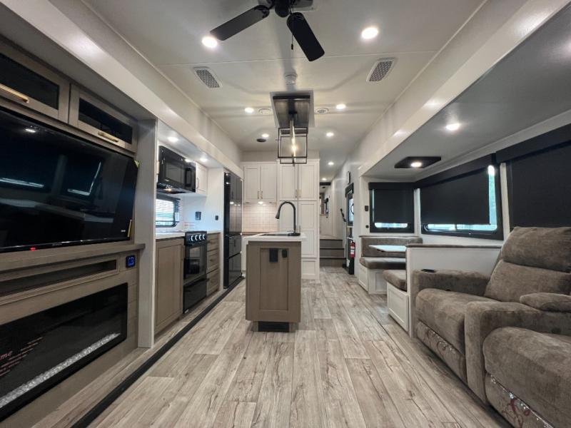 This fifth wheel with four slides is one your whole crew will love! There is a middle bedroom/den with a tri-fold sofa and a desk, allowing this room to become an office if you need it. The loft above this room will be a big hit with the little ones, and the full bath is centrally located so everyone can use it easily. You will have the front private bedroom all to yourselves with a king bed slide out, a chest with TV prep, plus washer and dryer prep in the walk-in closet. The main living area includes everything you need to relax in comfort, like the theater seats, tri-fold sofa, and entertainment center with a fireplace. The chef will enjoy the extra counter space provided by the kitchen island, and there is plenty of storage with the pantry, hutch, and 16 cu. ft. 12V refrigerator. This model even has an outside kitchen, two power awnings, and outside storage for all your gear!