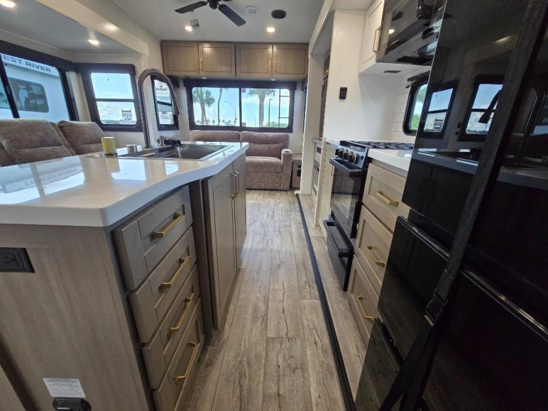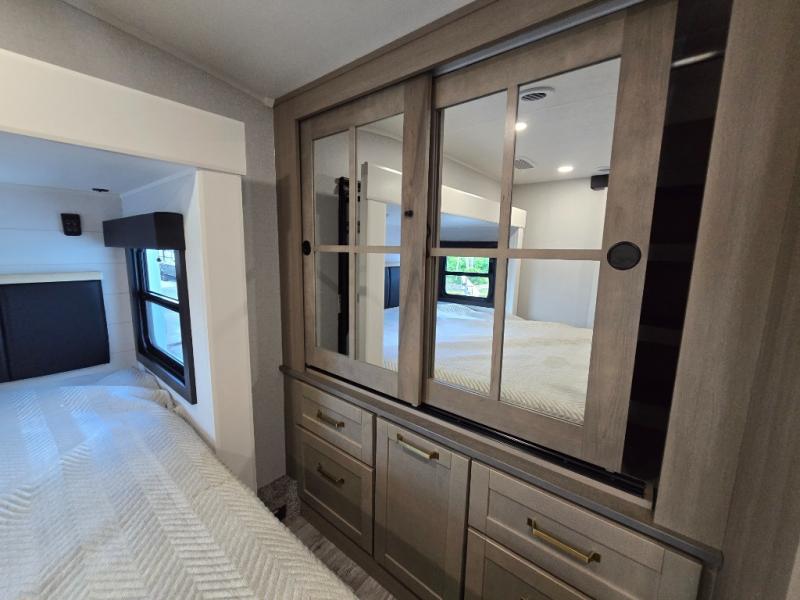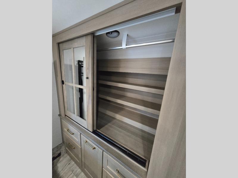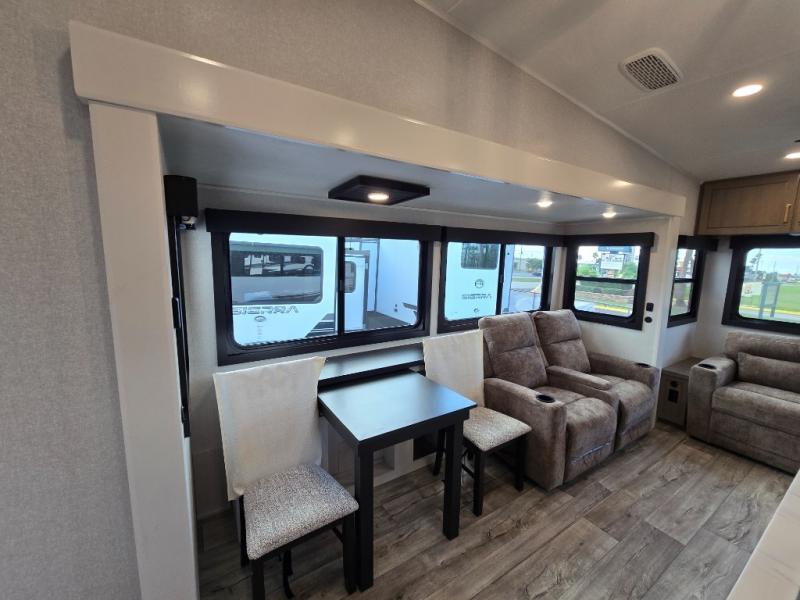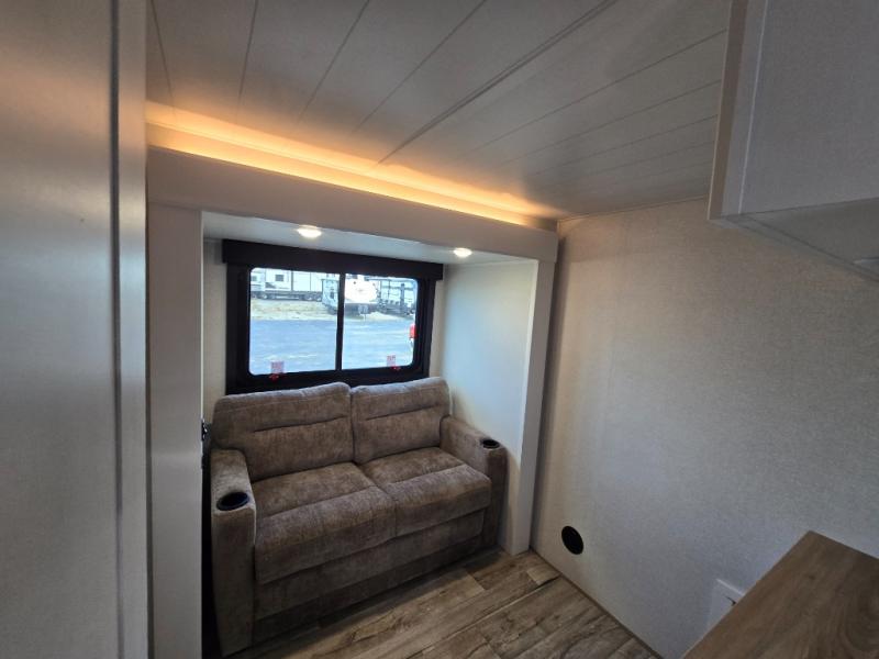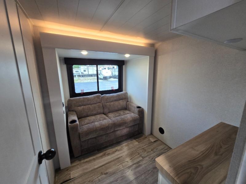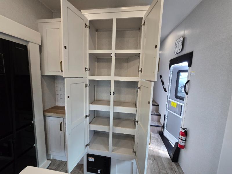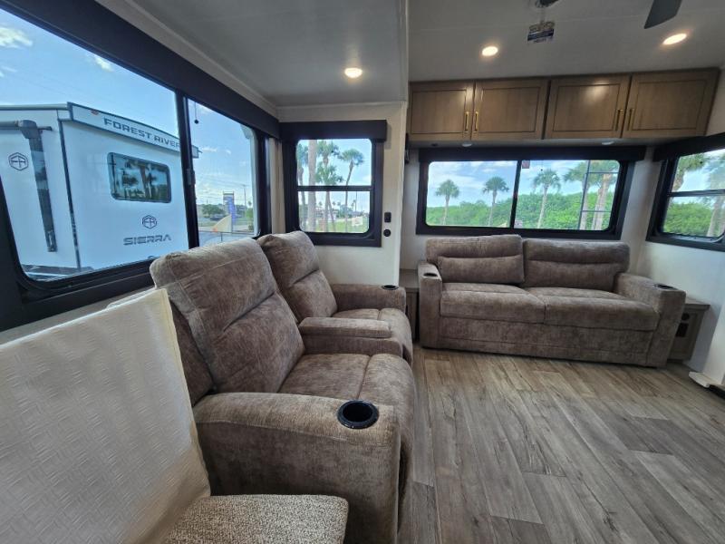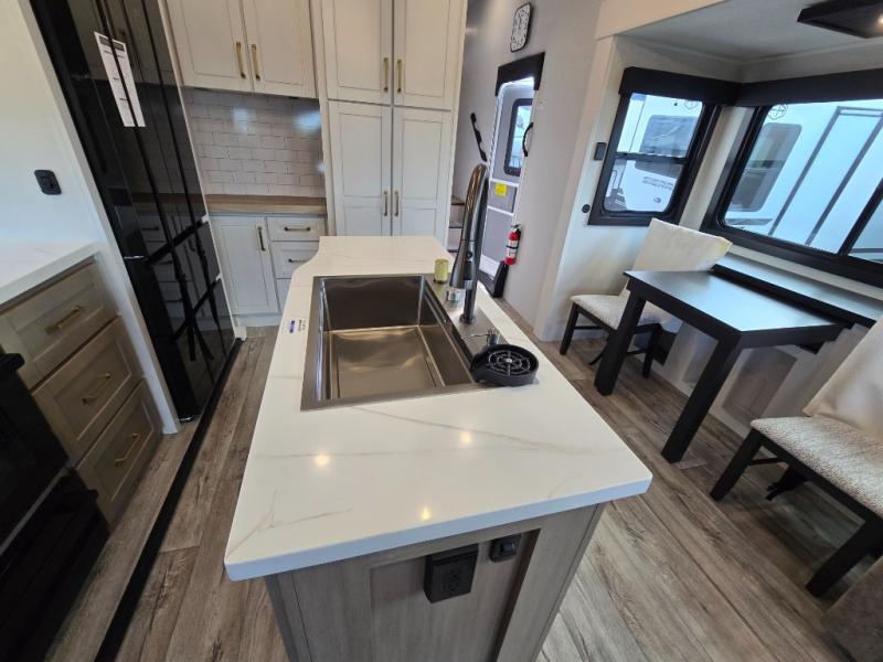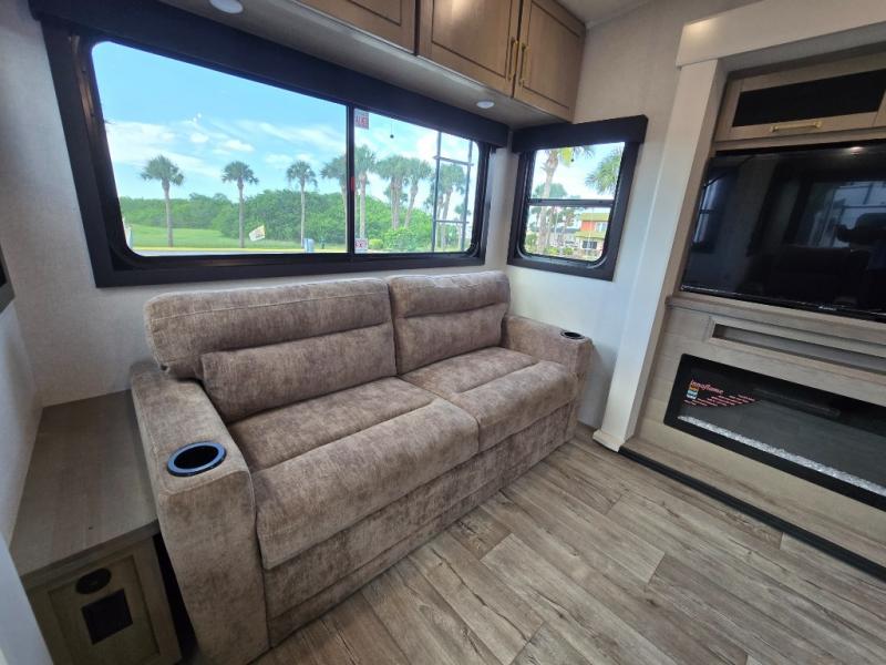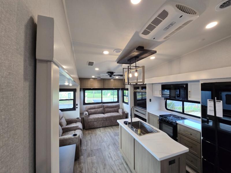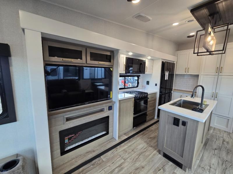 This fifth wheel with four slides is one your whole crew will love! There is a middle bedroom/den with a tri-fold sofa and a desk, allowing this room to become an office if you need it. The loft above this room will be a big hit with the little ones, and the full bath is centrally located so everyone can use it easily. You will have the front private bedroom all to yourselves with a king bed slide out, a chest with TV prep, plus washer and dryer prep in the walk-in closet. The main living area includes everything you need to relax in comfort, like the theater seats, tri-fold sofa, and entertainment center with a fireplace. The chef will enjoy the extra counter space provided by the kitchen island, and there is plenty of storage with the pantry, hutch, and 16 cu. ft. 12V refrigerator. This model even has an outside kitchen, two power awnings, and outside storage for all your gear!
