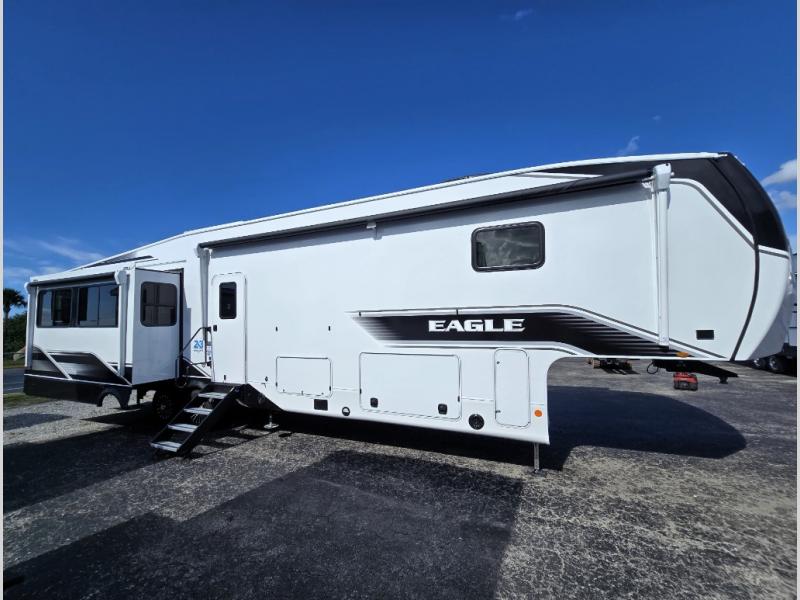 With any Eagle fifth wheel by Jayco you will appreciate durable construction materials, like the Magnum Truss Roof and the Stronghold VBL laminated walls. The JAYCOMMAND Smart RV system puts you in control of your RV's functions, and the 5 Star Handling Package will provide smooth towing from home to camp. Each model features Climate Shield zero-degree tested weather protection and the industry-exclusive HELIX cooling system that features two 15,000 BTU Whisper Quiet A/C's to keep you comfortable year around. Some of the exterior conveniences you are sure to love are the pass-through storage with Slam-Latch baggage doors and an automotive style front cap with max turn radius. The Eagle fifth wheels are designed to make you feel at home with solid hardwood slide fascia, residential vinyl flooring throughout, 100% no floor vents, and blackout roller shades with reflective side throughout for added privacy and insulation.