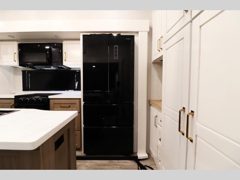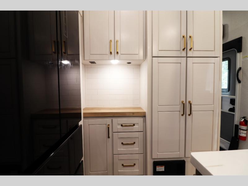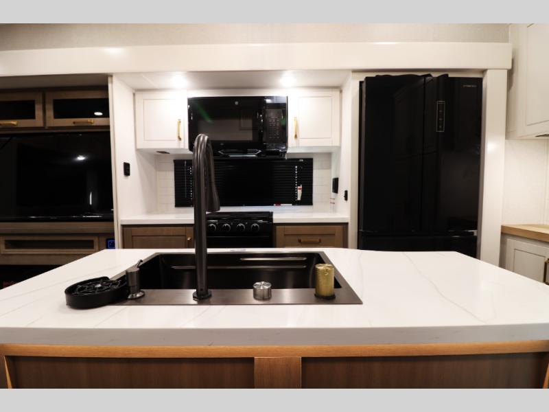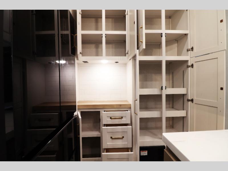 Kitchen island, multi-functional sink, 16 cu ft 12V refrigerator, pantry, and hutch for gourmet cooking on the go.