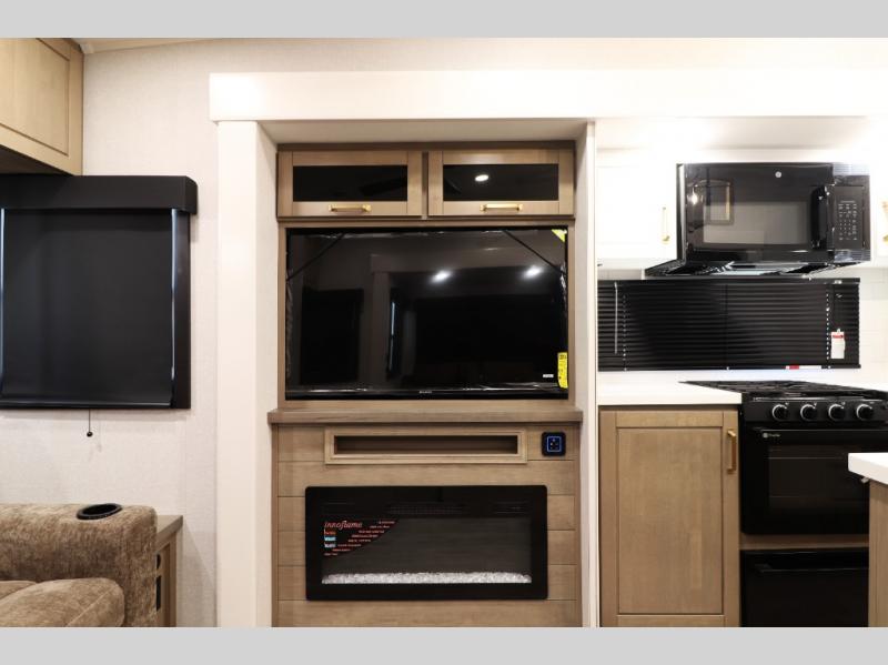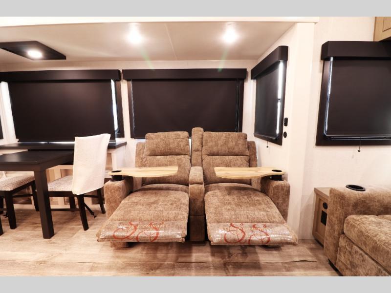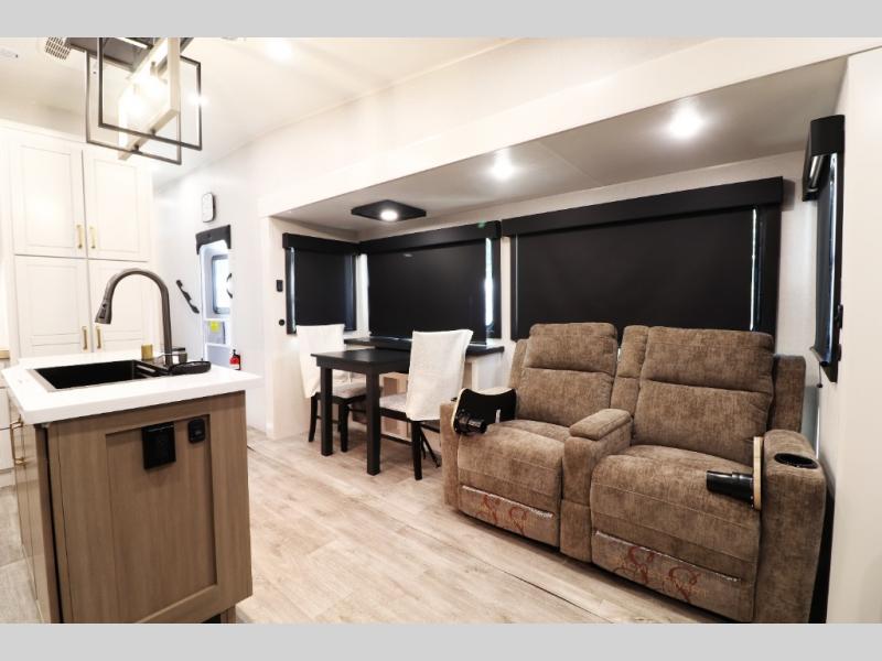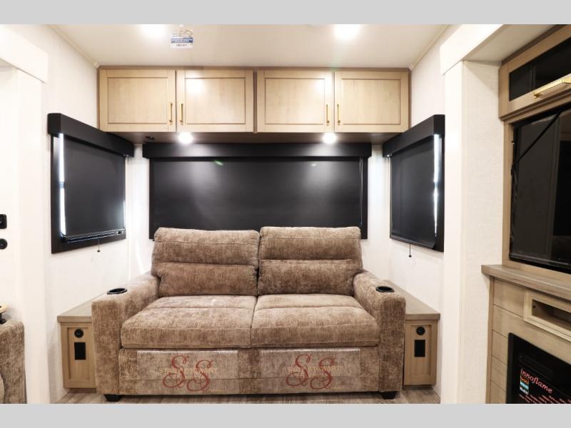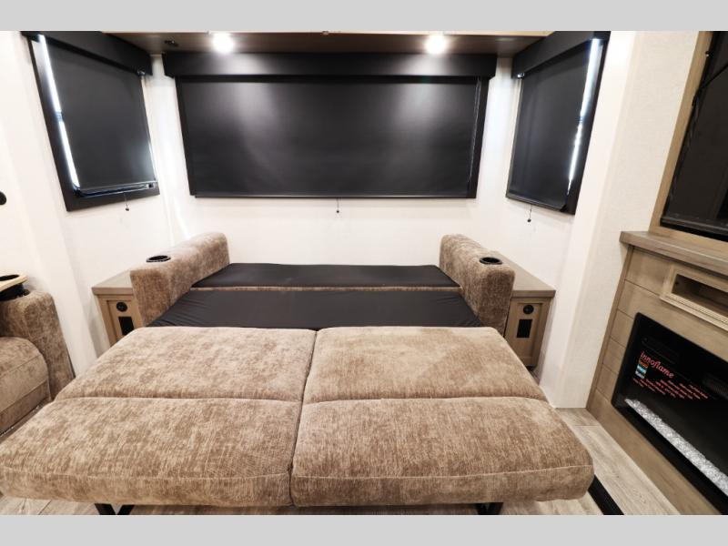 Rear living area includes theater seats, tri-fold sofa, fireplace, entertainment center—ideal for cozy evenings or extra sleeping space.