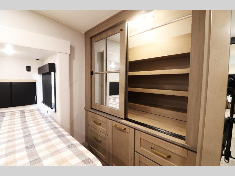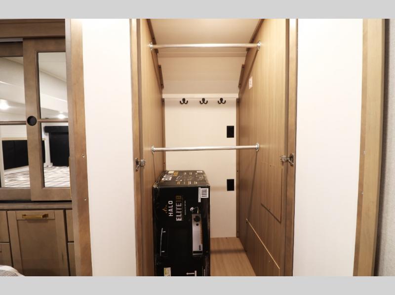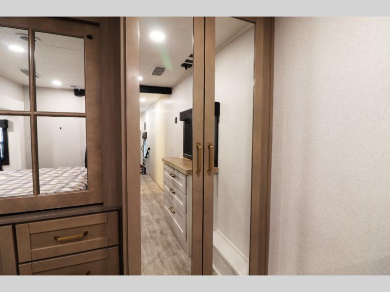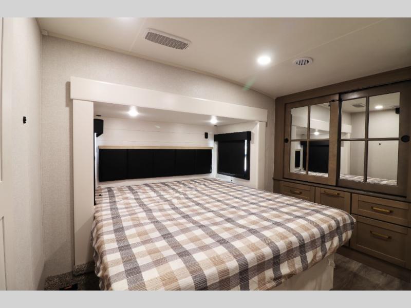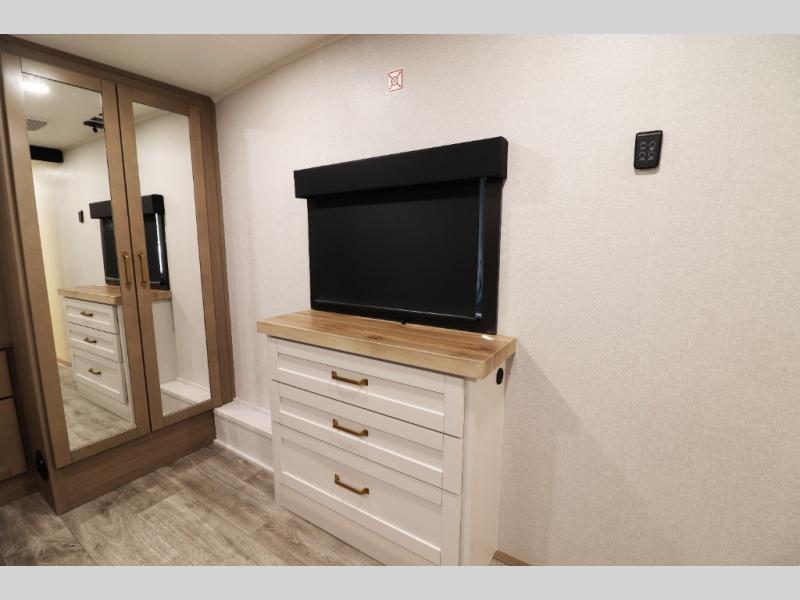 King bed slide-out, walk-in closet with washer/dryer prep, and TV chest in front bedroom.