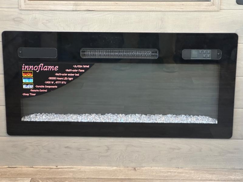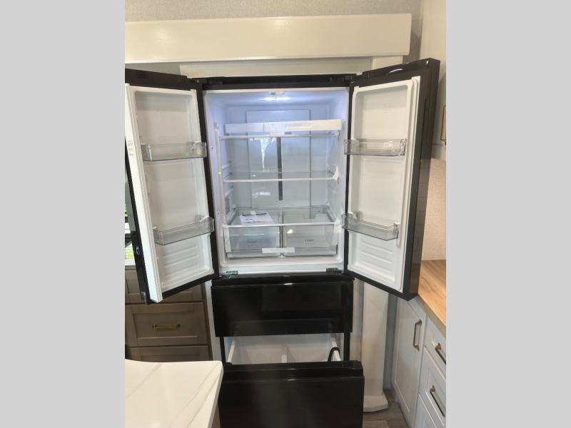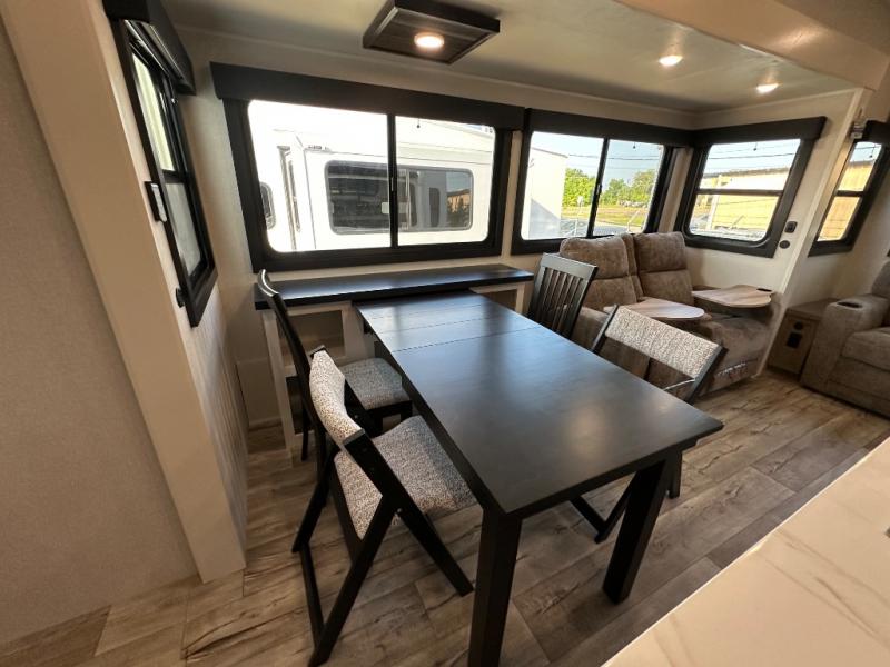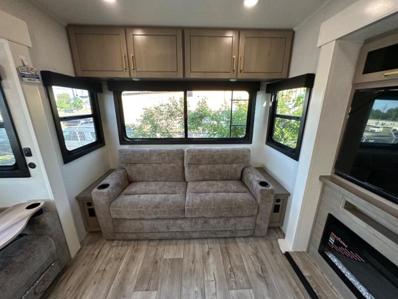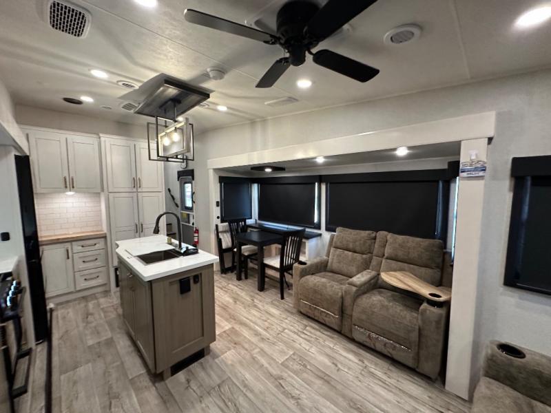 This fifth wheel with four slides is one your whole crew will love! There is a middle bedroom/den with a tri-fold sofa and a desk, allowing this room to become an office if you need it. The loft above this room will be a big hit with the little ones, and the full bath is centrally located so everyone can use it easily. You will have the front private bedroom all to yourselves with a king bed slide out, a chest with TV prep, plus washer and dryer prep in the walk-in closet. The main living area includes everything you need to relax in comfort, like the theater seats, tri-fold sofa, and entertainment center with a fireplace. The chef will enjoy the extra counter space provided by the kitchen island, and there is plenty of storage with the pantry, hutch, and 16 cu. ft. 12V refrigerator. This model even has an outside kitchen, two power awnings, and outside storage for all your gear!