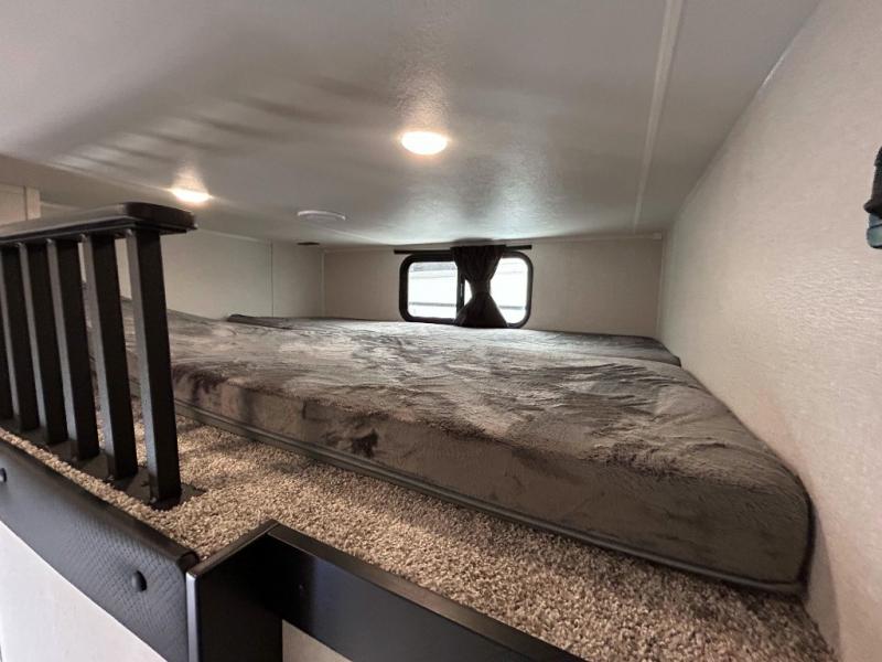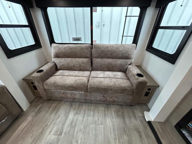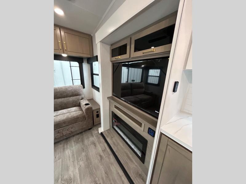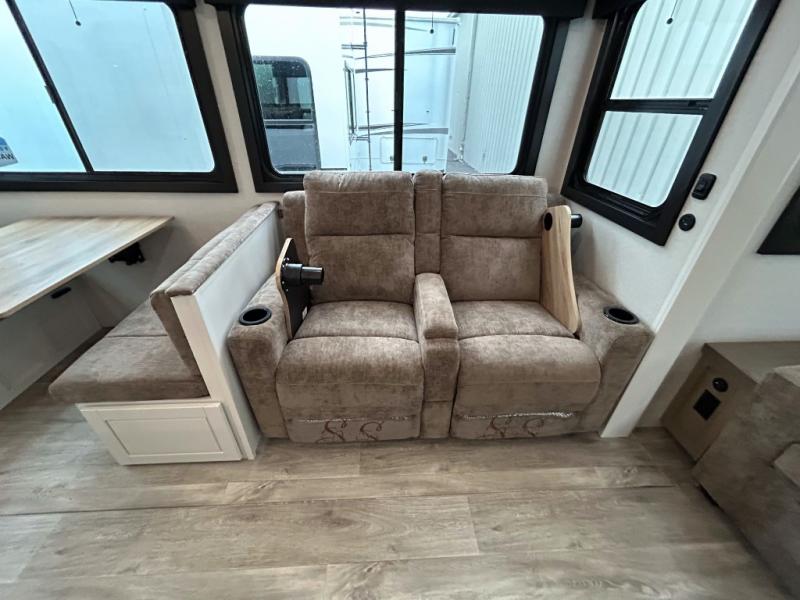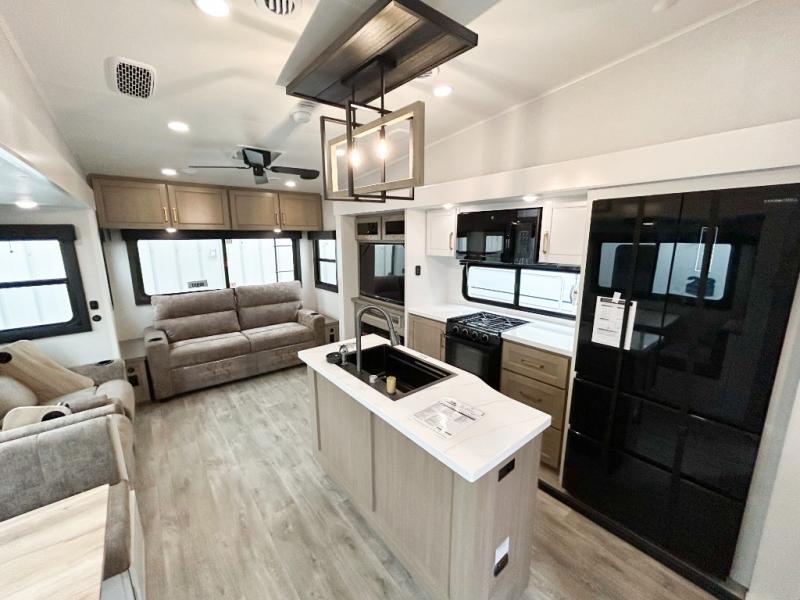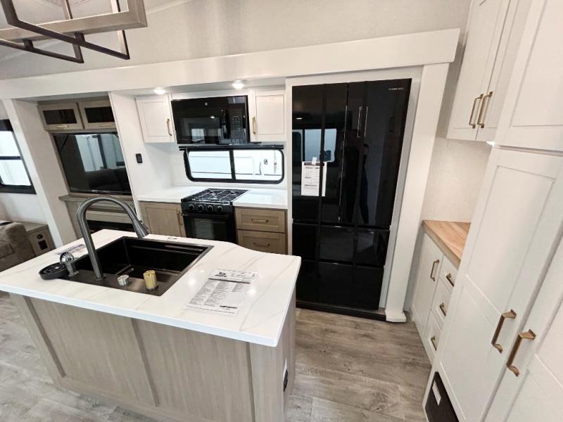 This fifth wheel with four slides is one your whole crew will love! There is a middle bedroom/den with a tri-fold sofa and a desk, allowing this room to become an office if you need it. The loft above this room will be a big hit with the little ones, and the full bath is centrally located so everyone can use it easily. You will have the front private bedroom all to yourselves with a king bed slide out, a chest with TV prep, plus washer and dryer prep in the walk-in closet. The main living area includes everything you need to relax in comfort, like the theater seats, tri-fold sofa, and entertainment center with a fireplace. The chef will enjoy the extra counter space provided by the kitchen island, and there is plenty of storage with the pantry, hutch, and 16 cu. ft. 12V refrigerator. This model even has an outside kitchen, two power awnings, and outside storage for all your gear!