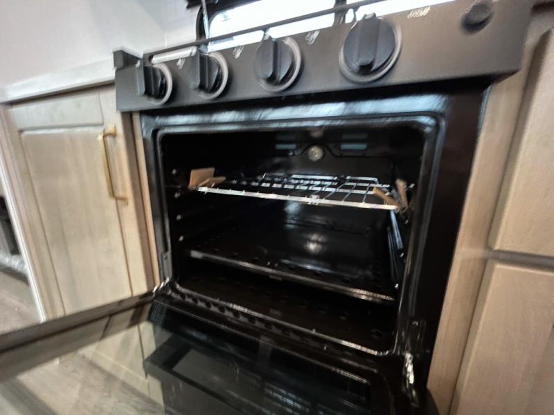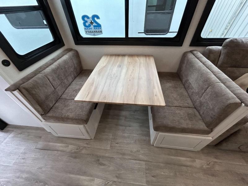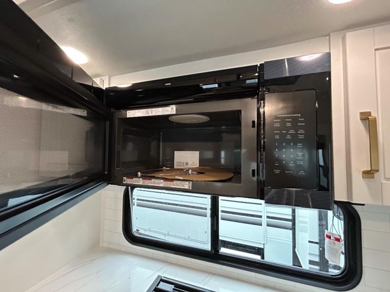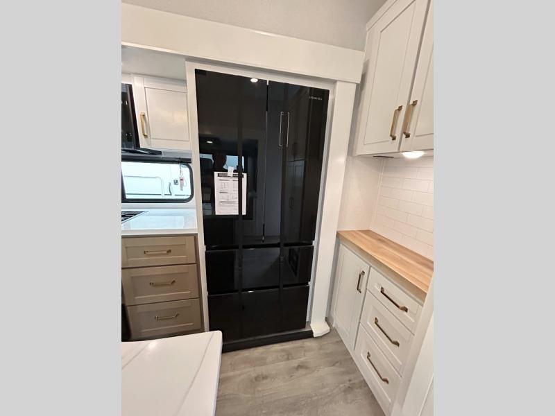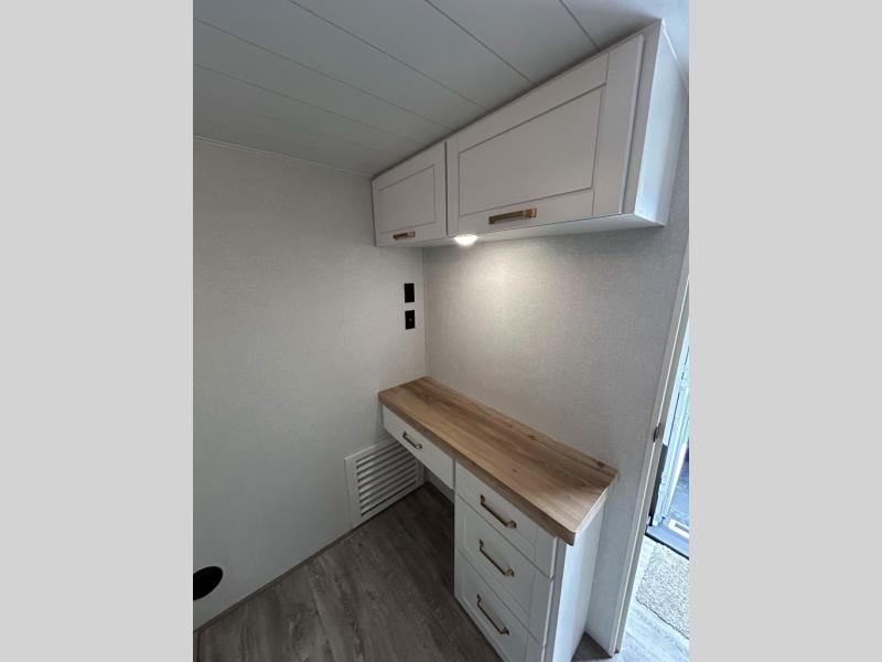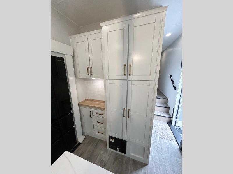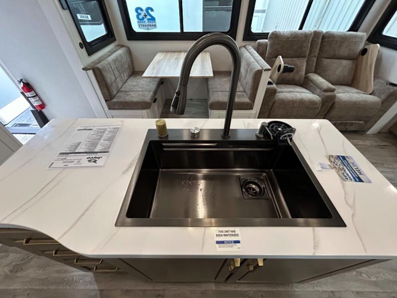 This fifth wheel with four slides is one your whole crew will love! There is a middle bedroom/den with a tri-fold sofa and a desk, allowing this room to become an office if you need it. The loft above this room will be a big hit with the little ones, and the full bath is centrally located so everyone can use it easily. You will have the front private bedroom all to yourselves with a king bed slide out, a chest with TV prep, plus washer and dryer prep in the walk-in closet. The main living area includes everything you need to relax in comfort, like the theater seats, tri-fold sofa, and entertainment center with a fireplace. The chef will enjoy the extra counter space provided by the kitchen island, and there is plenty of storage with the pantry, hutch, and 16 cu. ft. 12V refrigerator. This model even has an outside kitchen, two power awnings, and outside storage for all your gear!