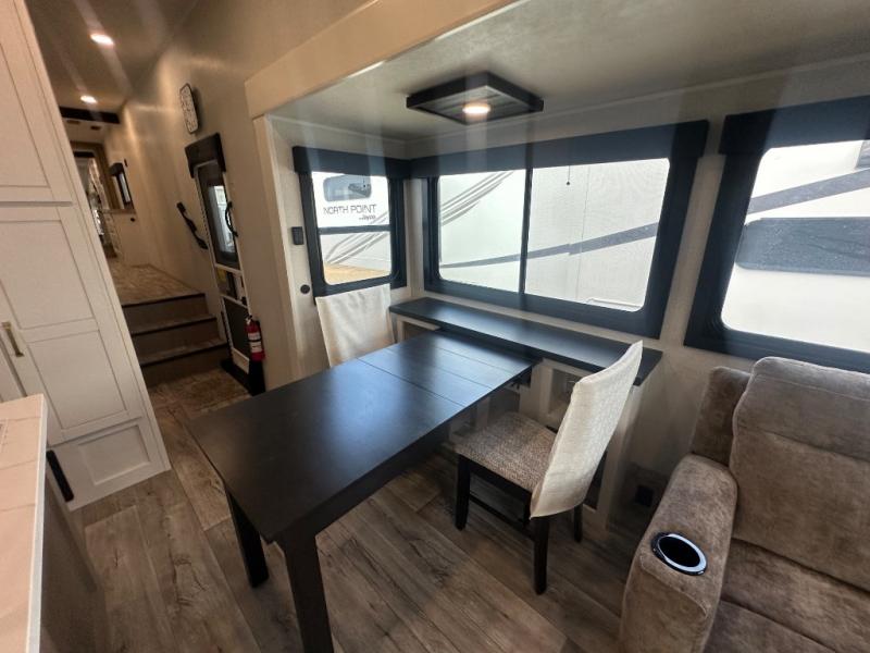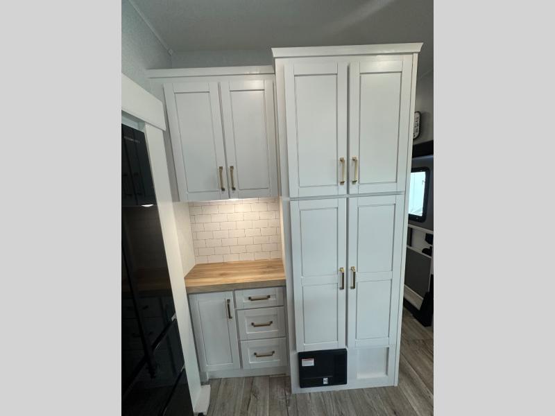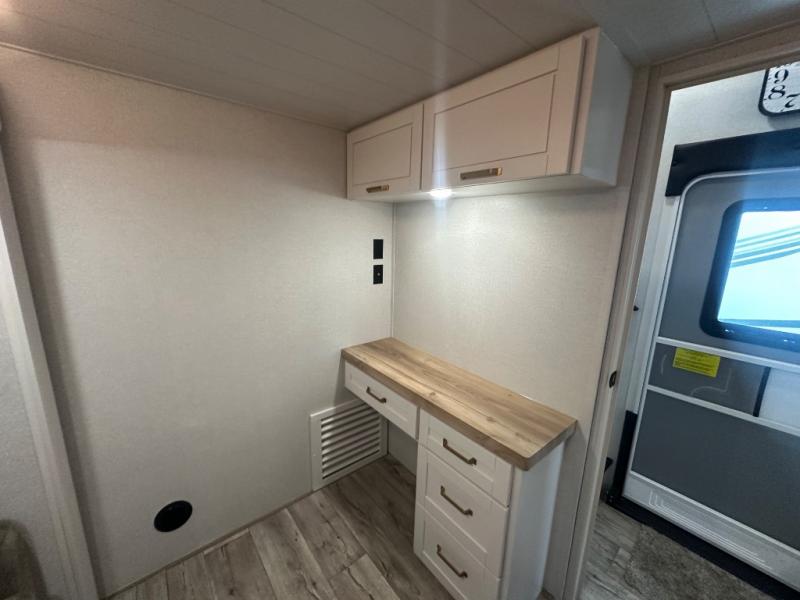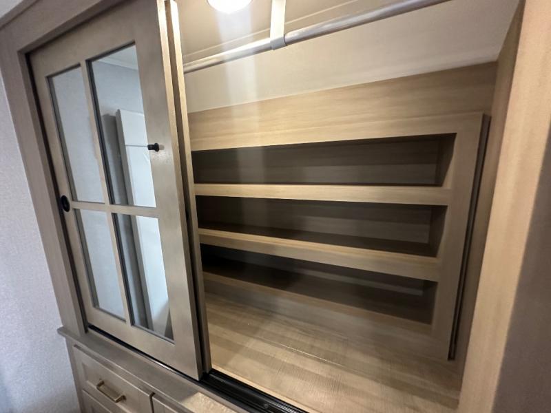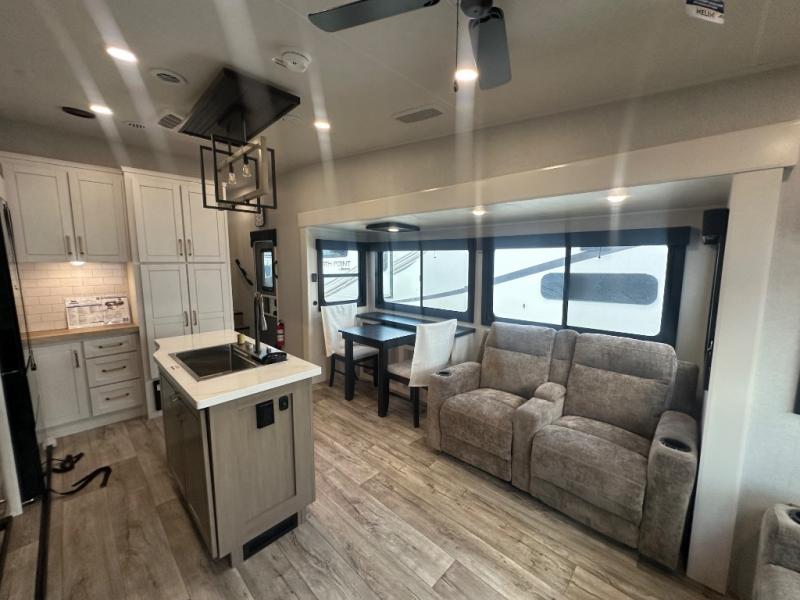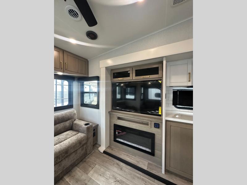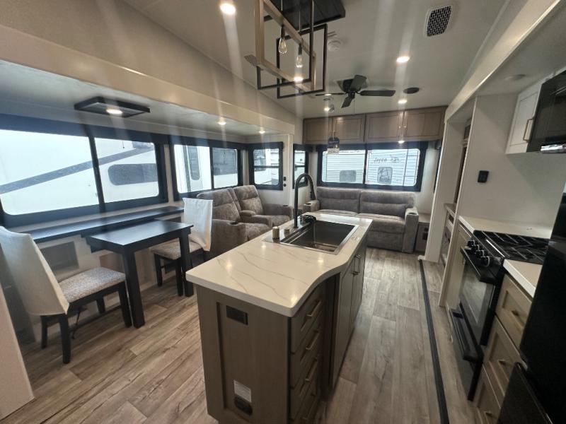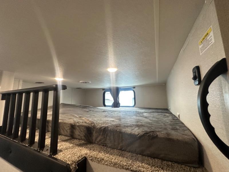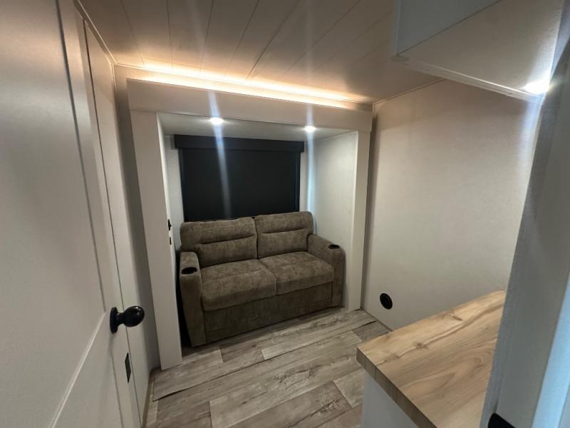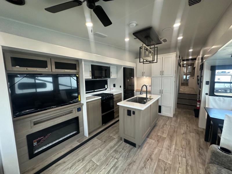 This fifth wheel with four slides is one your whole crew will love! There is a middle bedroom/den with a tri-fold sofa and a desk, allowing this room to become an office if you need it. The loft above this room will be a big hit with the little ones, and the full bath is centrally located so everyone can use it easily. You will have the front private bedroom all to yourselves with a king bed slide out, a chest with TV prep, plus washer and dryer prep in the walk-in closet. The main living area includes everything you need to relax in comfort, like the theater seats, tri-fold sofa, and entertainment center with a fireplace. The chef will enjoy the extra counter space provided by the kitchen island, and there is plenty of storage with the pantry, hutch, and 16 cu. ft. 12V refrigerator. This model even has an outside kitchen, two power awnings, and outside storage for all your gear!