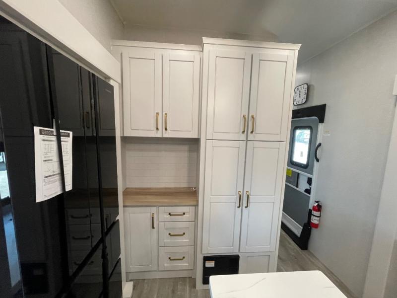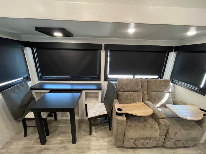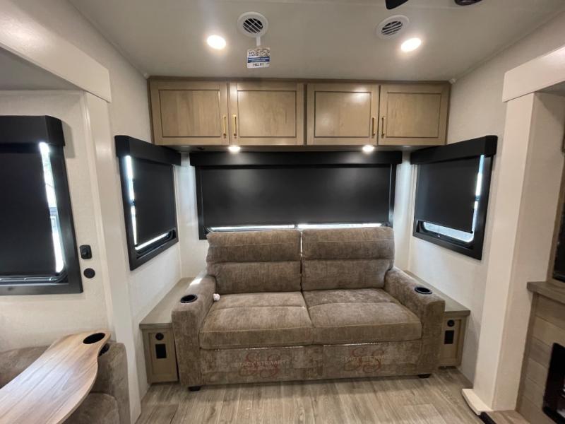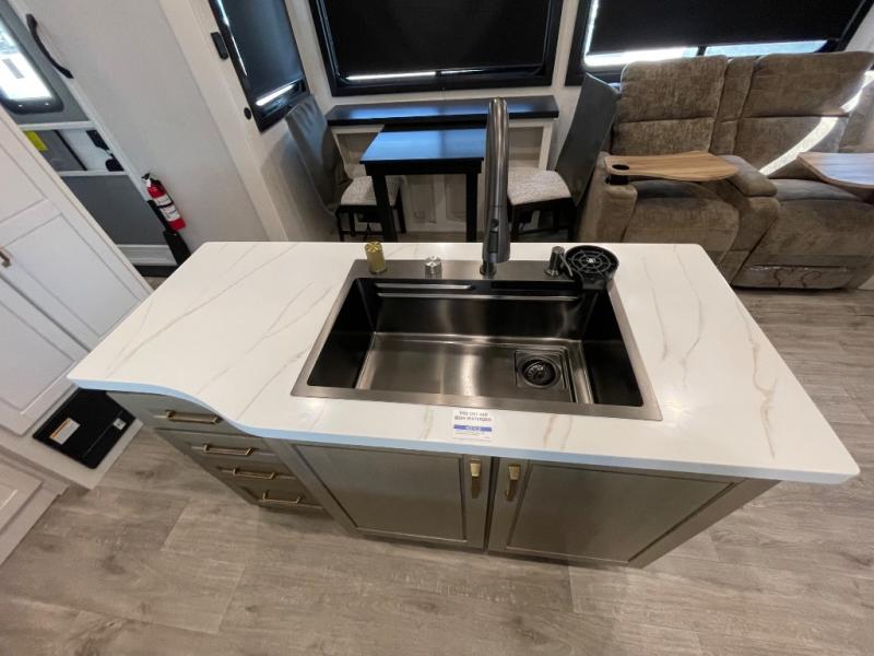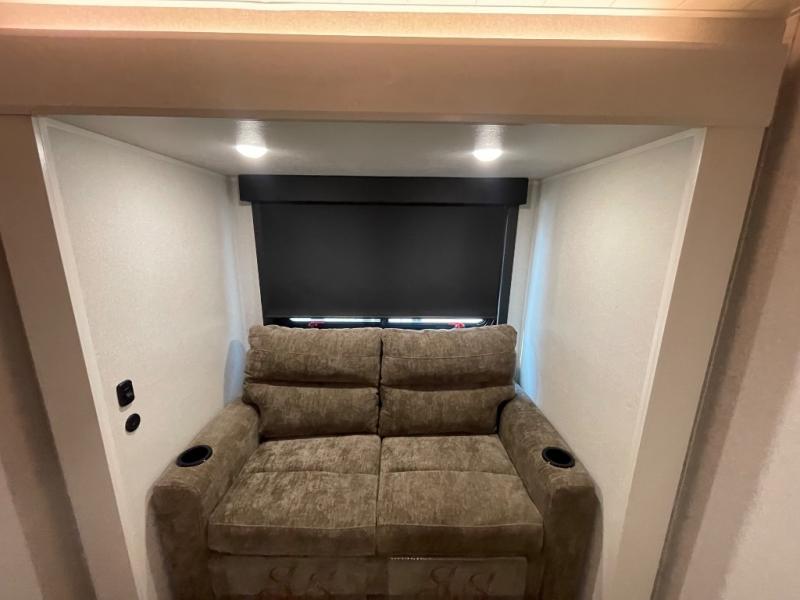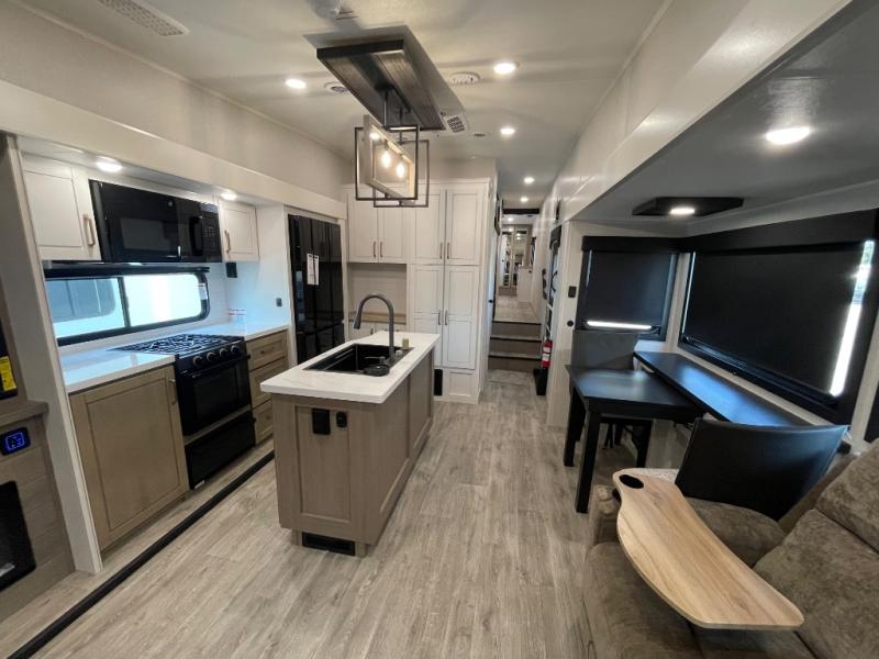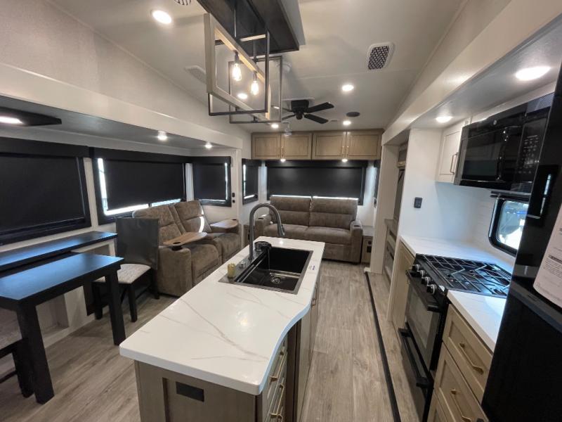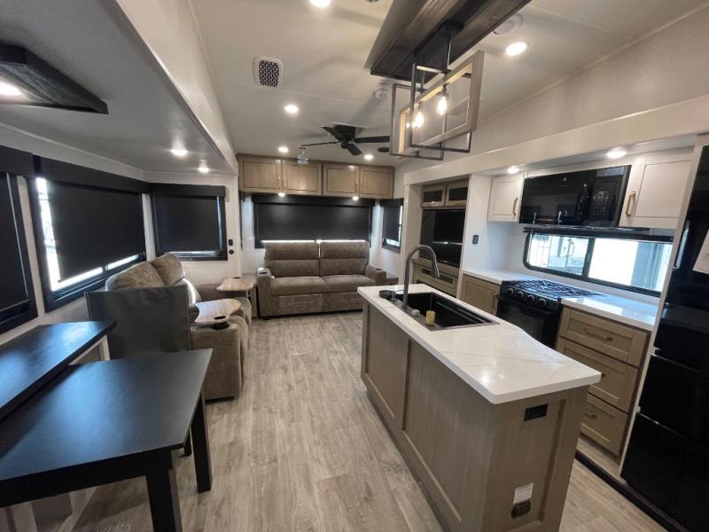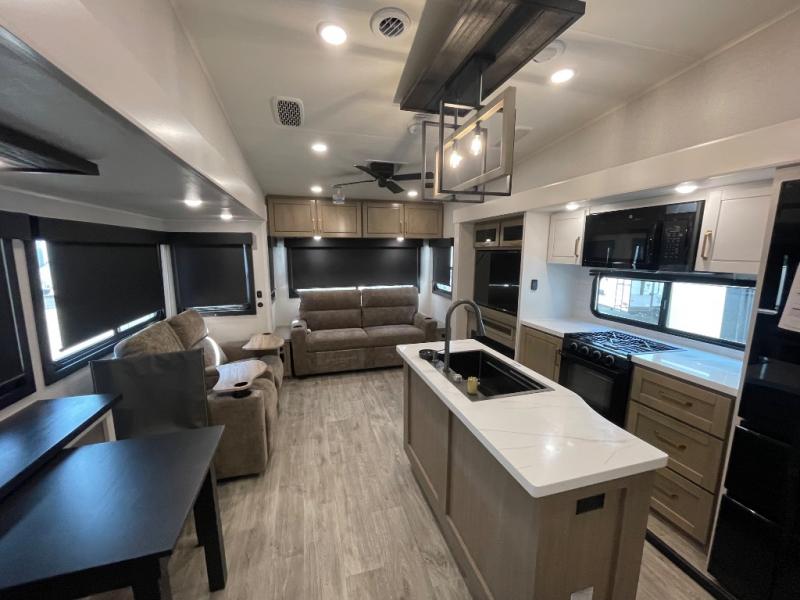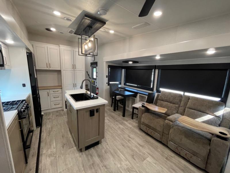 This fifth wheel with four slides is one your whole crew will love! There is a middle bedroom/den with a tri-fold sofa and a desk, allowing this room to become an office if you need it. The loft above this room will be a big hit with the little ones, and the full bath is centrally located so everyone can use it easily. You will have the front private bedroom all to yourselves with a king bed slide out, a chest with TV prep, plus washer and dryer prep in the walk-in closet. The main living area includes everything you need to relax in comfort, like the theater seats, tri-fold sofa, and entertainment center with a fireplace. The chef will enjoy the extra counter space provided by the kitchen island, and there is plenty of storage with the pantry, hutch, and 16 cu. ft. 12V refrigerator. This model even has an outside kitchen, two power awnings, and outside storage for all your gear!