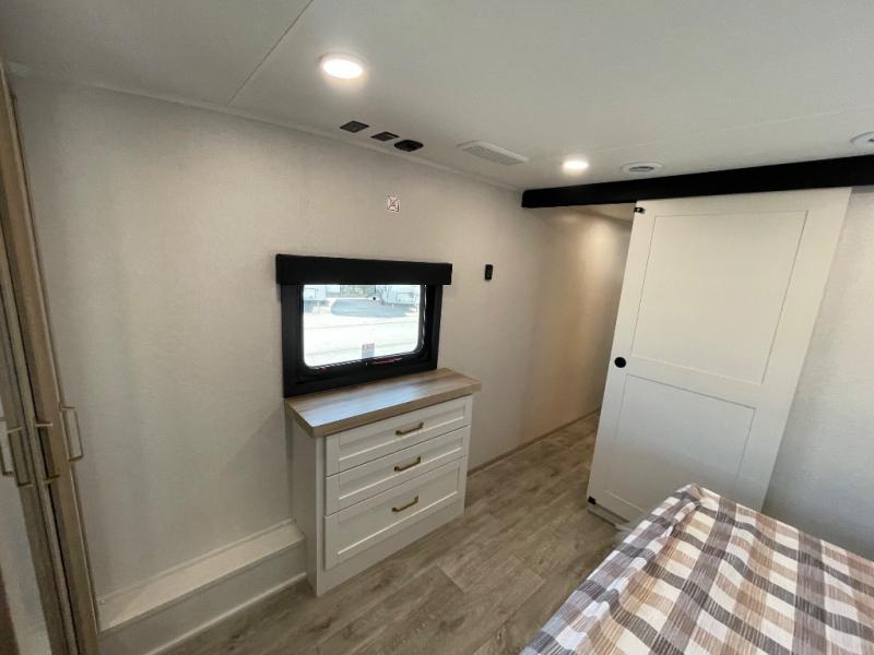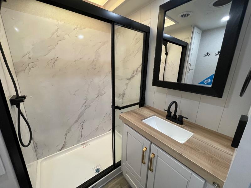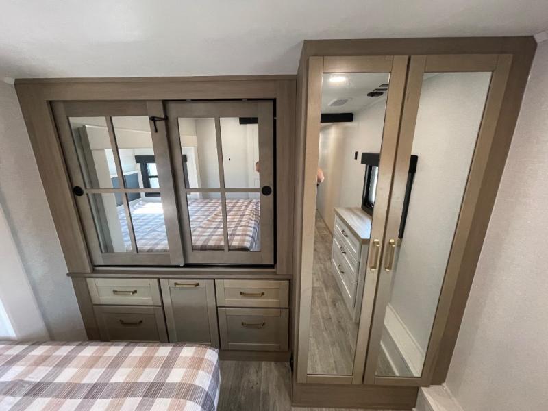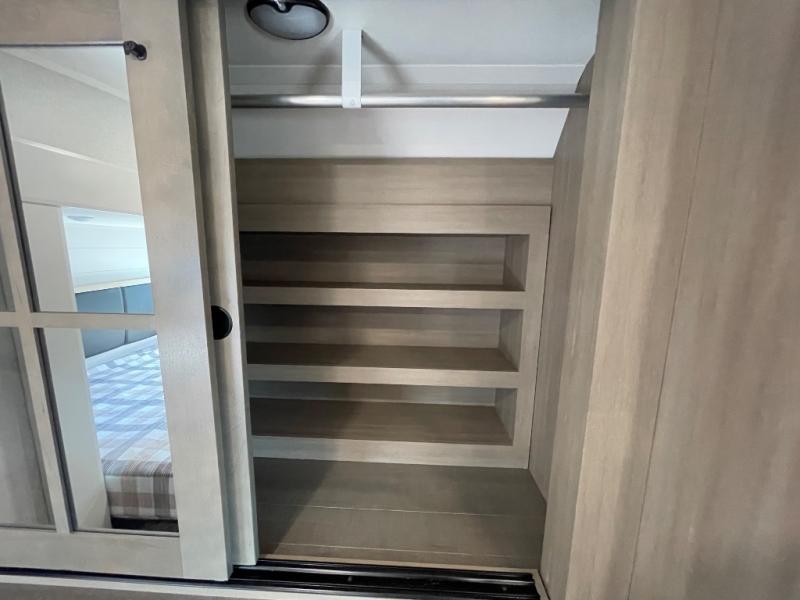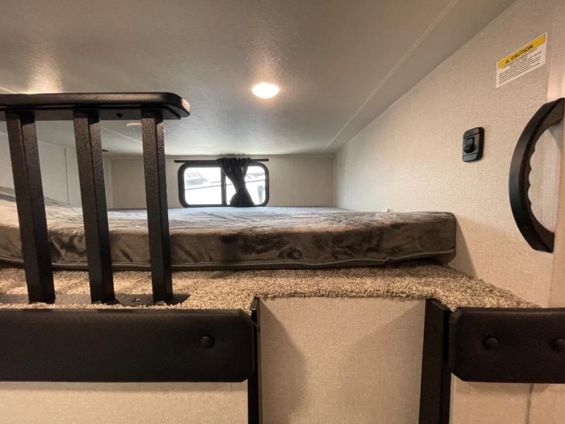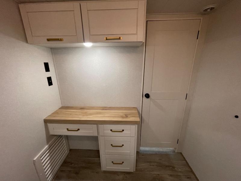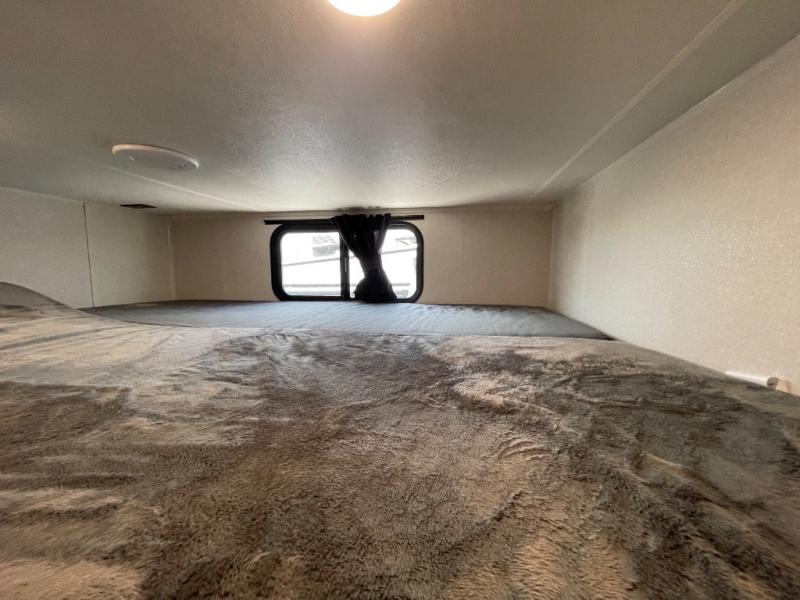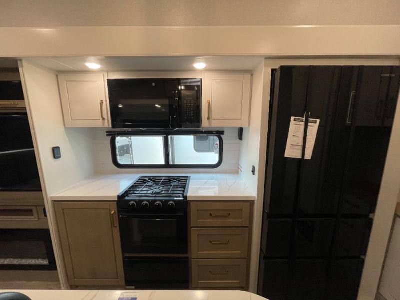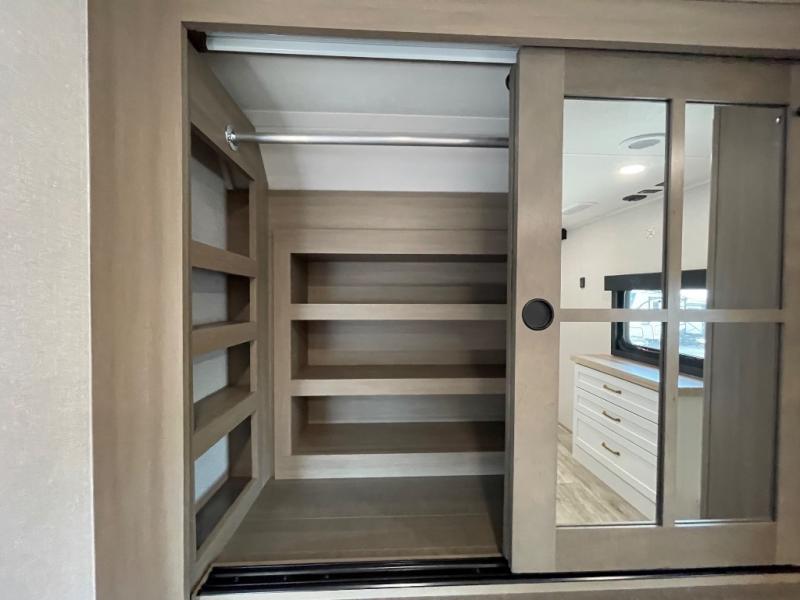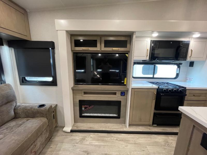 This fifth wheel with four slides is one your whole crew will love! There is a middle bedroom/den with a tri-fold sofa and a desk, allowing this room to become an office if you need it. The loft above this room will be a big hit with the little ones, and the full bath is centrally located so everyone can use it easily. You will have the front private bedroom all to yourselves with a king bed slide out, a chest with TV prep, plus washer and dryer prep in the walk-in closet. The main living area includes everything you need to relax in comfort, like the theater seats, tri-fold sofa, and entertainment center with a fireplace. The chef will enjoy the extra counter space provided by the kitchen island, and there is plenty of storage with the pantry, hutch, and 16 cu. ft. 12V refrigerator. This model even has an outside kitchen, two power awnings, and outside storage for all your gear!
