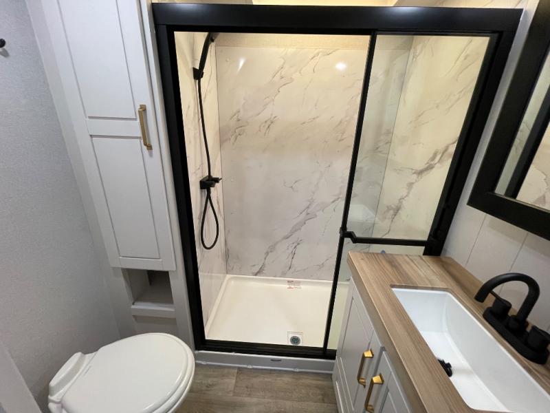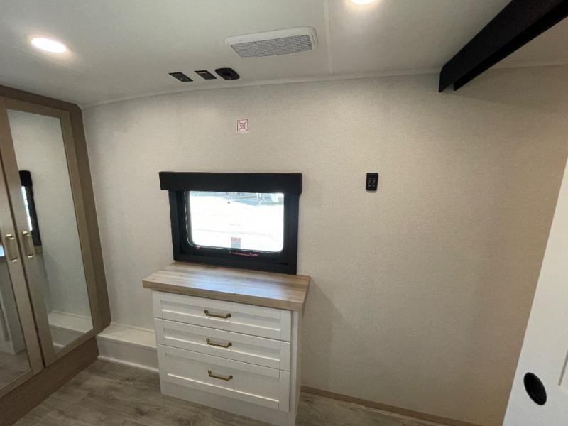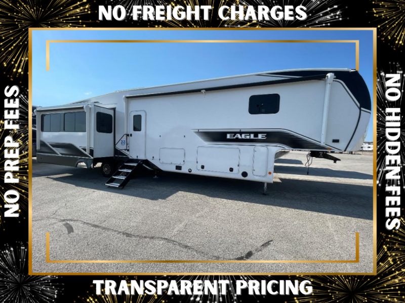 With any Eagle fifth wheel by Jayco you will appreciate durable construction materials, like the Magnum Truss Roof and the Stronghold VBL laminated walls. The JAYCOMMAND Smart RV system puts you in control of your RV's functions, and the 5 Star Handling Package will provide smooth towing from home to camp. Each model features Climate Shield zero-degree tested weather protection and the industry-exclusive HELIX cooling system that features two 15,000 BTU Whisper Quiet A/C's to keep you comfortable year around. Some of the exterior conveniences you are sure to love are the pass-through storage with Slam-Latch baggage doors and an automotive style front cap with max turn radius. The Eagle fifth wheels are designed to make you feel at home with solid hardwood slide fascia, residential vinyl flooring throughout, 100% no floor vents, and blackout roller shades with reflective side throughout for added privacy and insulation.