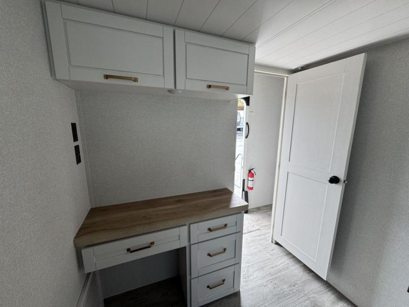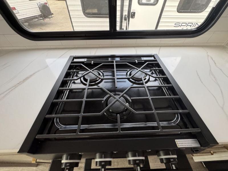 This fifth wheel with four slides is one your whole crew will love! There is a middle bedroom/den with a tri-fold sofa and a desk, allowing this room to become an office if you need it. The loft above this room will be a big hit with the little ones, and the full bath is centrally located so everyone can use it easily. You will have the front private bedroom all to yourselves with a king bed slide out, a chest with TV prep, plus washer and dryer prep in the walk-in closet. The main living area includes everything you need to relax in comfort, like the theater seats, tri-fold sofa, and entertainment center with a fireplace. The chef will enjoy the extra counter space provided by the kitchen island, and there is plenty of storage with the pantry, hutch, and 16 cu. ft. 12V refrigerator. This model even has an outside kitchen, two power awnings, and outside storage for all your gear!