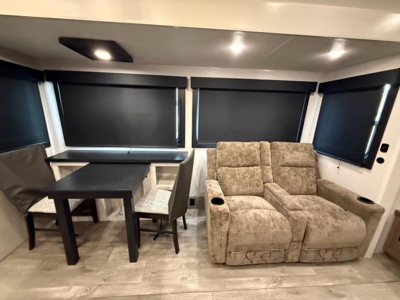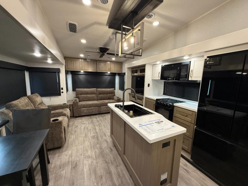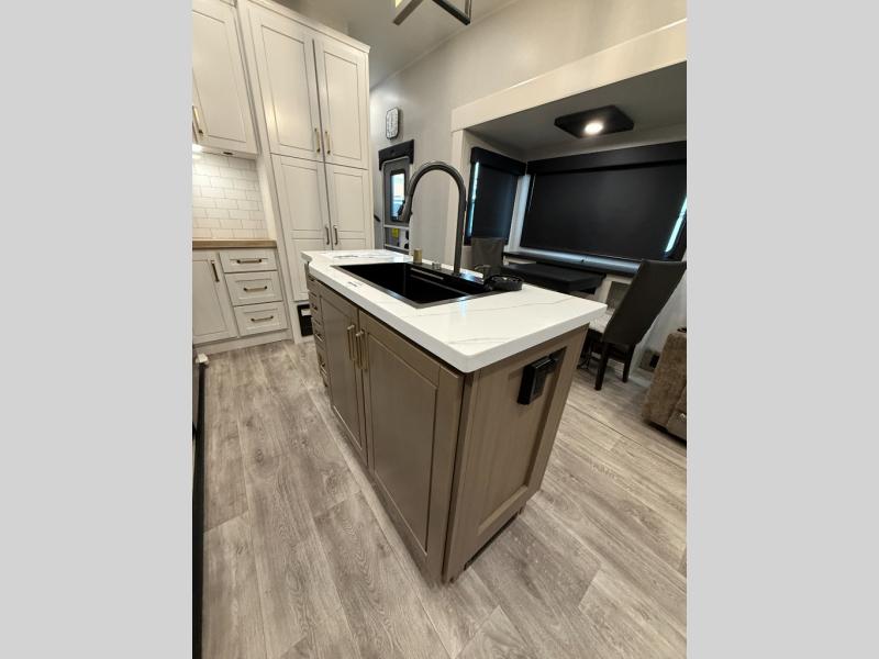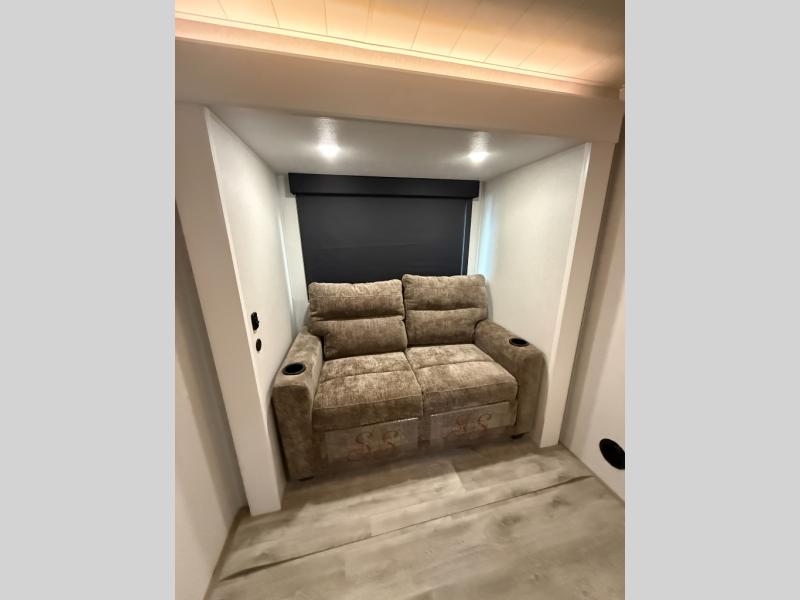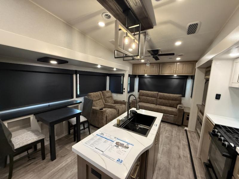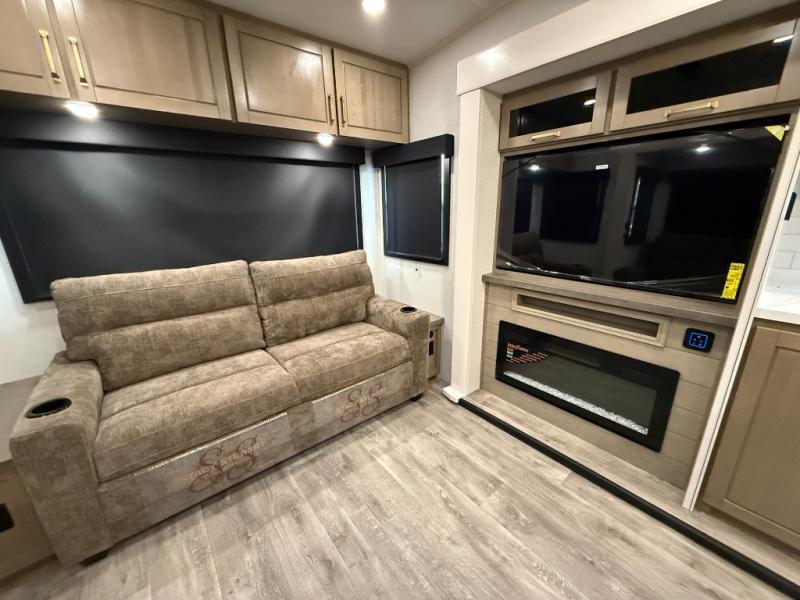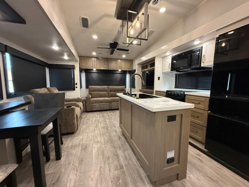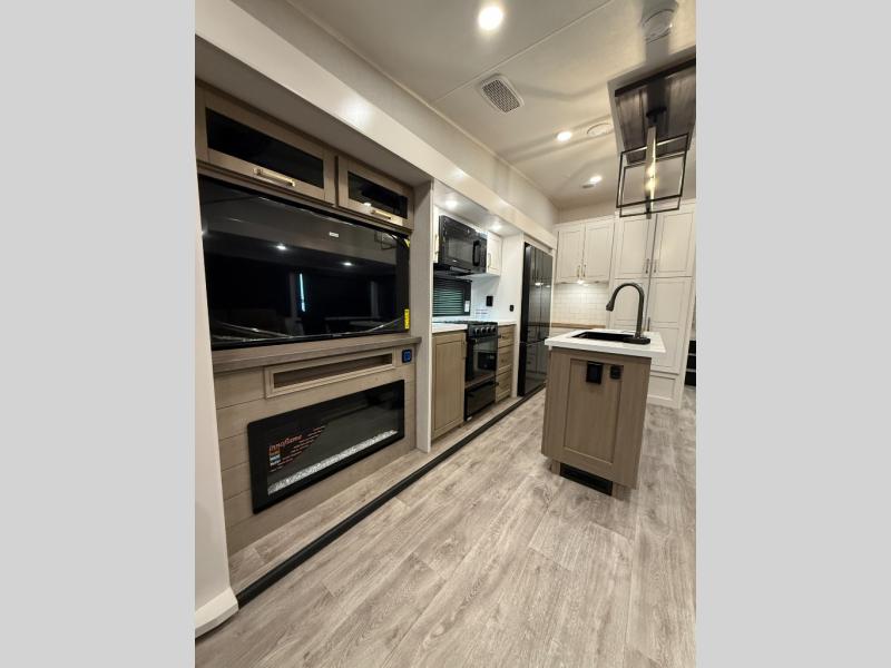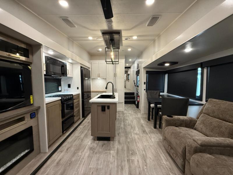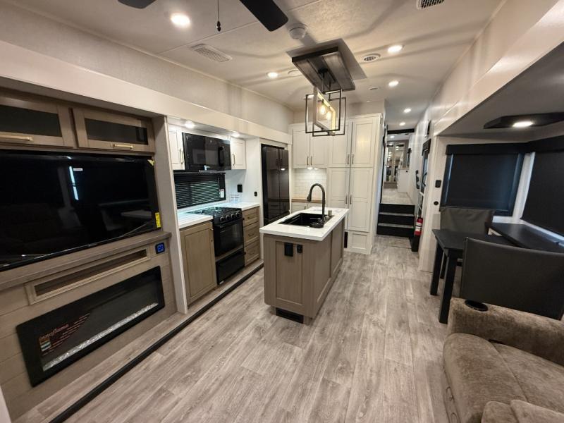 This fifth wheel with four slides is one your whole crew will love! There is a middle bedroom/den with a tri-fold sofa and a desk, allowing this room to become an office if you need it. The loft above this room will be a big hit with the little ones, and the full bath is centrally located so everyone can use it easily. You will have the front private bedroom all to yourselves with a king bed slide out, a chest with TV prep, plus washer and dryer prep in the walk-in closet. The main living area includes everything you need to relax in comfort, like the theater seats, tri-fold sofa, and entertainment center with a fireplace. The chef will enjoy the extra counter space provided by the kitchen island, and there is plenty of storage with the pantry, hutch, and 16 cu. ft. 12V refrigerator. This model even has an outside kitchen, two power awnings, and outside storage for all your gear!