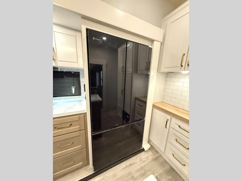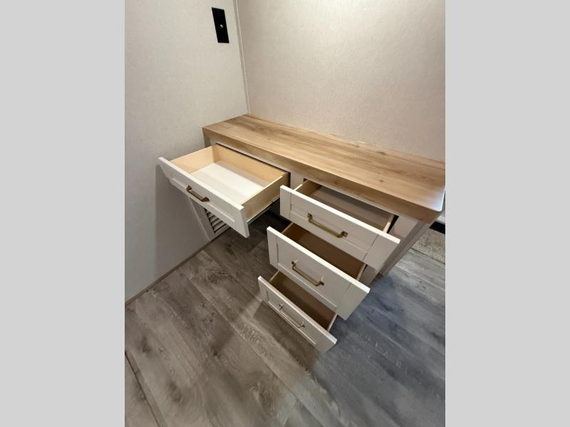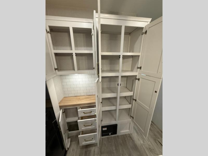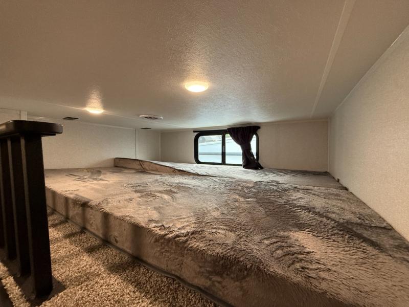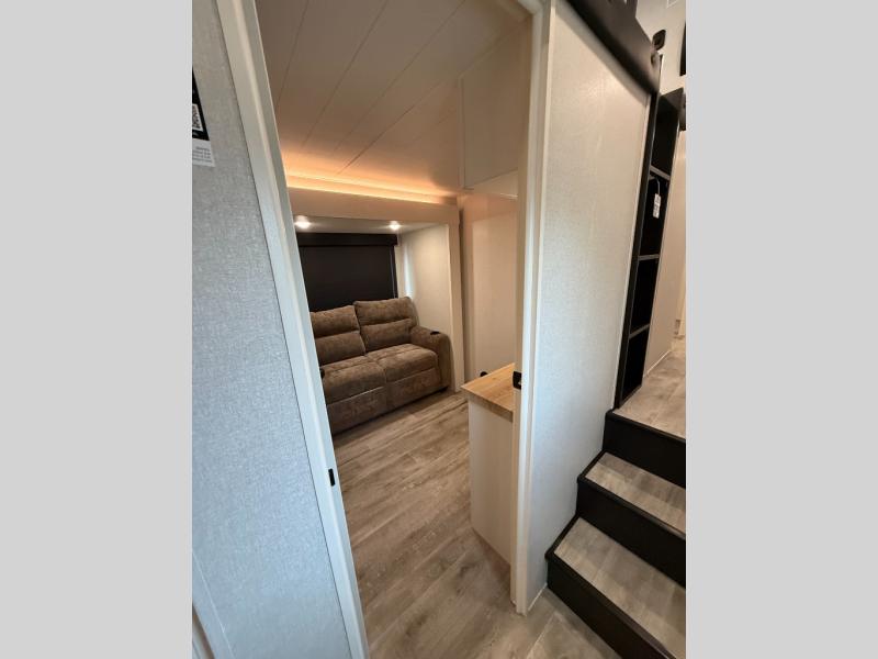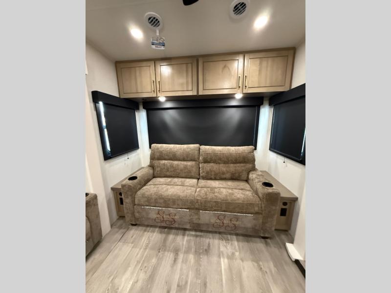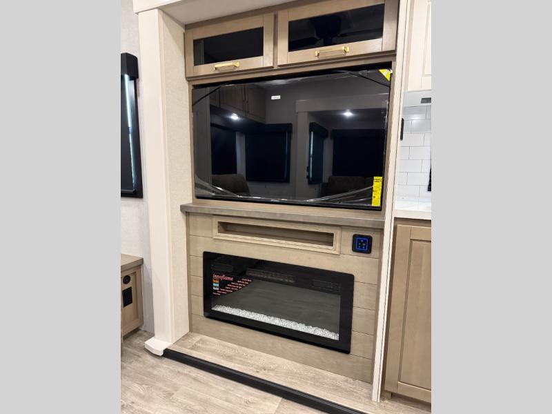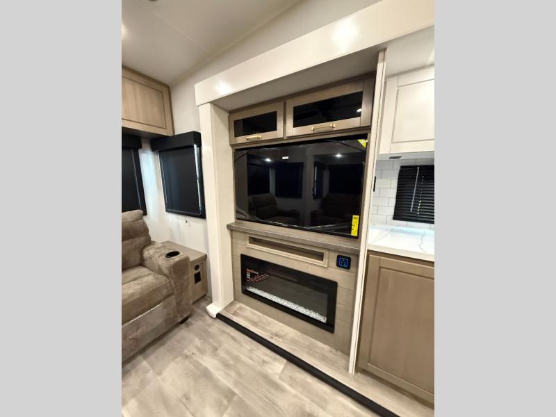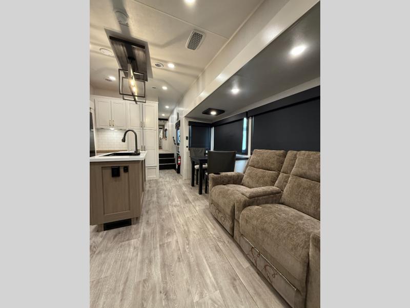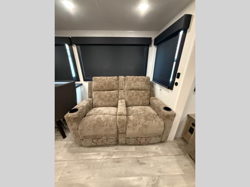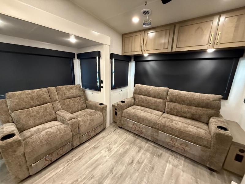 This fifth wheel with four slides is one your whole crew will love! There is a middle bedroom/den with a tri-fold sofa and a desk, allowing this room to become an office if you need it. The loft above this room will be a big hit with the little ones, and the full bath is centrally located so everyone can use it easily. You will have the front private bedroom all to yourselves with a king bed slide out, a chest with TV prep, plus washer and dryer prep in the walk-in closet. The main living area includes everything you need to relax in comfort, like the theater seats, tri-fold sofa, and entertainment center with a fireplace. The chef will enjoy the extra counter space provided by the kitchen island, and there is plenty of storage with the pantry, hutch, and 16 cu. ft. 12V refrigerator. This model even has an outside kitchen, two power awnings, and outside storage for all your gear!