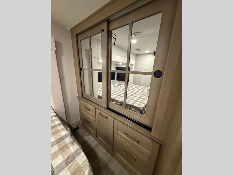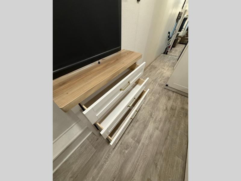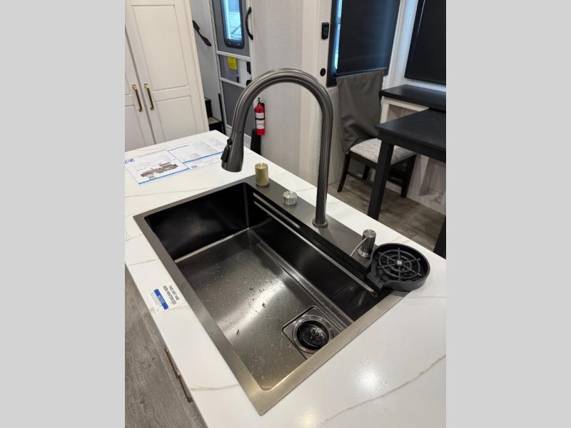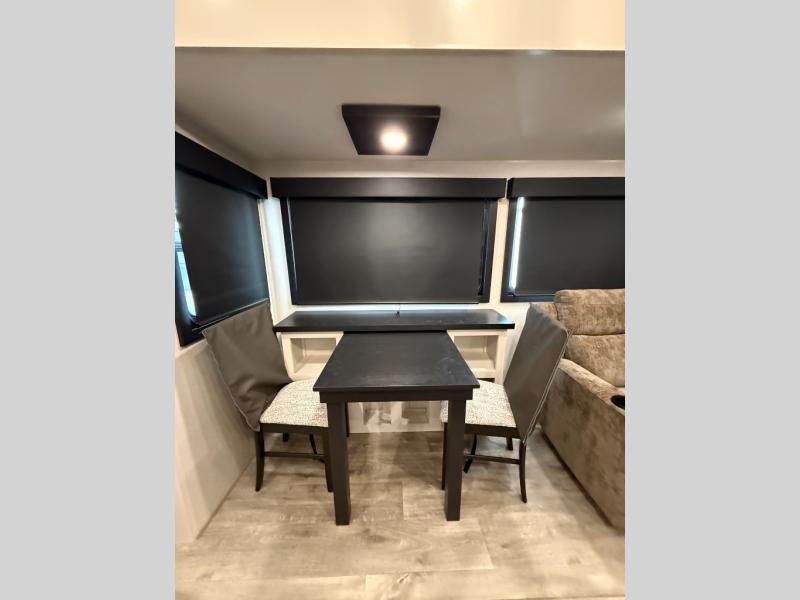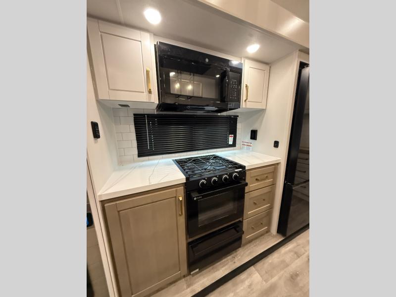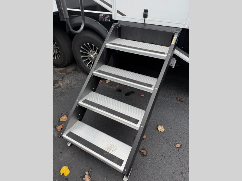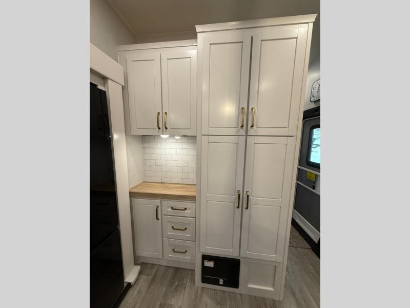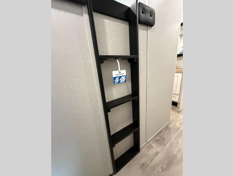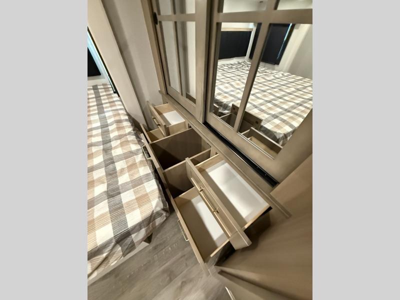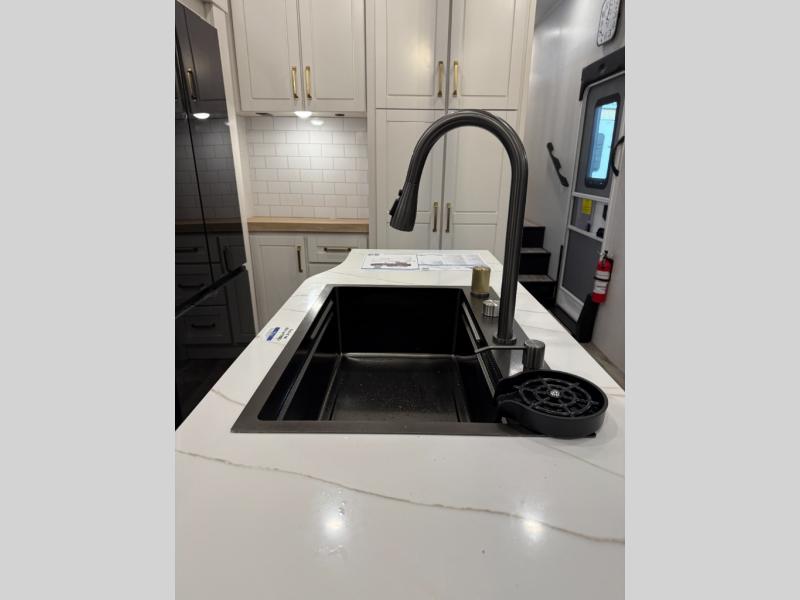 This fifth wheel with four slides is one your whole crew will love! There is a middle bedroom/den with a tri-fold sofa and a desk, allowing this room to become an office if you need it. The loft above this room will be a big hit with the little ones, and the full bath is centrally located so everyone can use it easily. You will have the front private bedroom all to yourselves with a king bed slide out, a chest with TV prep, plus washer and dryer prep in the walk-in closet. The main living area includes everything you need to relax in comfort, like the theater seats, tri-fold sofa, and entertainment center with a fireplace. The chef will enjoy the extra counter space provided by the kitchen island, and there is plenty of storage with the pantry, hutch, and 16 cu. ft. 12V refrigerator. This model even has an outside kitchen, two power awnings, and outside storage for all your gear!