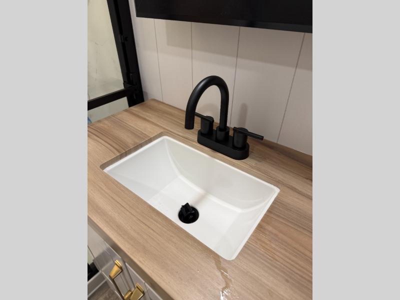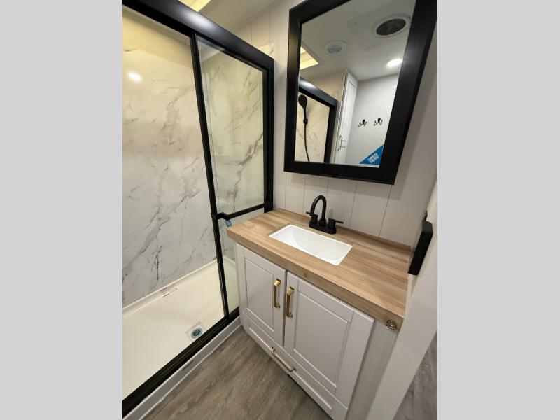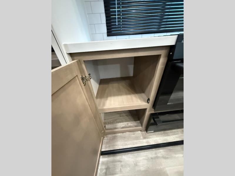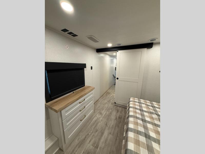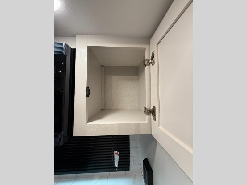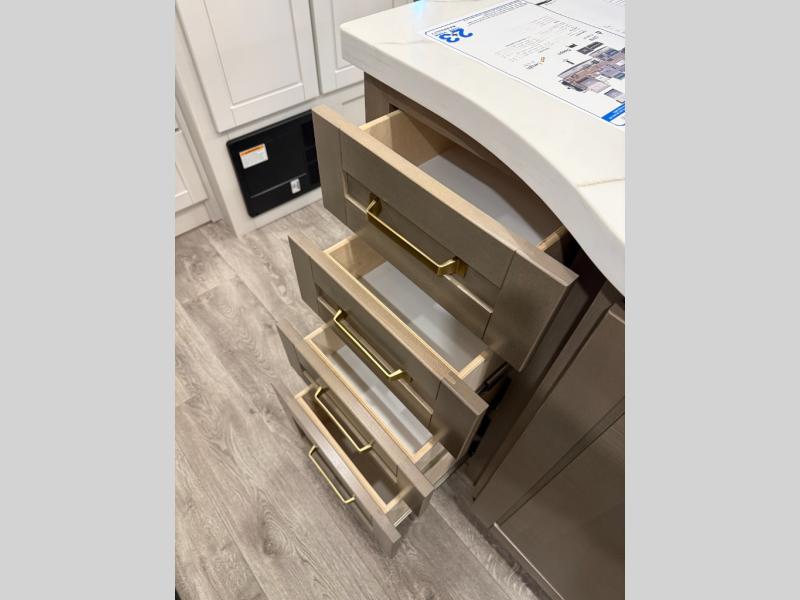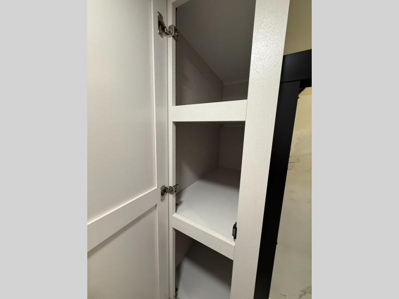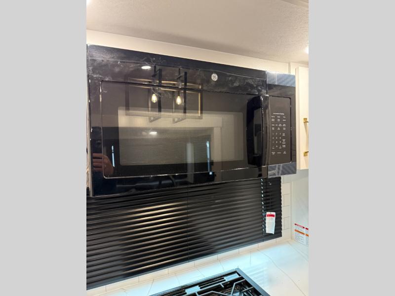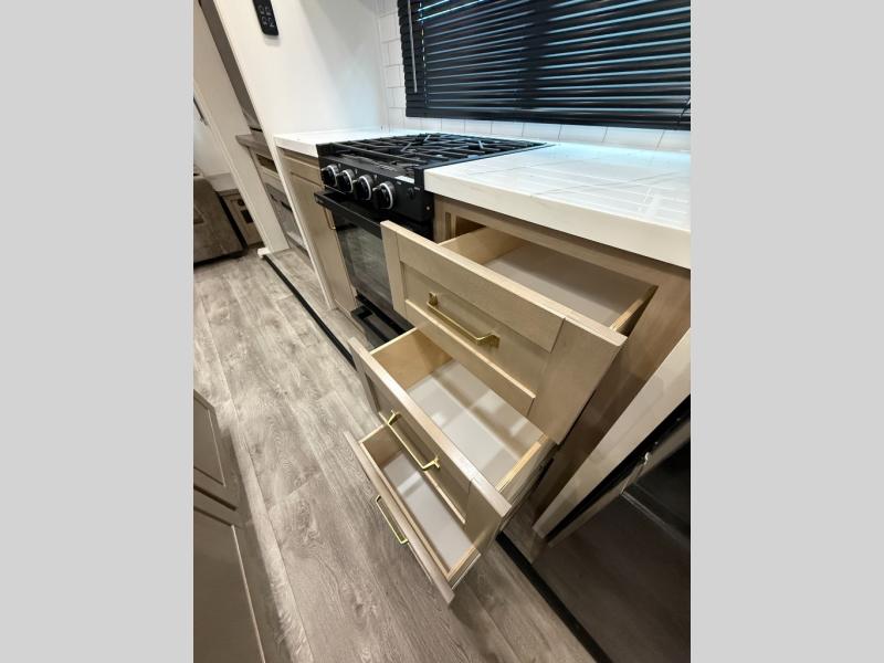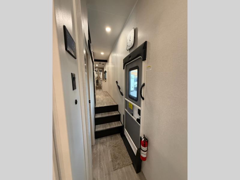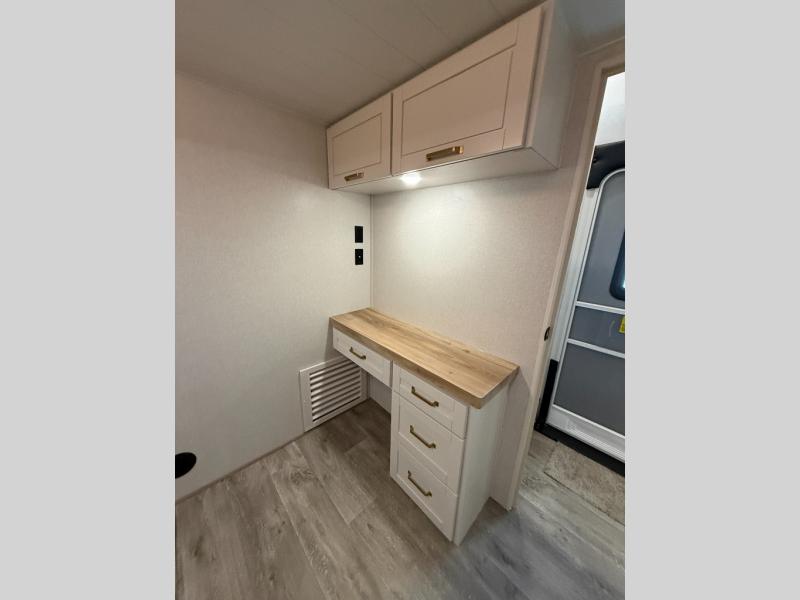This fifth wheel with four slides is one your whole crew will love! There is a middle bedroom/den with a tri-fold sofa and a desk, allowing this room to become an office if you need it. The loft above this room will be a big hit with the little ones, and the full bath is centrally located so everyone can use it easily. You will have the front private bedroom all to yourselves with a king bed slide out, a chest with TV prep, plus washer and dryer prep in the walk-in closet. The main living area includes everything you need to relax in comfort, like the theater seats, tri-fold sofa, and entertainment center with a fireplace. The chef will enjoy the extra counter space provided by the kitchen island, and there is plenty of storage with the pantry, hutch, and 16 cu. ft. 12V refrigerator. This model even has an outside kitchen, two power awnings, and outside storage for all your gear!