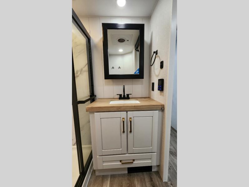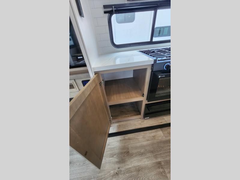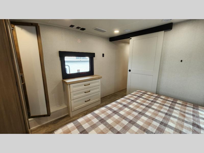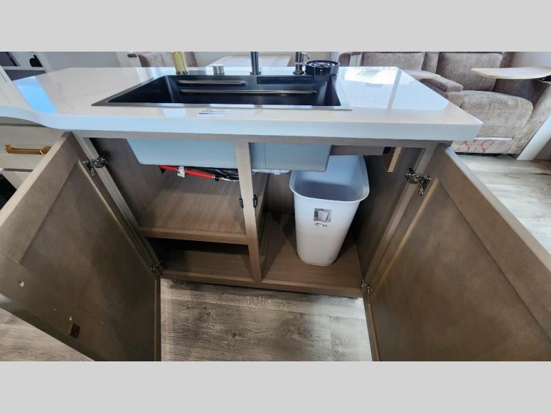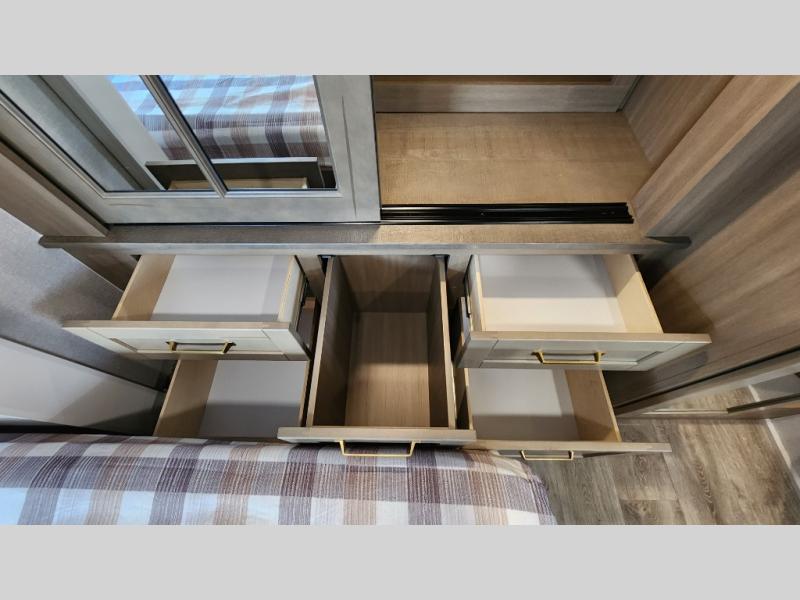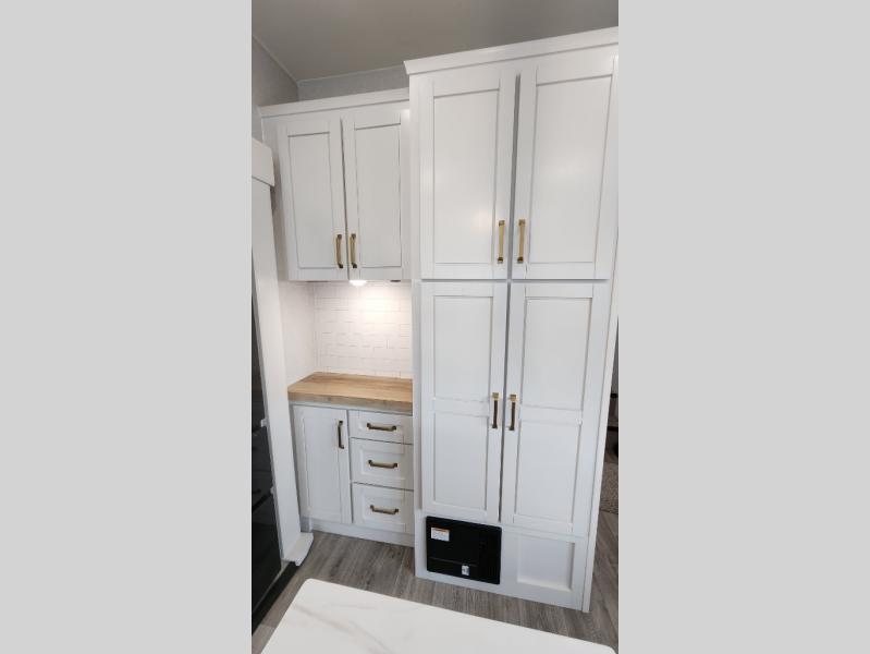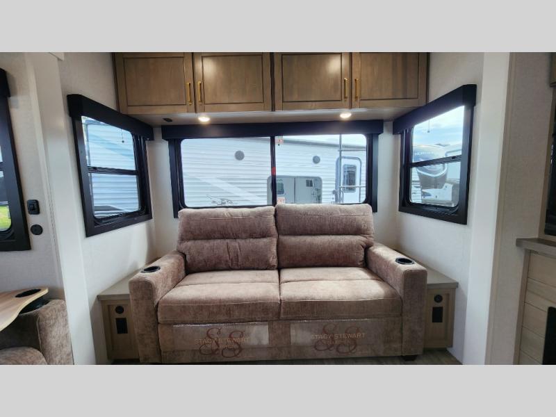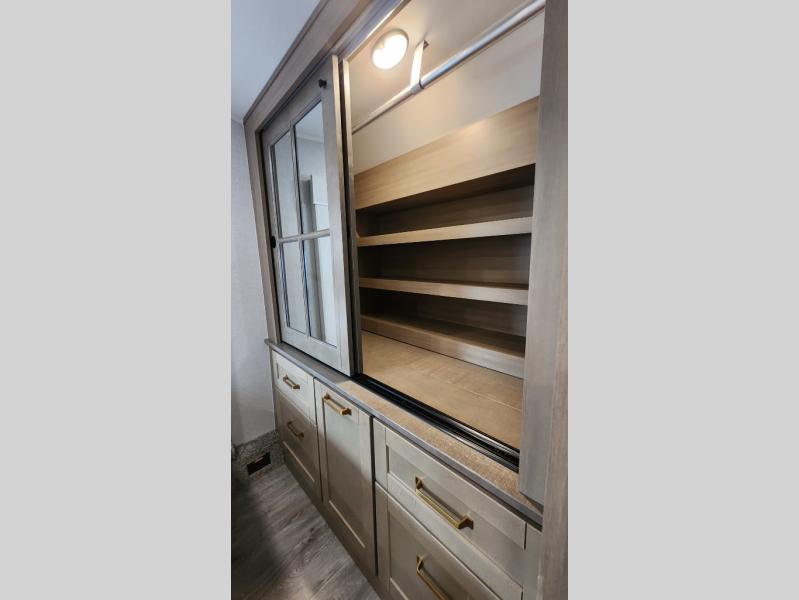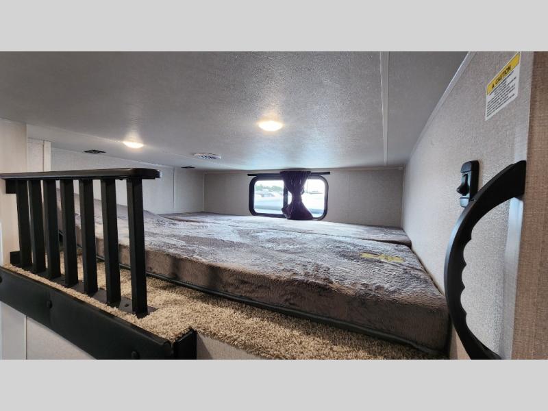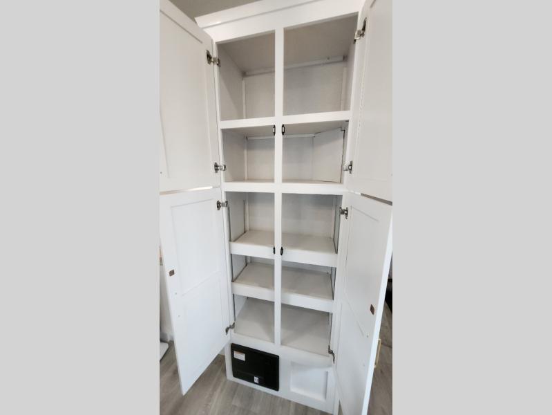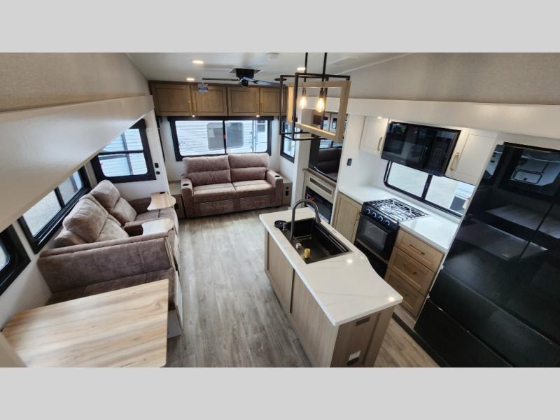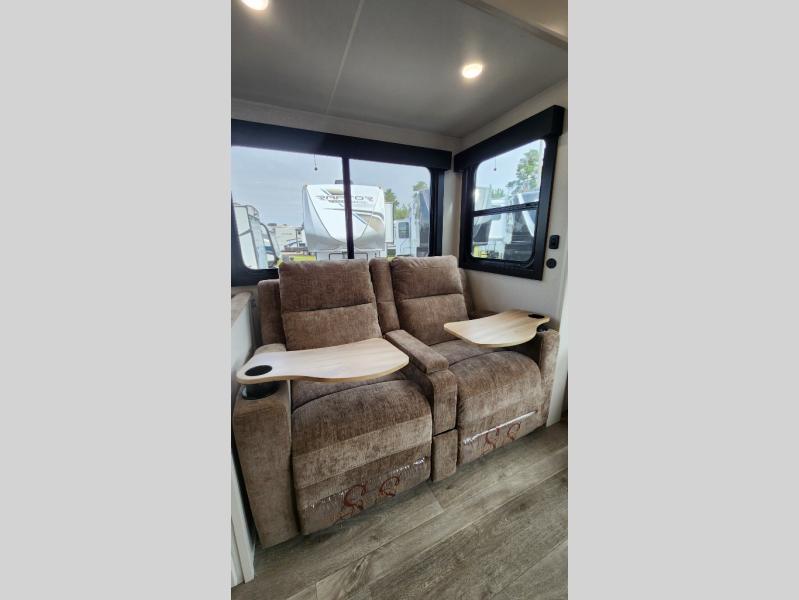 This fifth wheel with four slides is one your whole crew will love! There is a middle bedroom/den with a tri-fold sofa and a desk, allowing this room to become an office if you need it. The loft above this room will be a big hit with the little ones, and the full bath is centrally located so everyone can use it easily. You will have the front private bedroom all to yourselves with a king bed slide out, a chest with TV prep, plus washer and dryer prep in the walk-in closet. The main living area includes everything you need to relax in comfort, like the theater seats, tri-fold sofa, and entertainment center with a fireplace. The chef will enjoy the extra counter space provided by the kitchen island, and there is plenty of storage with the pantry, hutch, and 16 cu. ft. 12V refrigerator. This model even has an outside kitchen, two power awnings, and outside storage for all your gear!