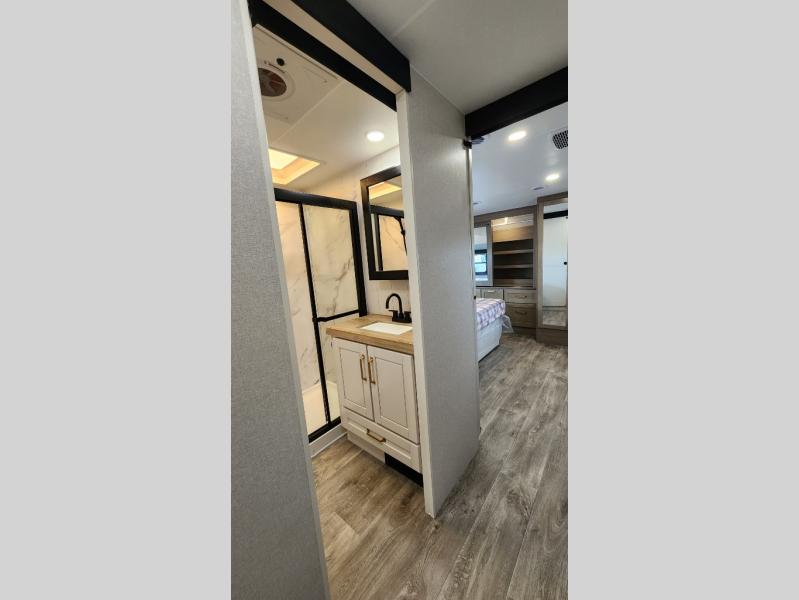 With any Eagle fifth wheel by Jayco you will appreciate durable construction materials, like the Magnum Truss Roof and the Stronghold VBL laminated walls. The JAYCOMMAND Smart RV system puts you in control of your RV's functions, and the 5 Star Handling Package will provide smooth towing from home to camp. Each model features Climate Shield zero-degree tested weather protection and the industry-exclusive HELIX cooling system that features two 15,000 BTU Whisper Quiet A/C's to keep you comfortable year around. Some of the exterior conveniences you are sure to love are the pass-through storage with Slam-Latch baggage doors and an automotive style front cap with max turn radius. The Eagle fifth wheels are designed to make you feel at home with solid hardwood slide fascia, residential vinyl flooring throughout, 100% no floor vents, and blackout roller shades with reflective side throughout for added privacy and insulation.