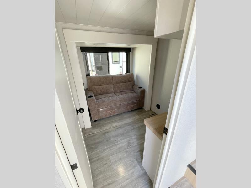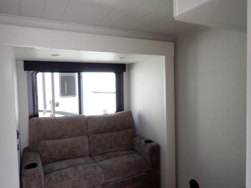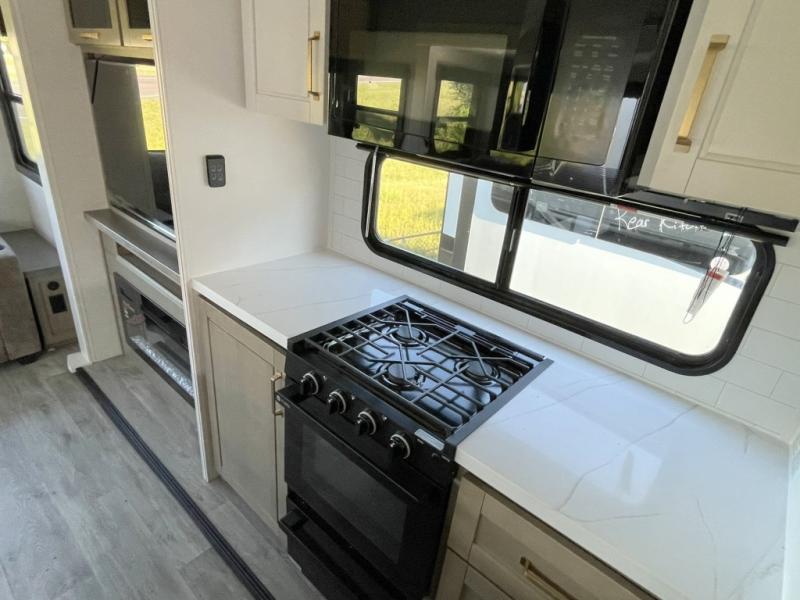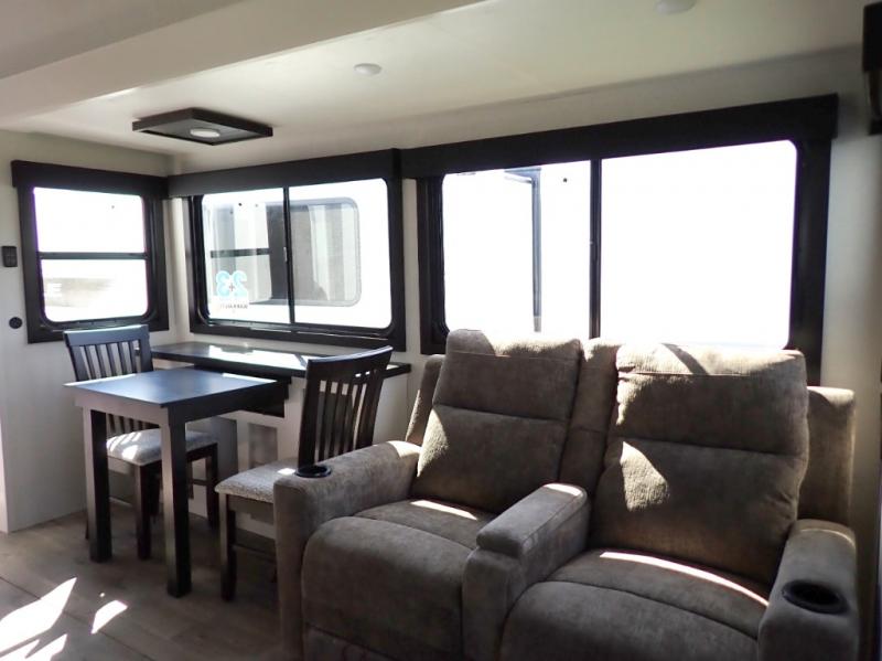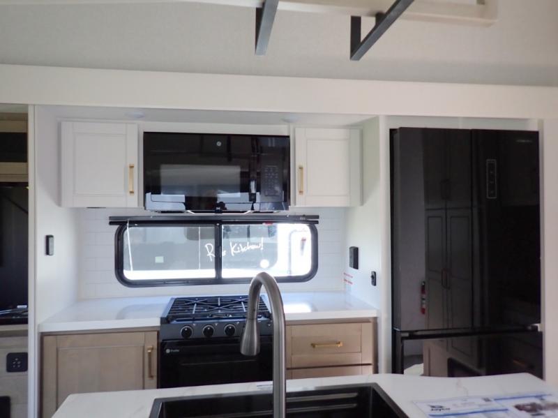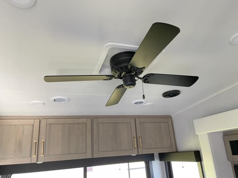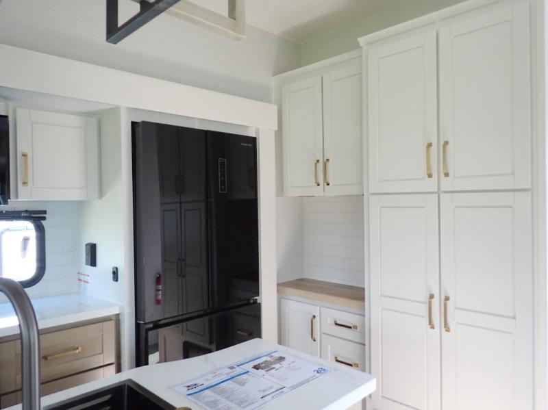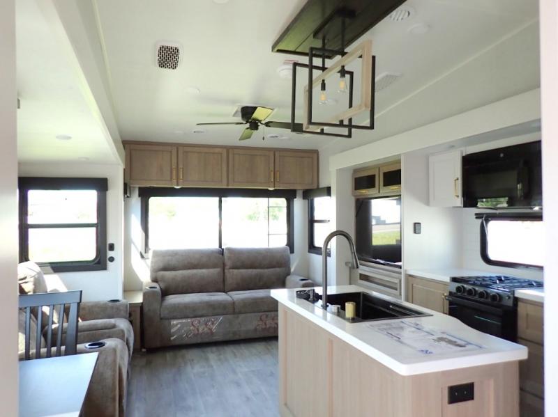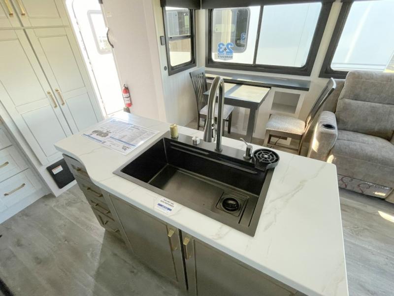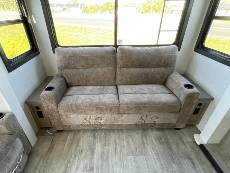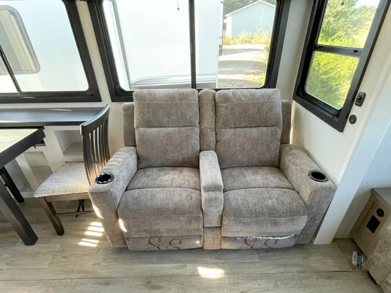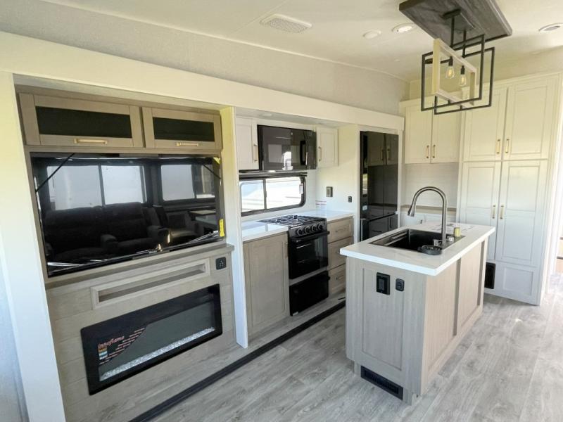 This fifth wheel with four slides is one your whole crew will love! There is a middle bedroom/den with a tri-fold sofa and a desk, allowing this room to become an office if you need it. The loft above this room will be a big hit with the little ones, and the full bath is centrally located so everyone can use it easily. You will have the front private bedroom all to yourselves with a king bed slide out, a chest with TV prep, plus washer and dryer prep in the walk-in closet. The main living area includes everything you need to relax in comfort, like the theater seats, tri-fold sofa, and entertainment center with a fireplace. The chef will enjoy the extra counter space provided by the kitchen island, and there is plenty of storage with the pantry, hutch, and 16 cu. ft. 12V refrigerator. This model even has an outside kitchen, two power awnings, and outside storage for all your gear!