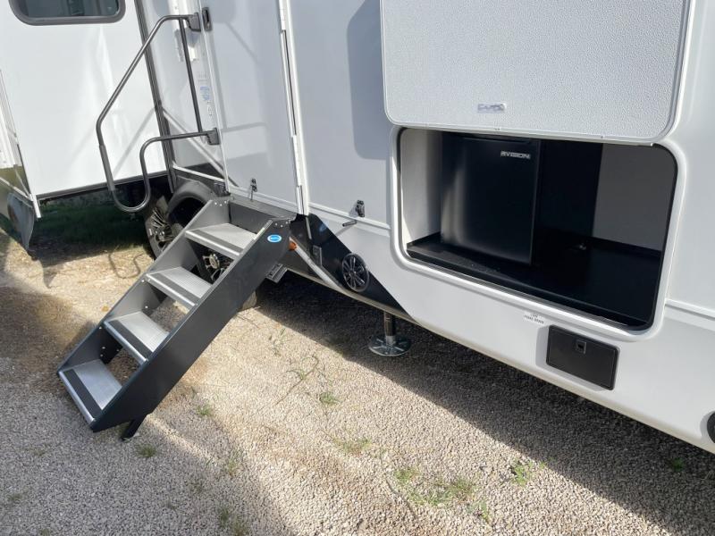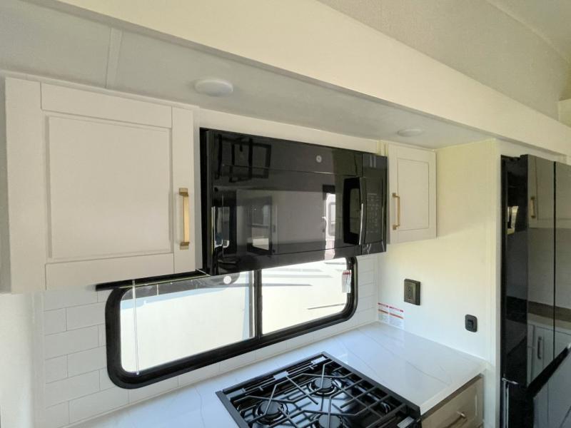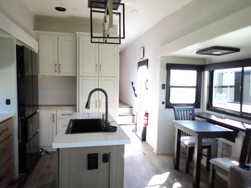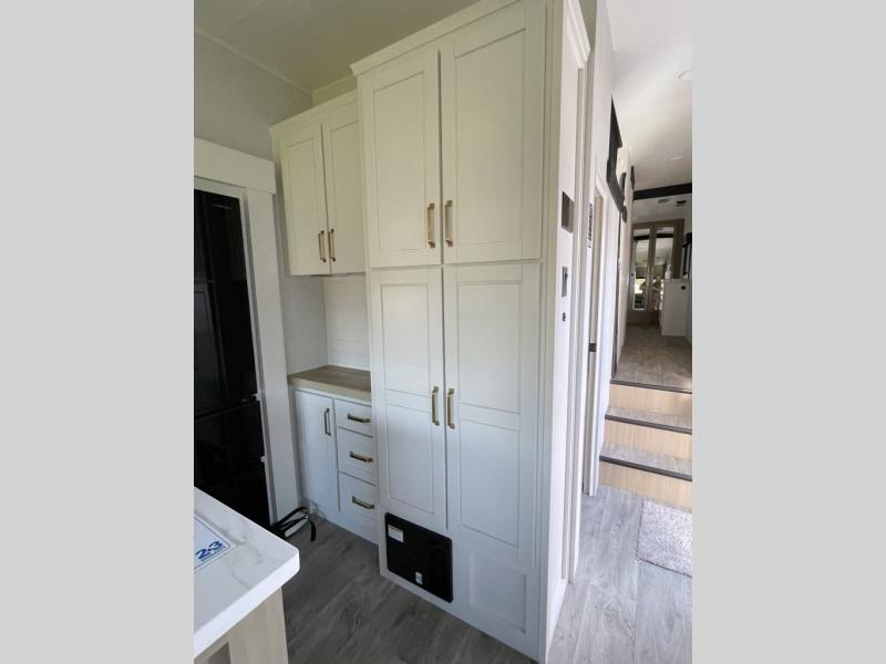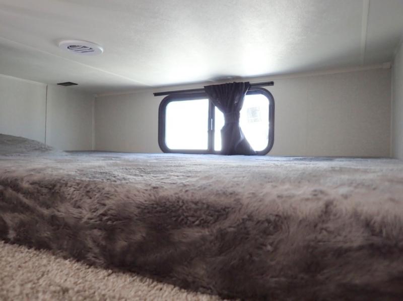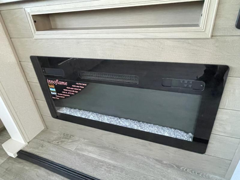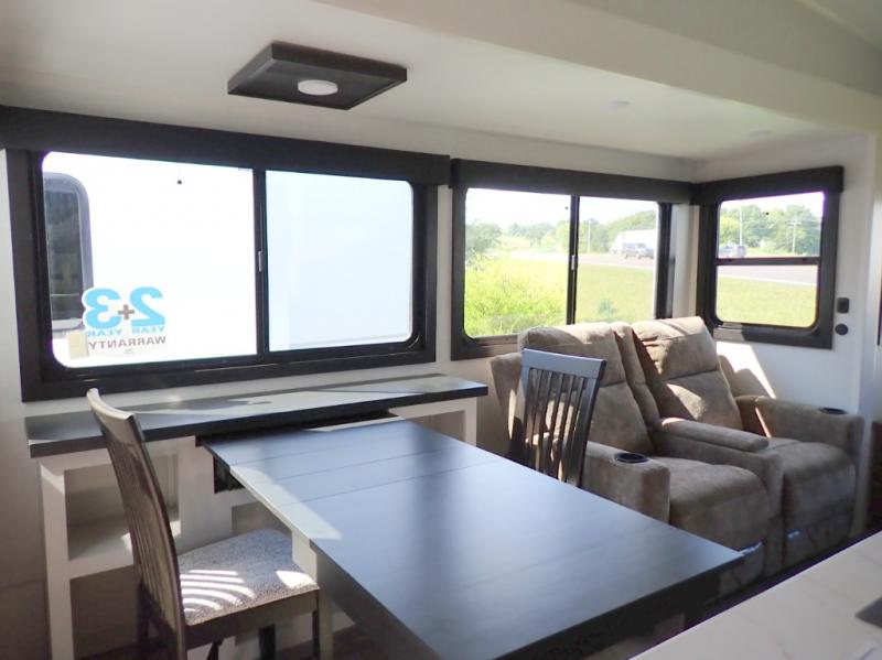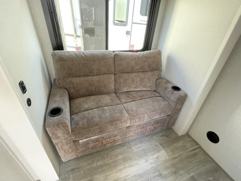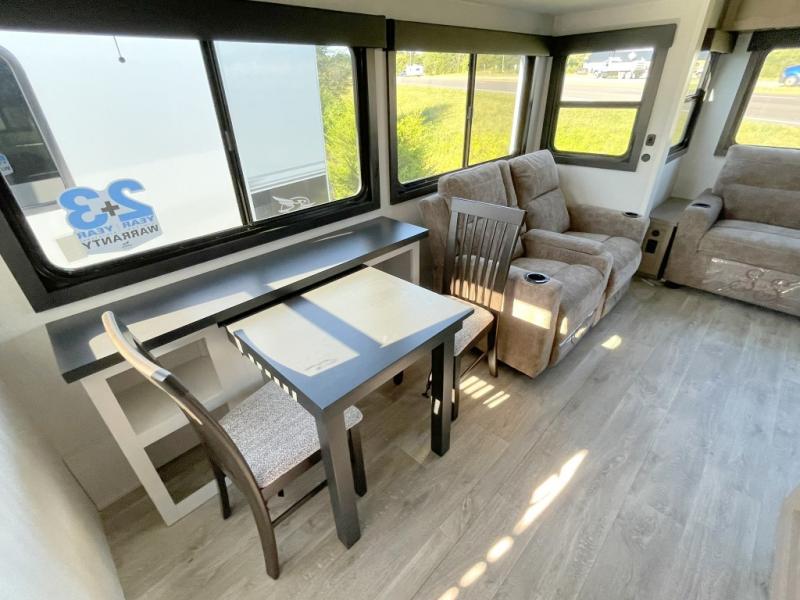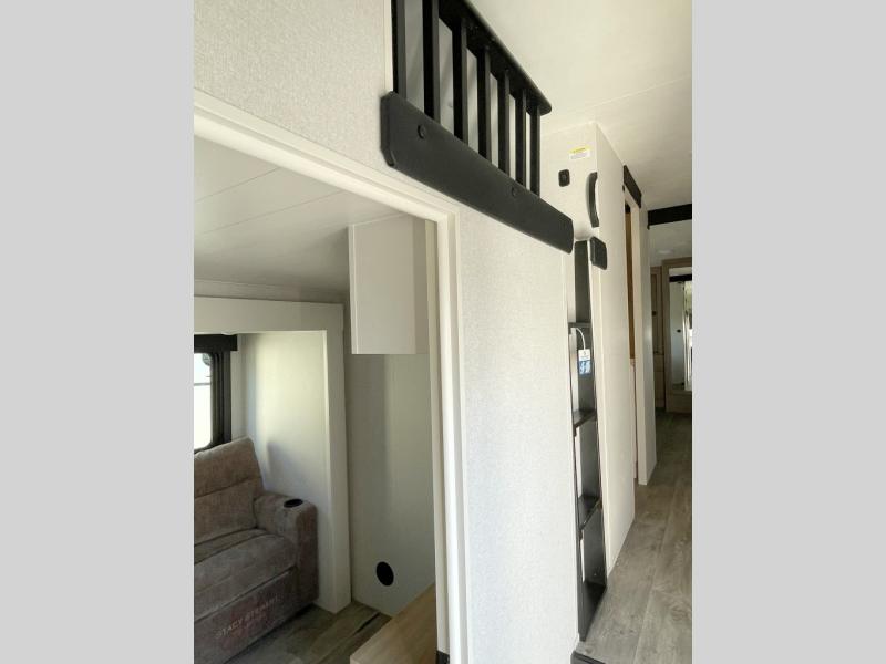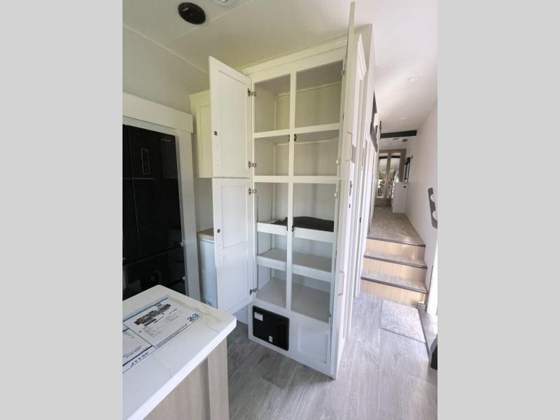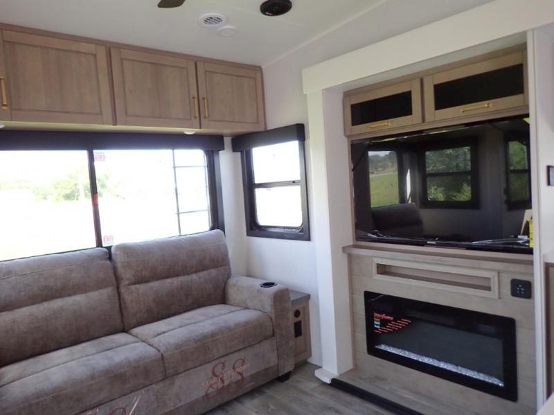 This fifth wheel with four slides is one your whole crew will love! There is a middle bedroom/den with a tri-fold sofa and a desk, allowing this room to become an office if you need it. The loft above this room will be a big hit with the little ones, and the full bath is centrally located so everyone can use it easily. You will have the front private bedroom all to yourselves with a king bed slide out, a chest with TV prep, plus washer and dryer prep in the walk-in closet. The main living area includes everything you need to relax in comfort, like the theater seats, tri-fold sofa, and entertainment center with a fireplace. The chef will enjoy the extra counter space provided by the kitchen island, and there is plenty of storage with the pantry, hutch, and 16 cu. ft. 12V refrigerator. This model even has an outside kitchen, two power awnings, and outside storage for all your gear!