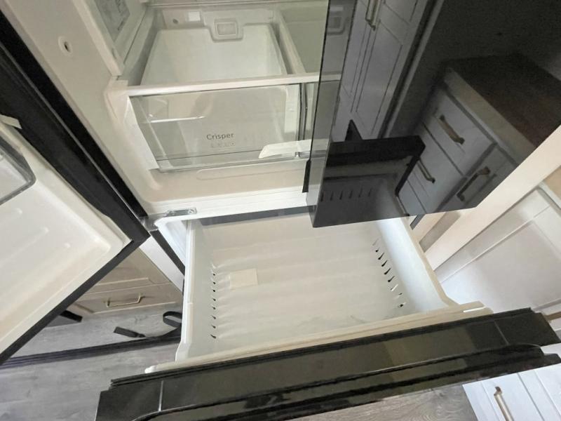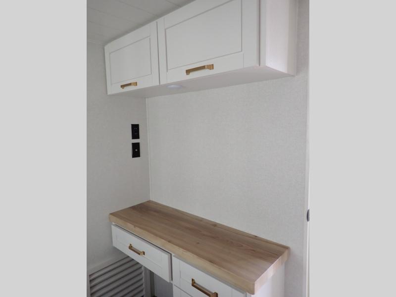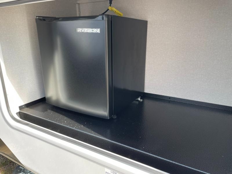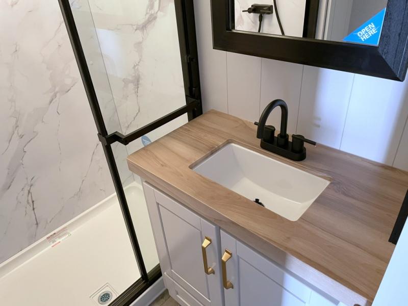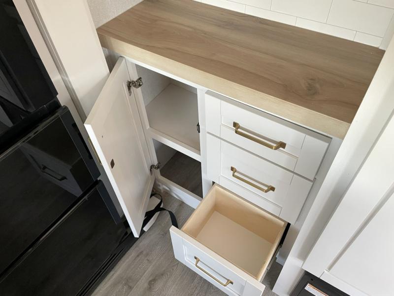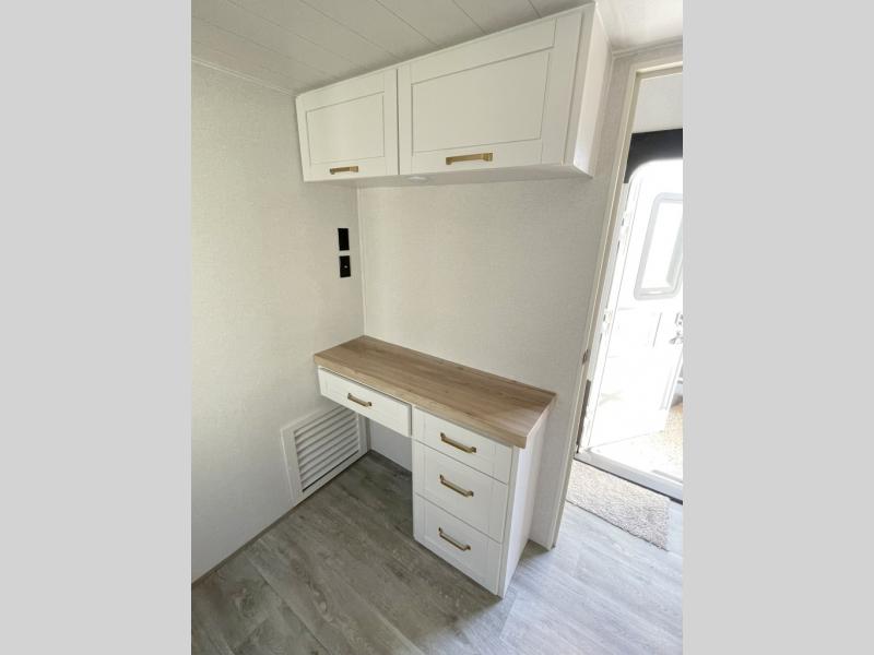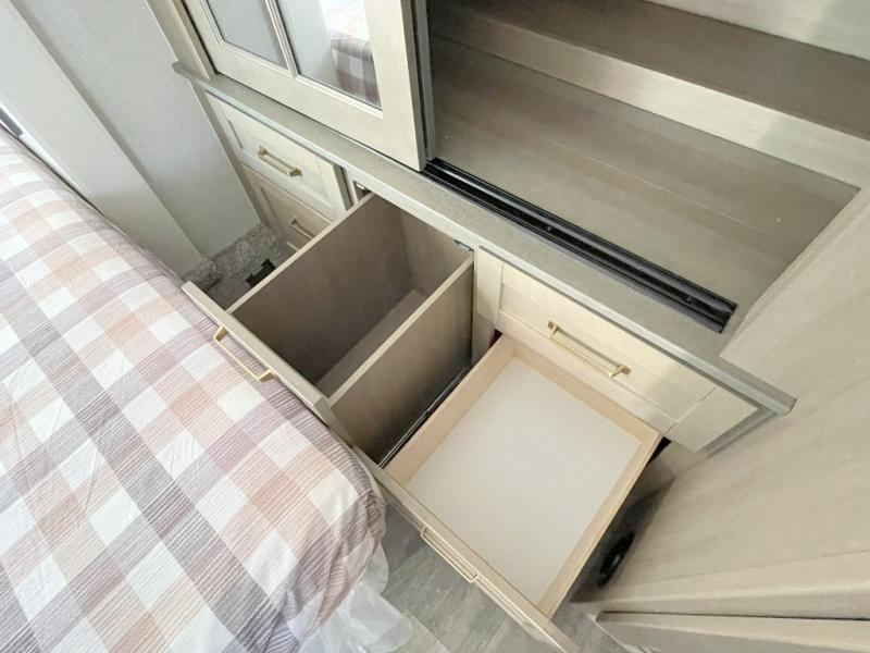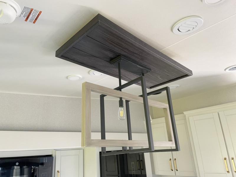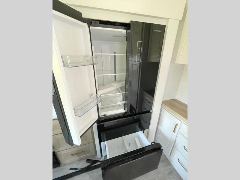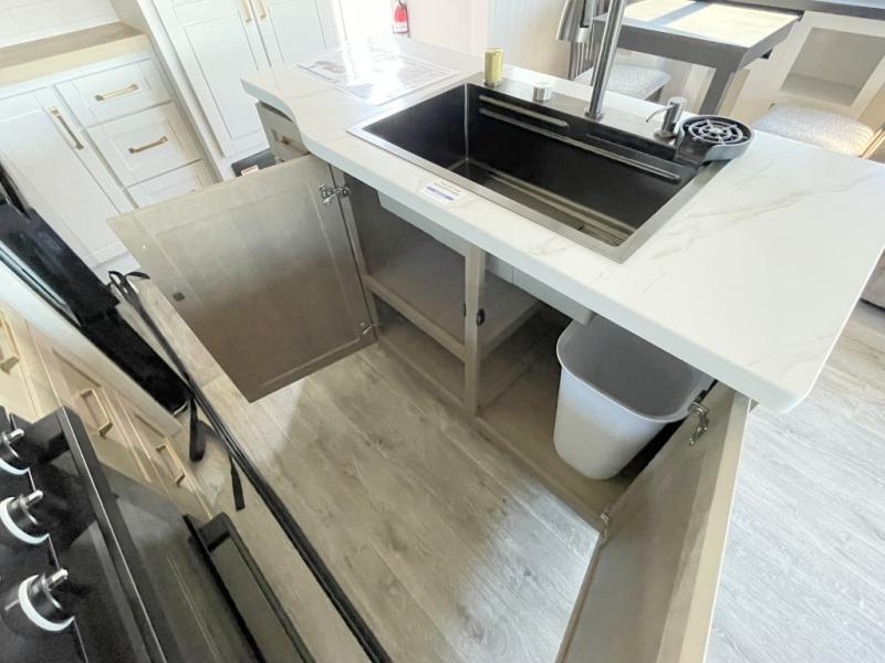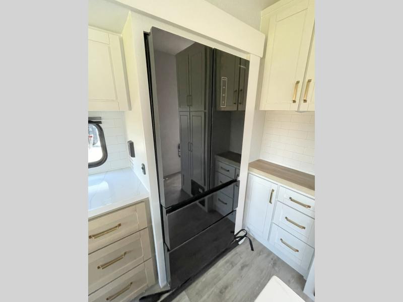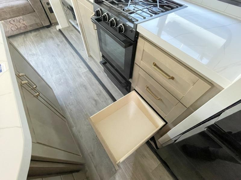 This fifth wheel with four slides is one your whole crew will love! There is a middle bedroom/den with a tri-fold sofa and a desk, allowing this room to become an office if you need it. The loft above this room will be a big hit with the little ones, and the full bath is centrally located so everyone can use it easily. You will have the front private bedroom all to yourselves with a king bed slide out, a chest with TV prep, plus washer and dryer prep in the walk-in closet. The main living area includes everything you need to relax in comfort, like the theater seats, tri-fold sofa, and entertainment center with a fireplace. The chef will enjoy the extra counter space provided by the kitchen island, and there is plenty of storage with the pantry, hutch, and 16 cu. ft. 12V refrigerator. This model even has an outside kitchen, two power awnings, and outside storage for all your gear!