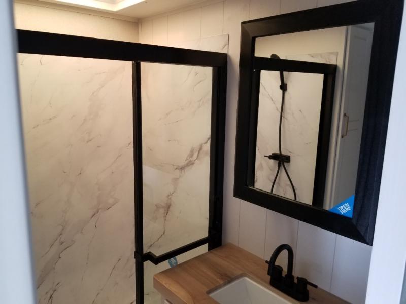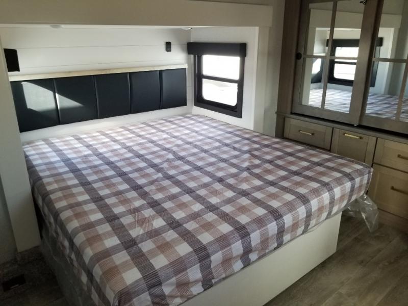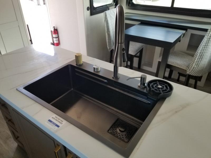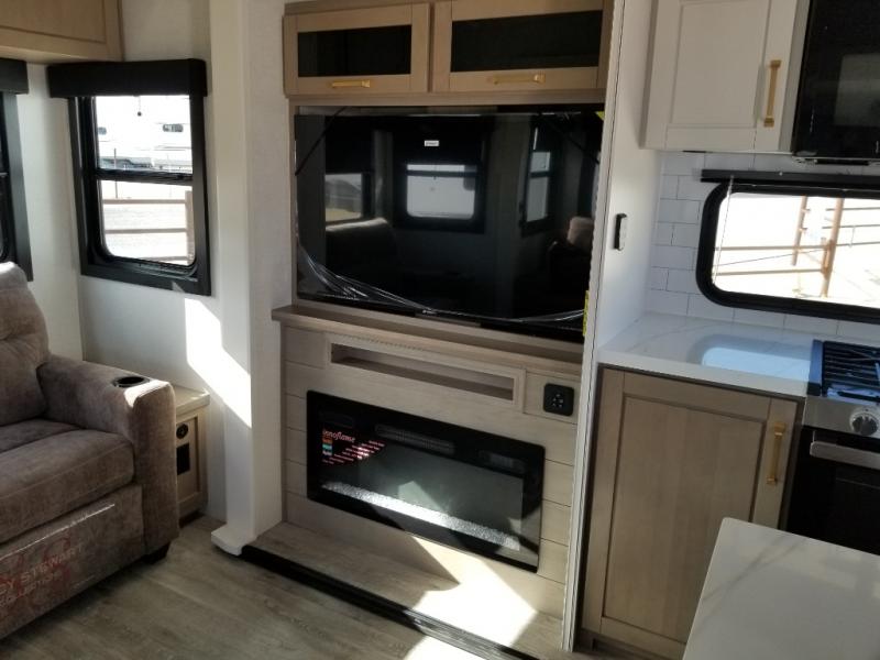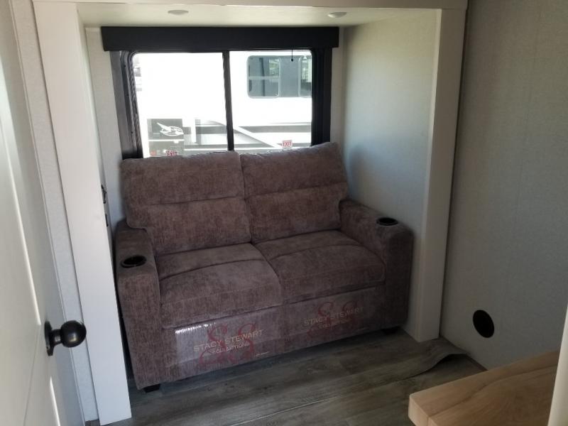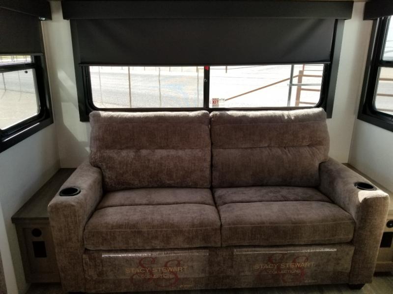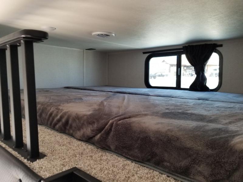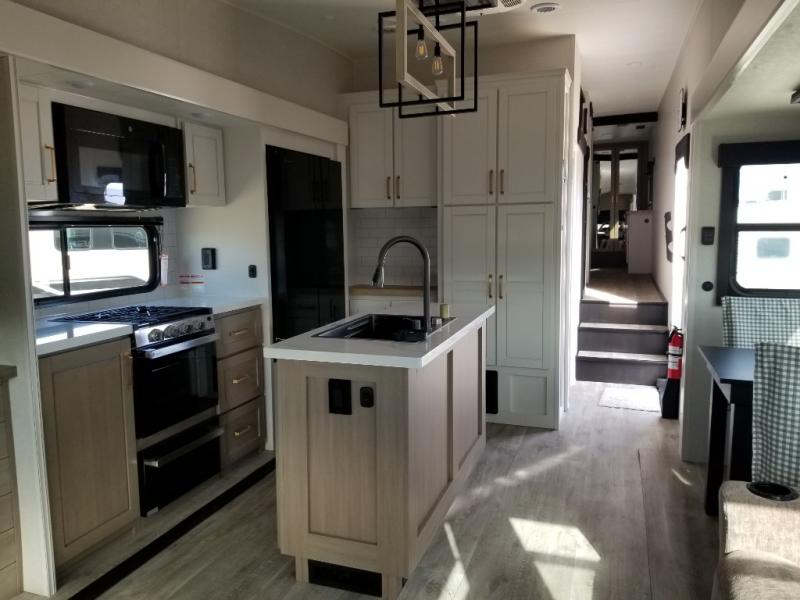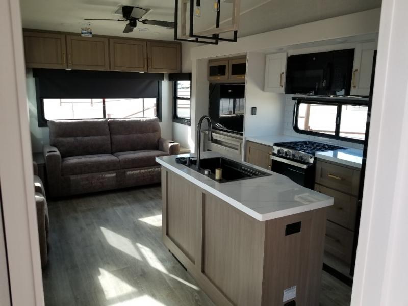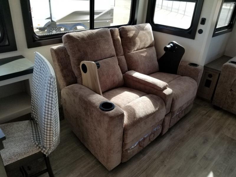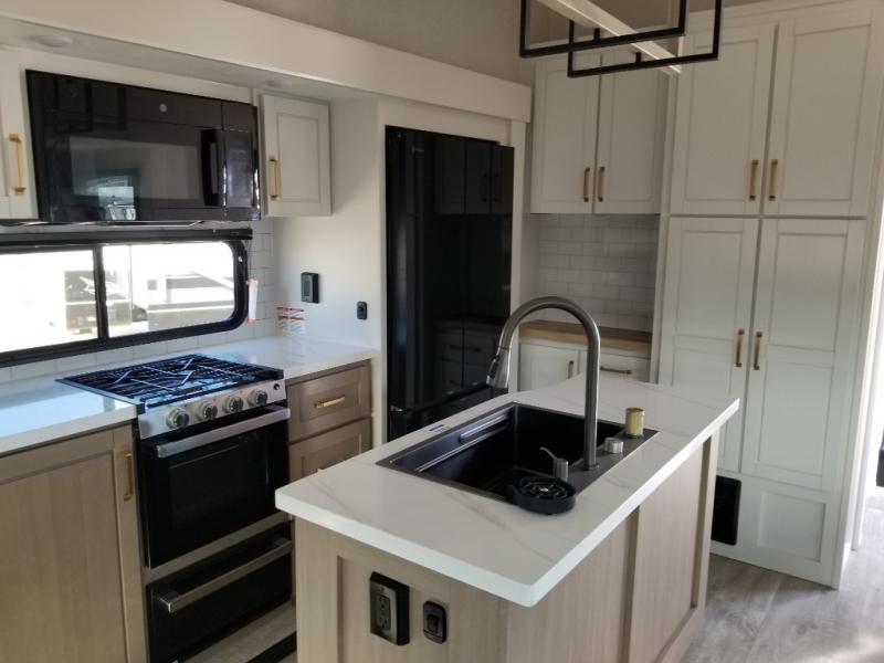This fifth wheel with four slides is one your whole crew will love! There is a middle bedroom/den with a tri-fold sofa and a desk, allowing this room to become an office if you need it. The loft above this room will be a big hit with the little ones, and the full bath is centrally located so everyone can use it easily. You will have the front private bedroom all to yourselves with a king bed slide out, a chest with TV prep, plus washer and dryer prep in the walk-in closet. The main living area includes everything you need to relax in comfort, like the theater seats, tri-fold sofa, and entertainment center with a fireplace. The chef will enjoy the extra counter space provided by the kitchen island, and there is plenty of storage with the pantry, hutch, and 16 cu. ft. 12V refrigerator. This model even has an outside kitchen, two power awnings, and outside storage for all your gear!