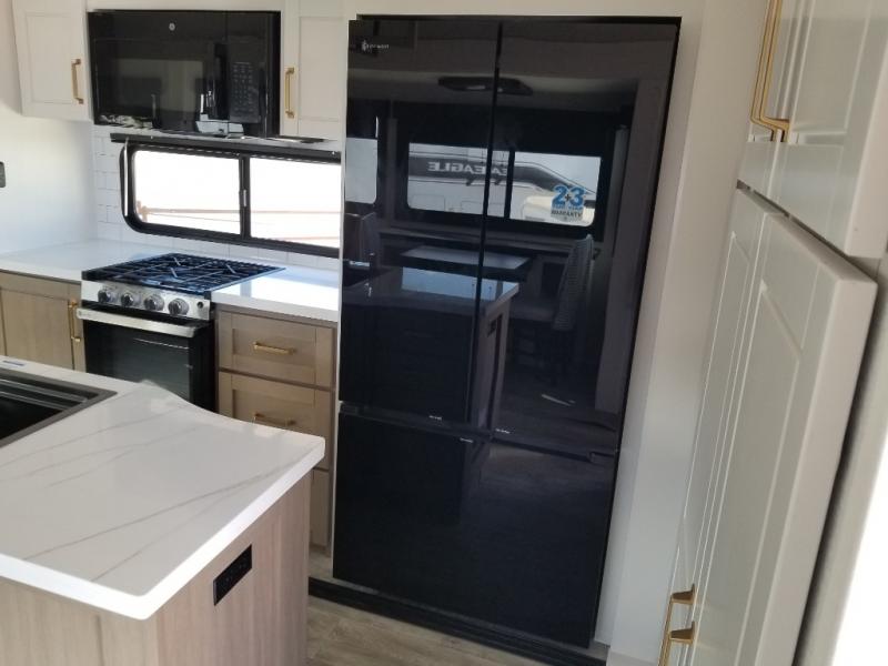 With any Eagle fifth wheel by Jayco you will appreciate durable construction materials, like the Magnum Truss Roof and the Stronghold VBL laminated walls. The JAYCOMMAND Smart RV system puts you in control of your RV's functions, and the 5 Star Handling Package will provide smooth towing from home to camp. Each model features Climate Shield zero-degree tested weather protection and the industry-exclusive HELIX cooling system that features two 15,000 BTU Whisper Quiet A/C's to keep you comfortable year around. Some of the exterior conveniences you are sure to love are the pass-through storage with Slam-Latch baggage doors and an automotive style front cap with max turn radius. The Eagle fifth wheels are designed to make you feel at home with solid hardwood slide fascia, residential vinyl flooring throughout, 100% no floor vents, and blackout roller shades with reflective side throughout for added privacy and insulation.