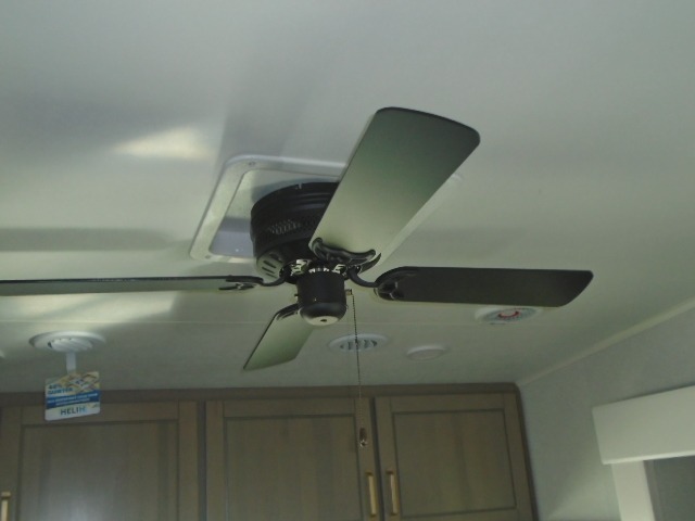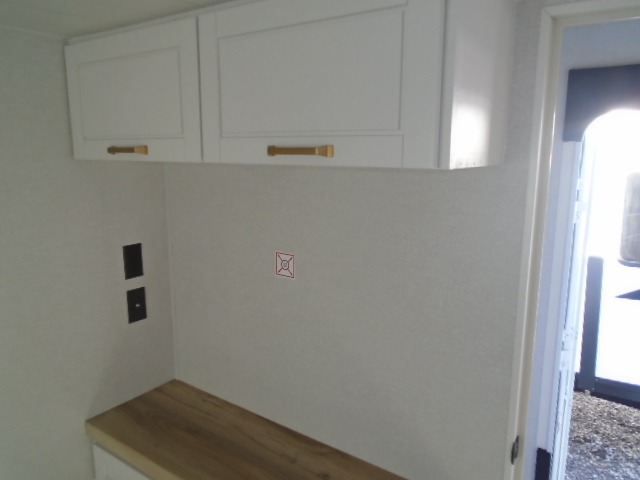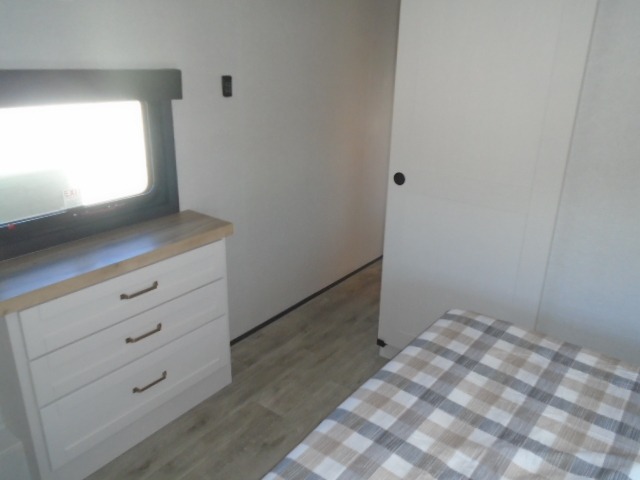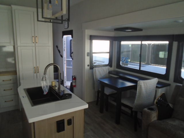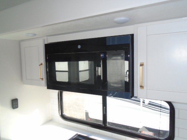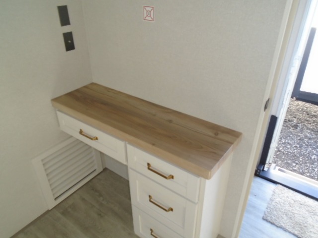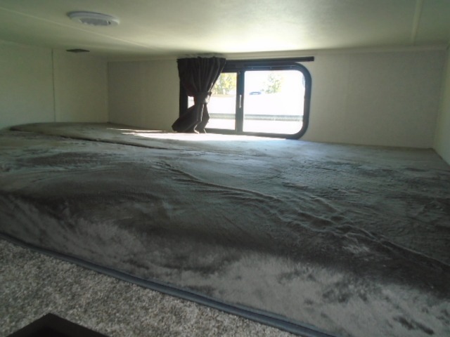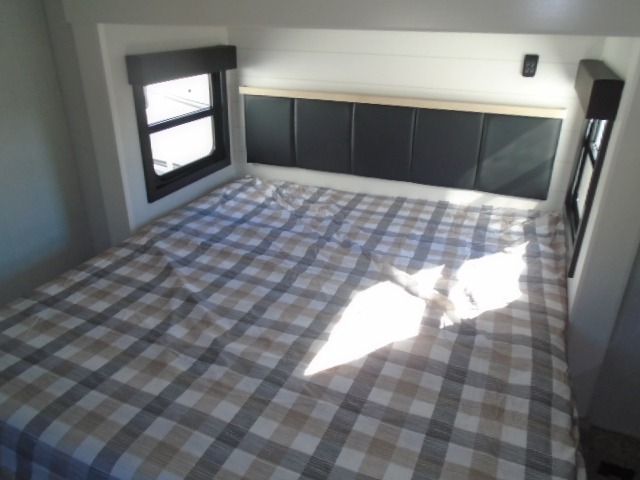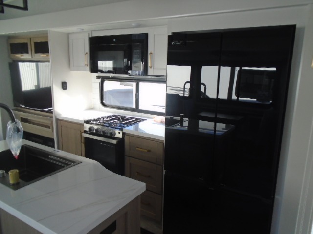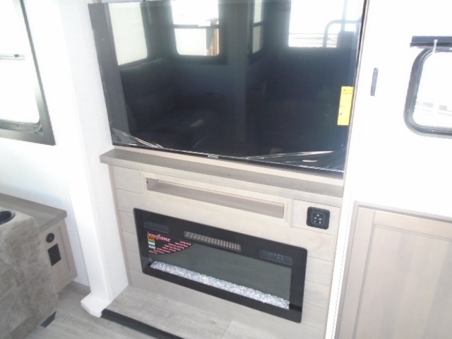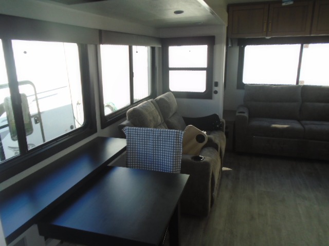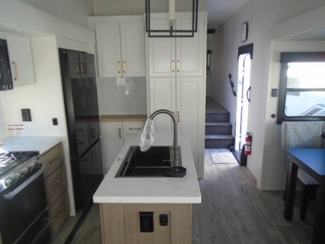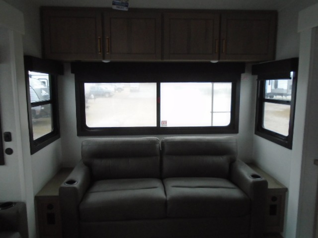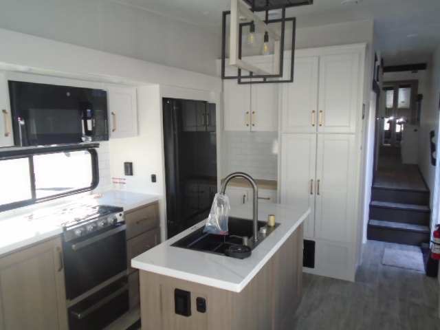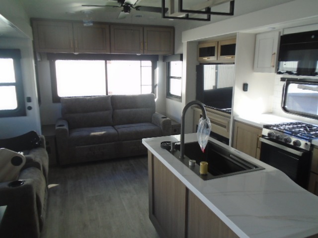 This fifth wheel with four slides is one your whole crew will love! There is a middle bedroom/den with a tri-fold sofa and a desk, allowing this room to become an office if you need it. The loft above this room will be a big hit with the little ones, and the full bath is centrally located so everyone can use it easily. You will have the front private bedroom all to yourselves with a king bed slide out, a chest with TV prep, plus washer and dryer prep in the front closet. The main living area includes everything you need to relax in comfort, like the theater seat, tri-fold sofa, and entertainment center with a fireplace. The chef will enjoy the extra counter space provided by the kitchen island, and there is plenty of storage with the pantry, hutch, and 16 cu. ft. 12V refrigerator. This model even has an outside kitchen, two power awnings, and outside storage for all your gear!
