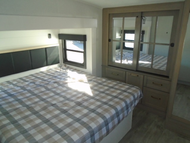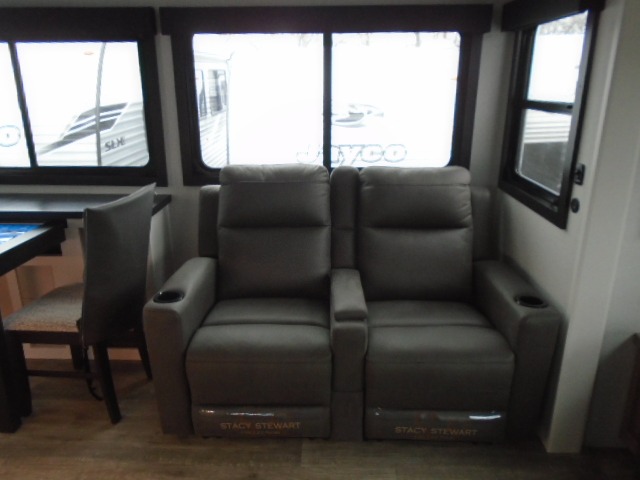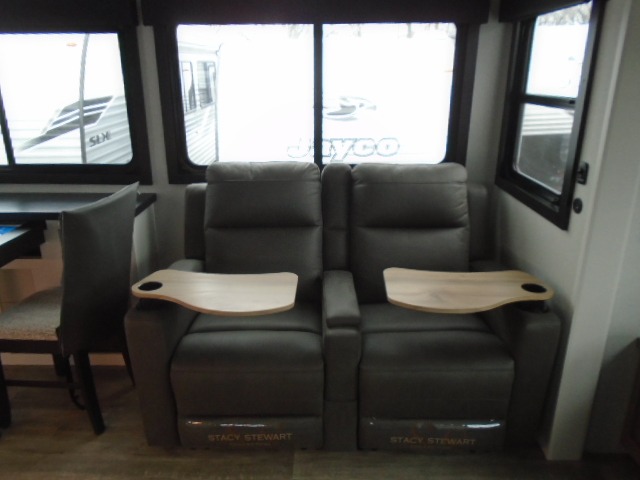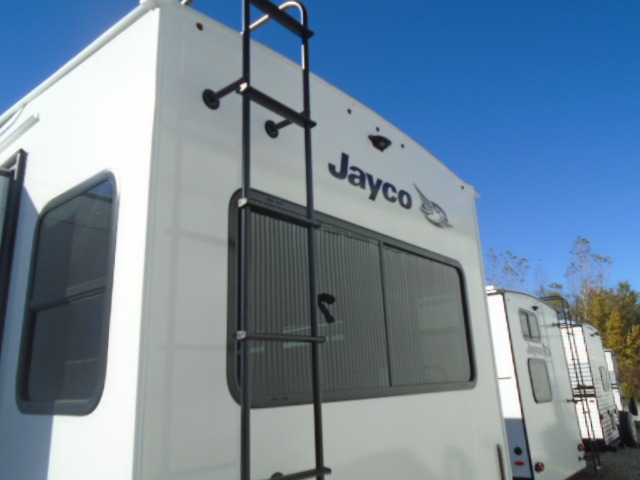 With any Eagle fifth wheel by Jayco you will appreciate durable construction materials, like the Magnum Truss Roof and the Stronghold VBL laminated walls. The JAYCOMMAND Smart RV system puts you in control of your RV's functions, and the 4 Star Handling Package will provide smooth towing from home to camp. Each model features Climate Shield zero-degree tested weather protection and the industry-exclusive HELIX cooling system that features two 15,000 BTU Whisper Quiet A/C's to keep you comfortable during those colder months. Some of the exterior conveniences you are sure to love are the pass-through storage with Slam-Latch baggage doors and an automotive style front cap with max turn radius. The Eagle fifth wheels are designed to make you feel at home with solid surface countertops, residential vinyl flooring throughout, 100% no floor vents, and blackout roller shades with reflective side throughout for added privacy and insulation.