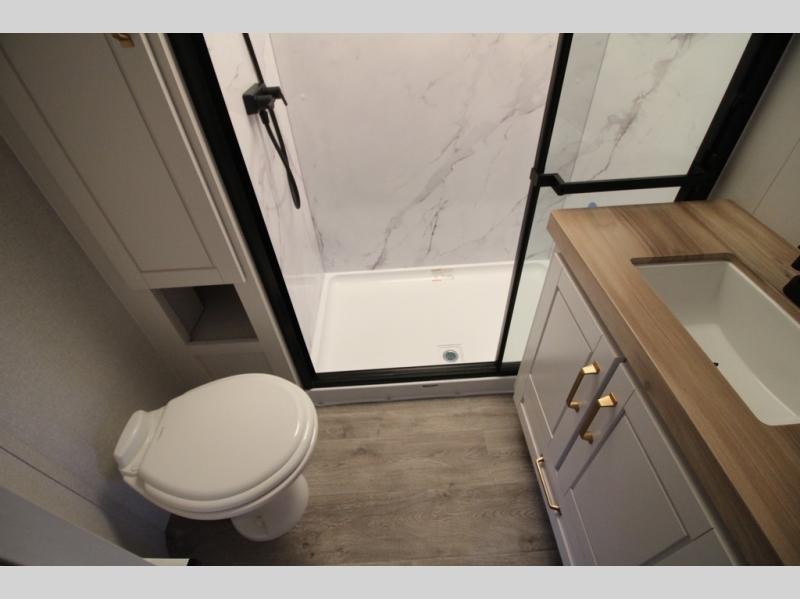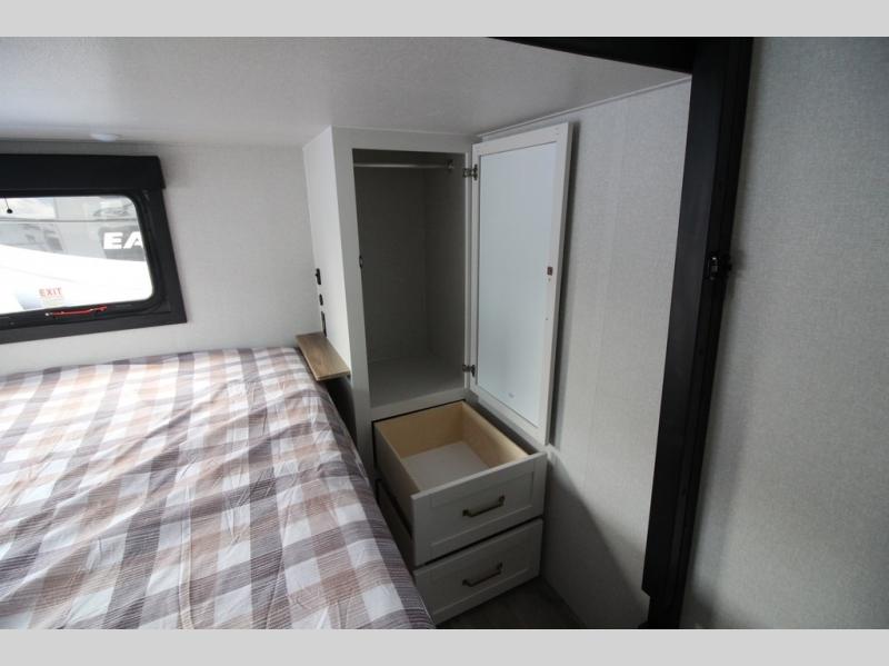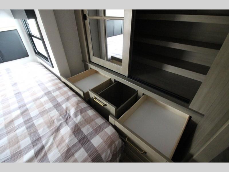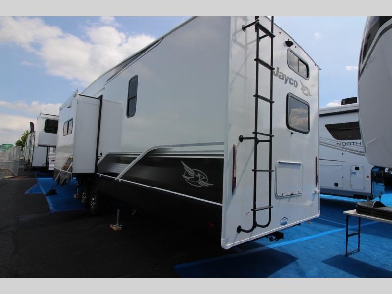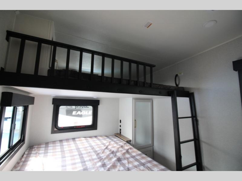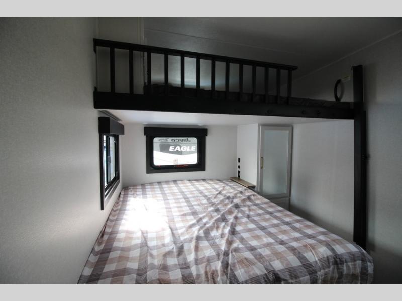 With any Eagle fifth wheel by Jayco you will appreciate durable construction materials, like the Magnum Truss Roof and the Stronghold VBL laminated walls. The JAYCOMMAND Smart RV system puts you in control of your RV's functions, and the 5 Star Handling Package will provide smooth towing from home to camp. Each model features Climate Shield zero-degree tested weather protection and the industry-exclusive HELIX cooling system that features two 15,000 BTU Whisper Quiet A/C's to keep you comfortable year around. Some of the exterior conveniences you are sure to love are the pass-through storage with Slam-Latch baggage doors and an automotive style front cap with max turn radius. The Eagle fifth wheels are designed to make you feel at home with solid hardwood slide fascia, residential vinyl flooring throughout, 100% no floor vents, and blackout roller shades with reflective side throughout for added privacy and insulation.