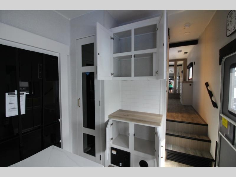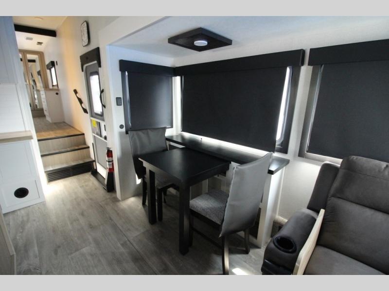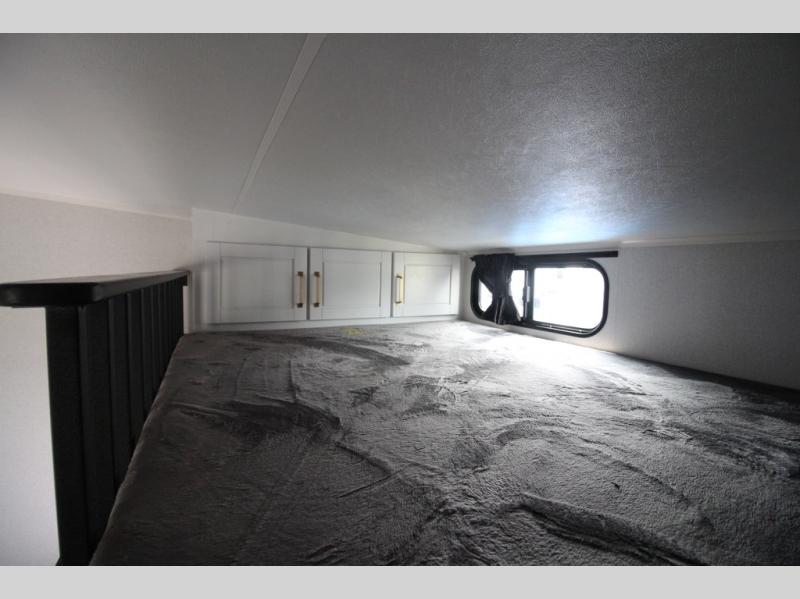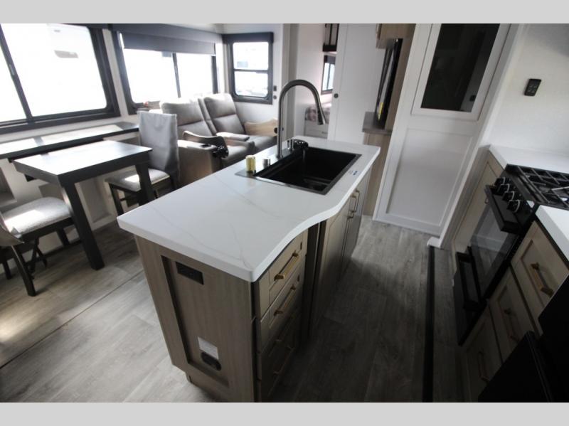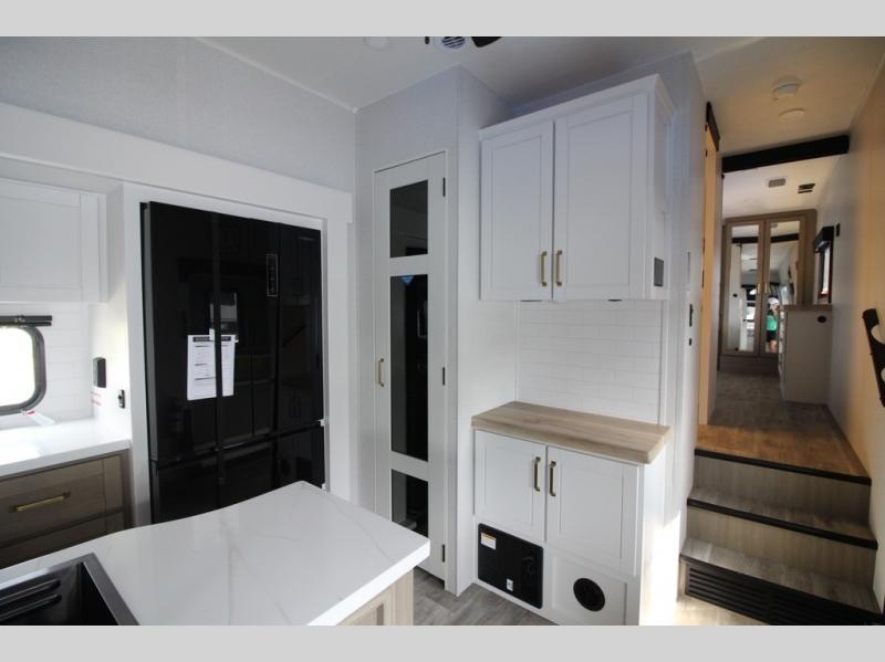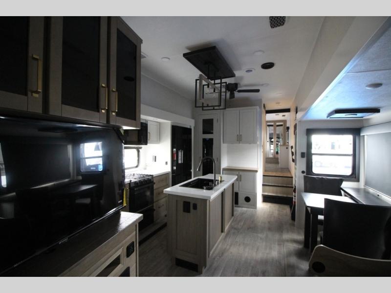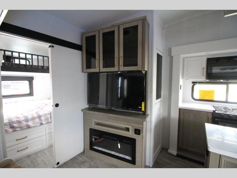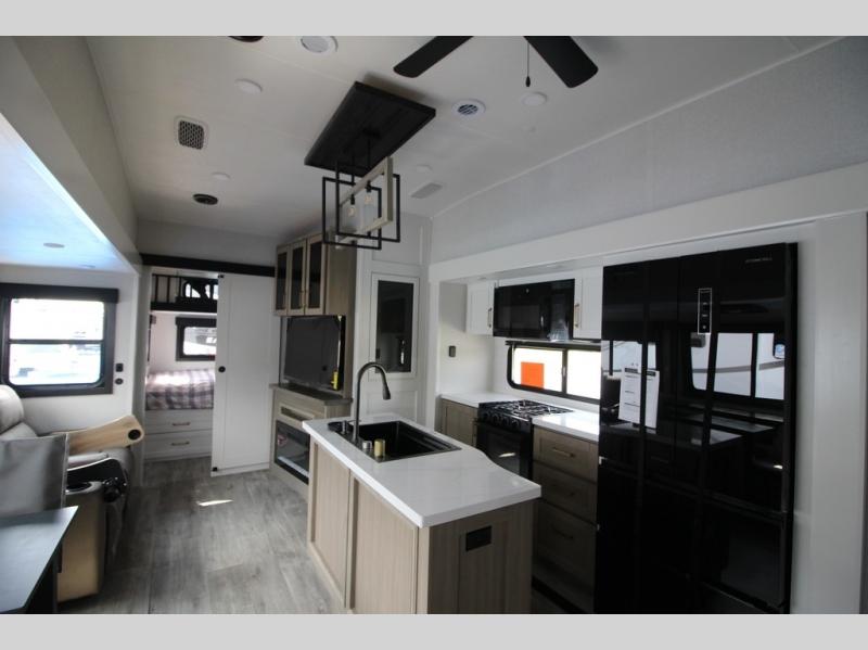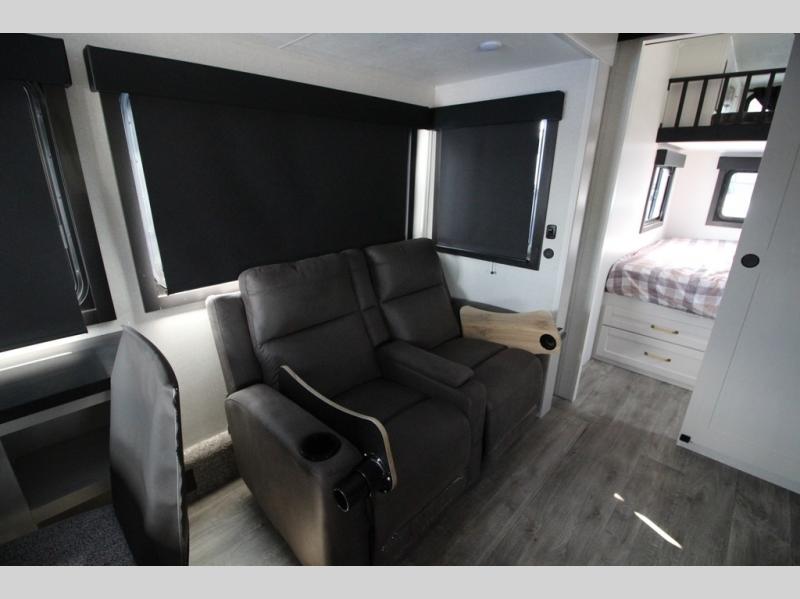 This fifth wheel is decked out in features you will love! The dual slides in the main living area create an open floorplan, and then there is a kitchen island that will make meal prepping easier. The theater seats plus table with chairs and a bench have a great view of the entertainment center and fireplace, and there is a ceiling fan here to keep the air moving. And did we mention there is an outside kitchen, complete with an outdoor refrigerator? This model also features a front private bedroom with a king bed slide out, a chest, and a front closet with convenient washer and dryer prep. There is also a rear private bunkhouse that has a 54" x 74" upper loft bed above a 66" x 80" Olympic bed with wardrobe storage drawers, as well as its very own half bathroom!