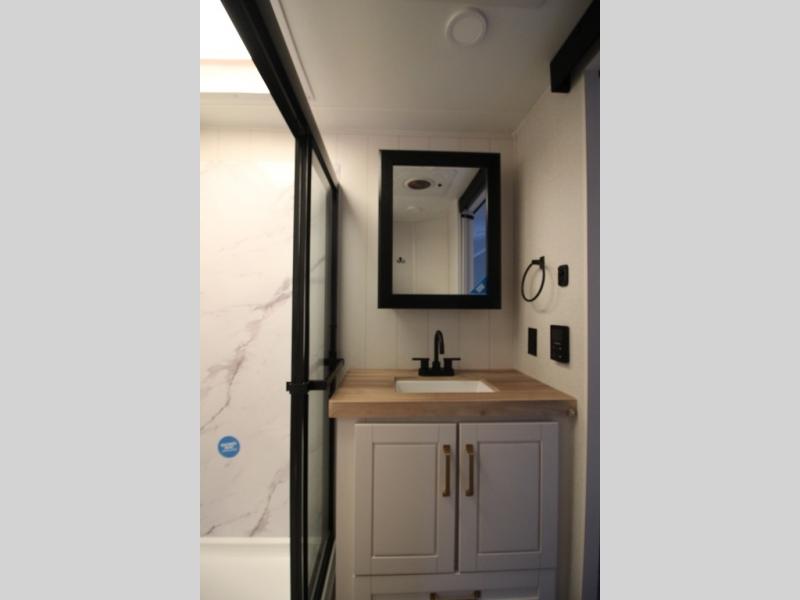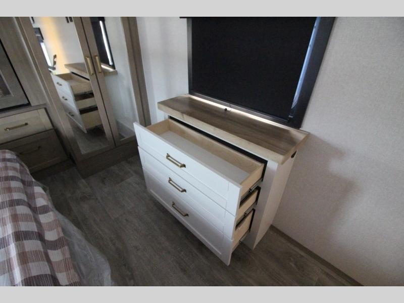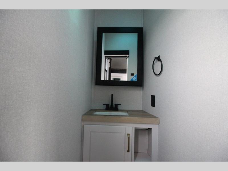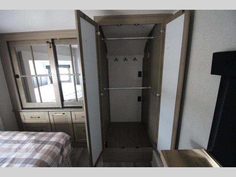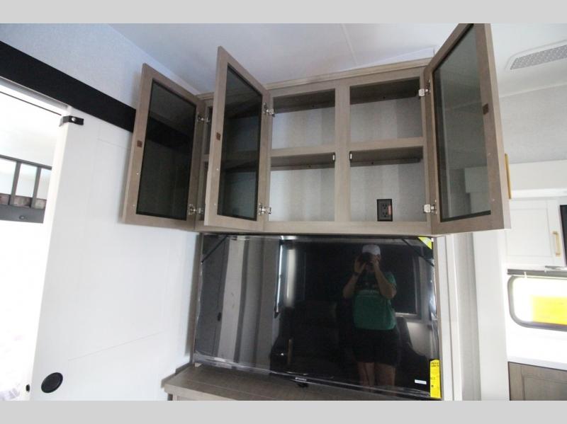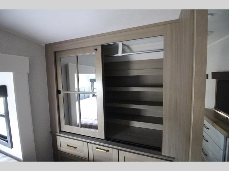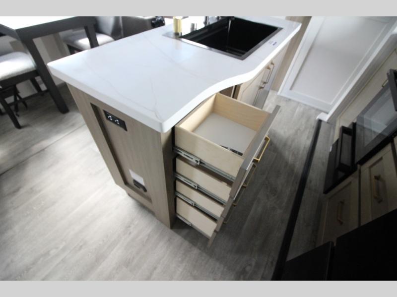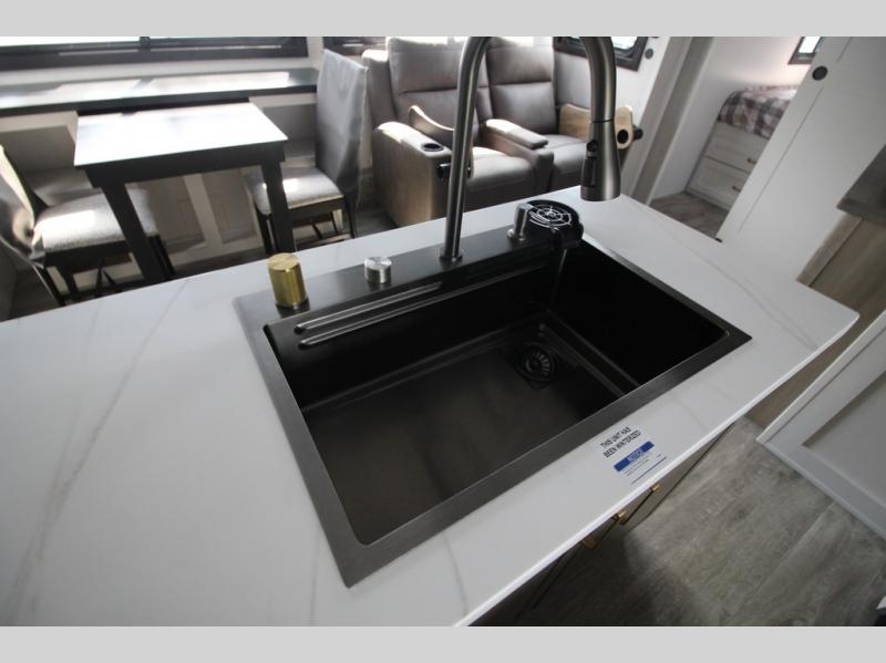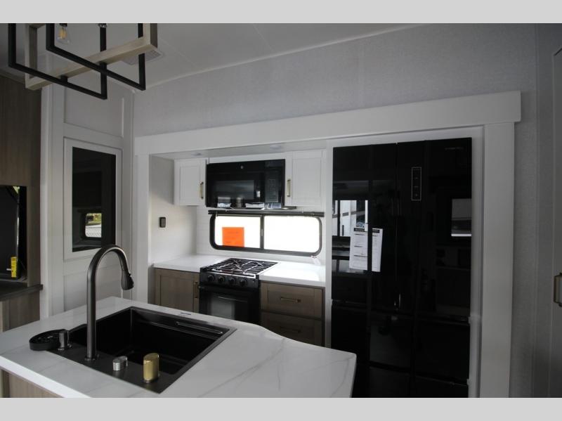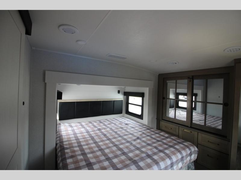 This fifth wheel is decked out in features you will love! The dual slides in the main living area create an open floorplan, and then there is a kitchen island that will make meal prepping easier. The theater seats plus table with chairs and a bench have a great view of the entertainment center and fireplace, and there is a ceiling fan here to keep the air moving. And did we mention there is an outside kitchen, complete with an outdoor refrigerator? This model also features a front private bedroom with a king bed slide out, a chest, and a front closet with convenient washer and dryer prep. There is also a rear private bunkhouse that has a 54" x 74" upper loft bed above a 66" x 80" Olympic bed with wardrobe storage drawers, as well as its very own half bathroom!